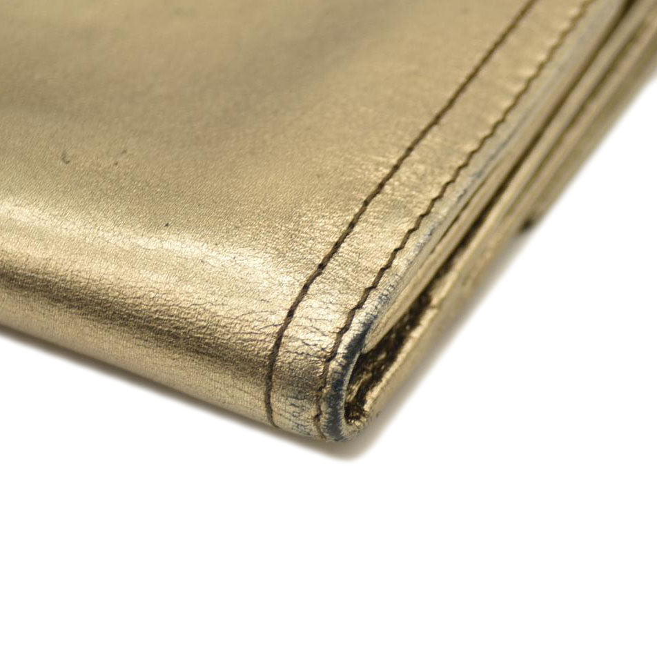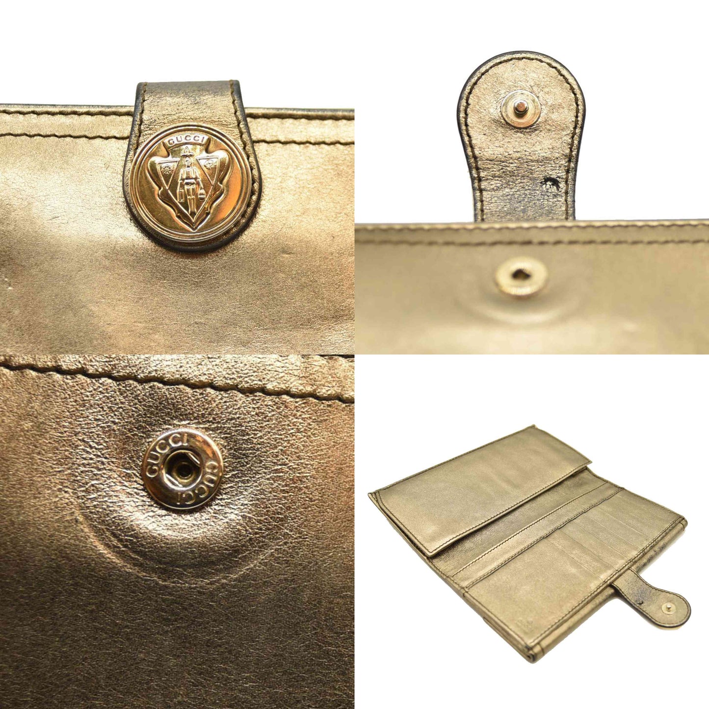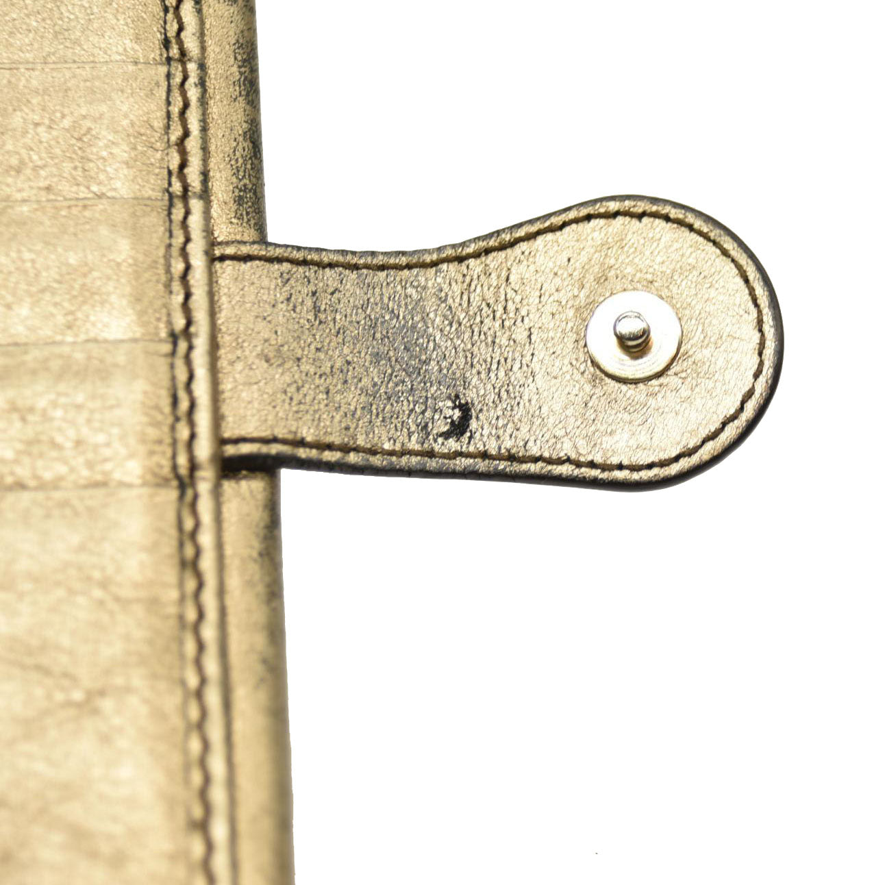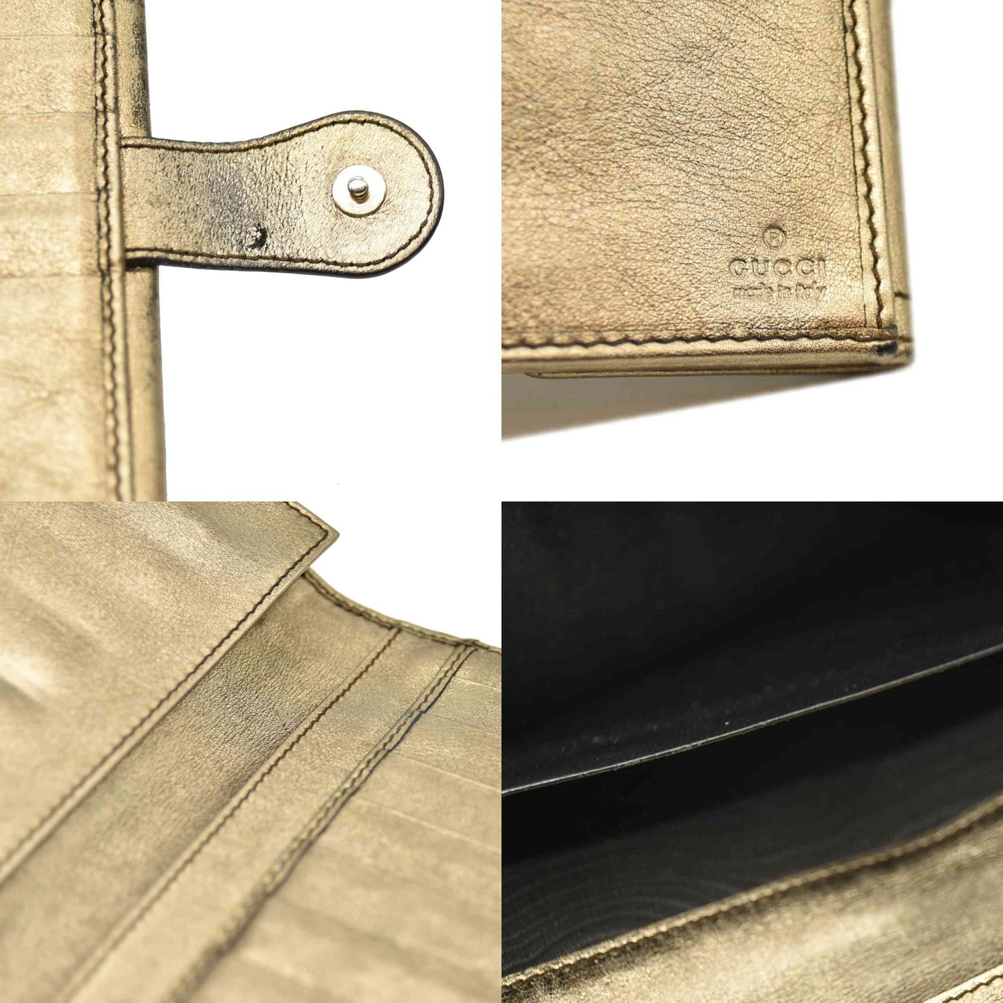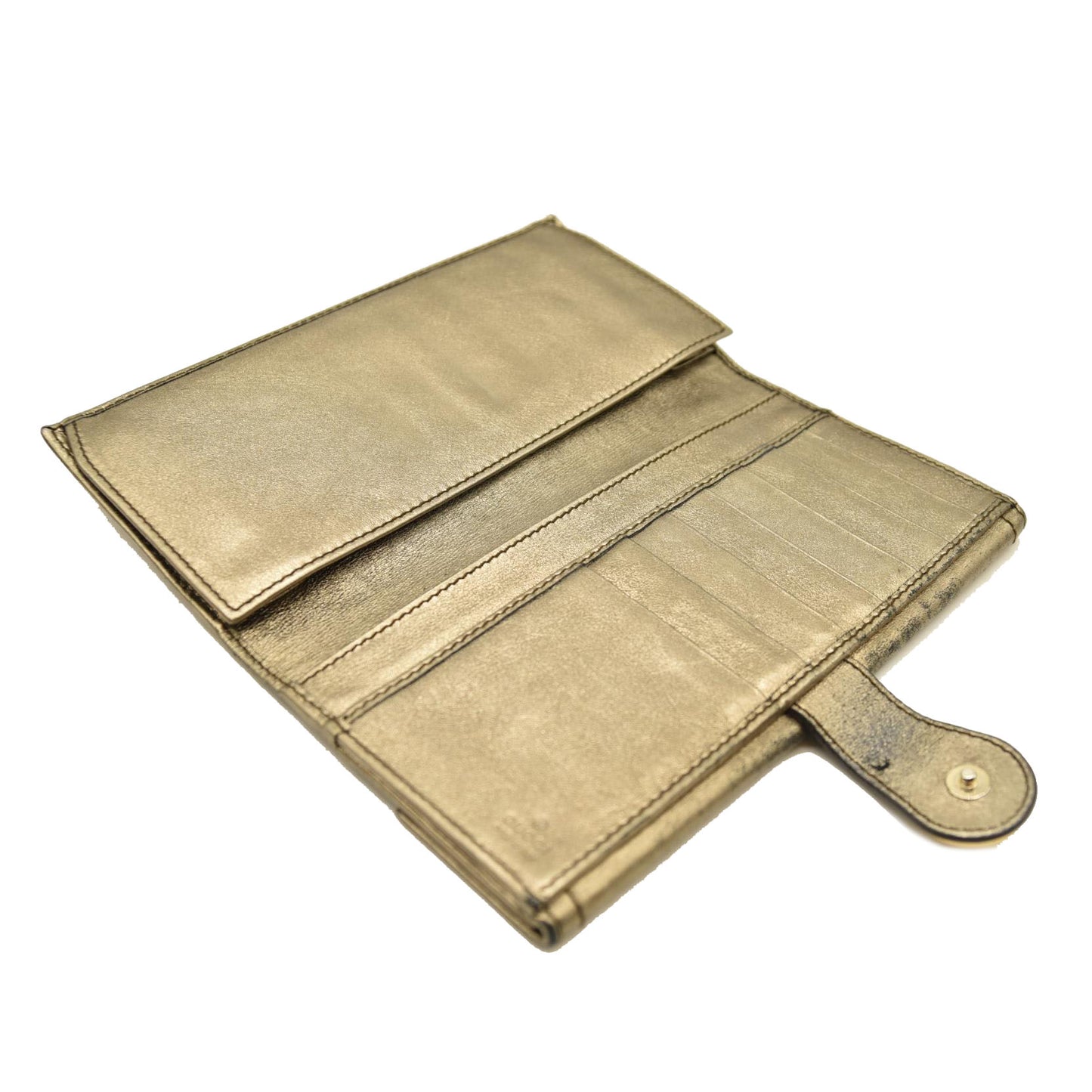 This is an authentic GUCCI Metallic Calfskin Hysteria Continental Wallet in Gold. This stylish wallet is finely crafted of gold patent leather with a frontal Gucci emblem on the cross over strap. This unsnaps to a chocolate brown leather interior with an accordion style dual compartment bill pocket, multiple credit card slots and patch pockets. The reverse flap unsnaps to a brown leather coin compartment. This is a beautiful wallet for all of your everyday needs, from Gucci!