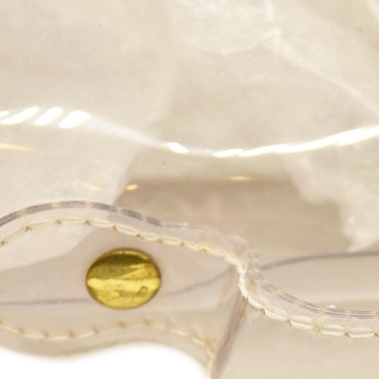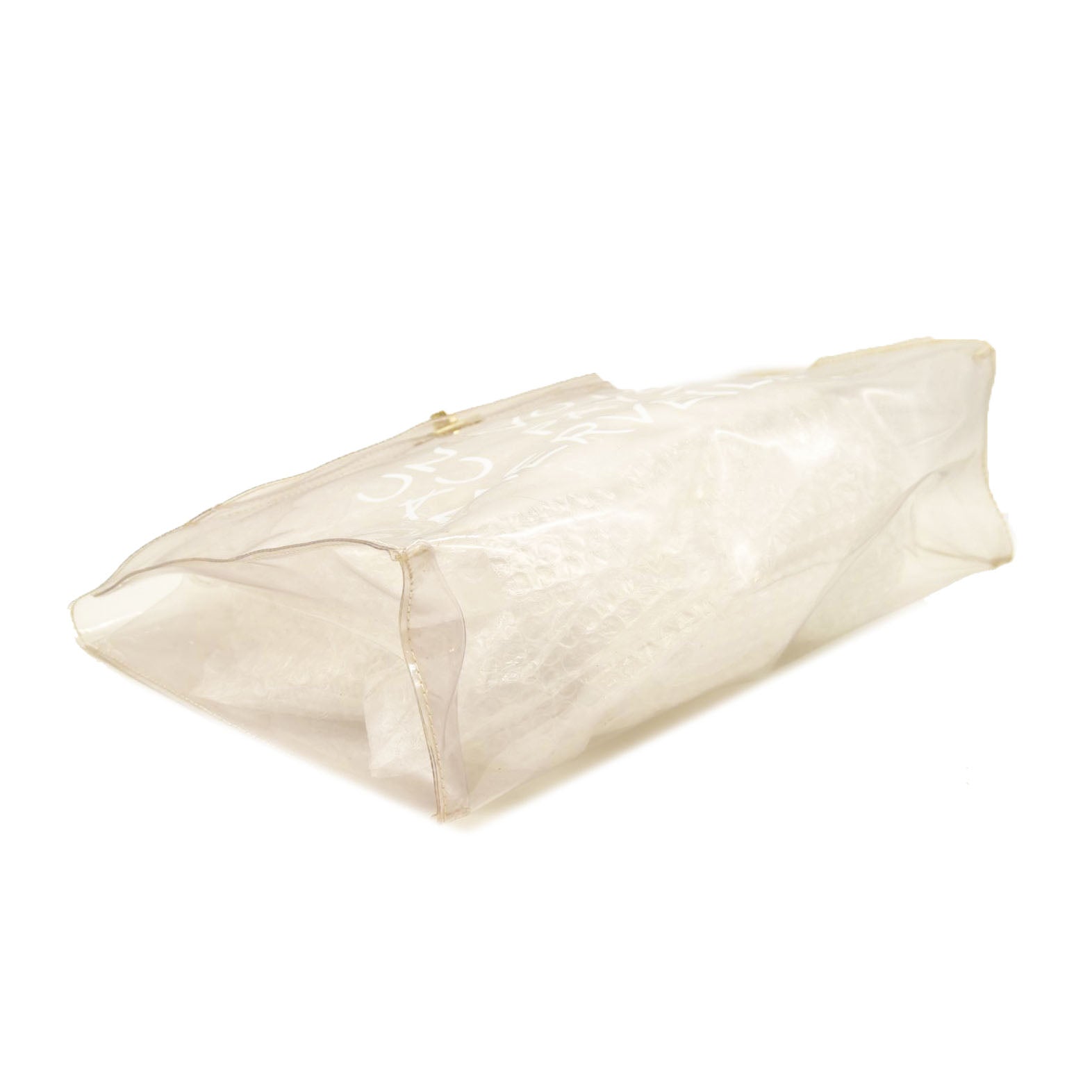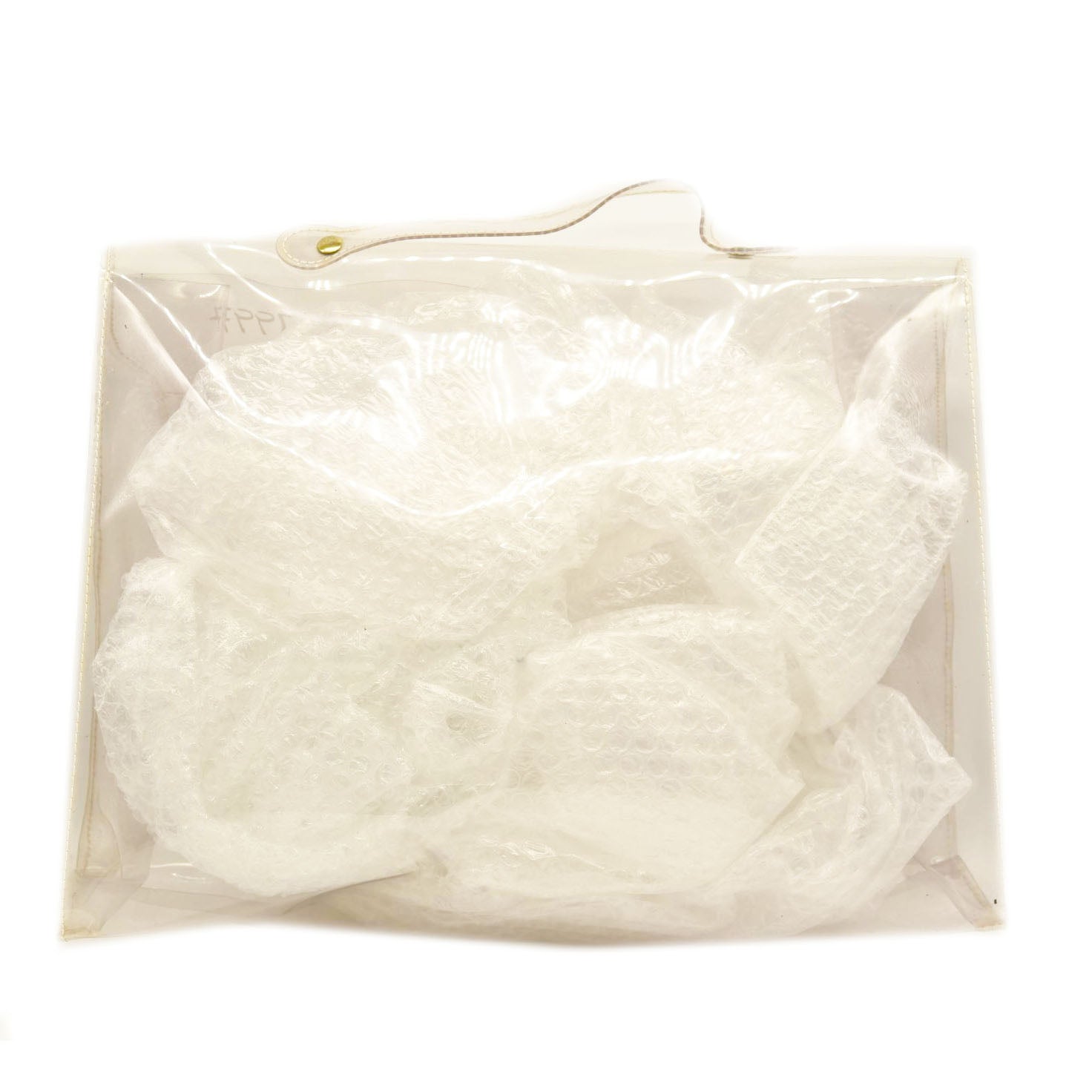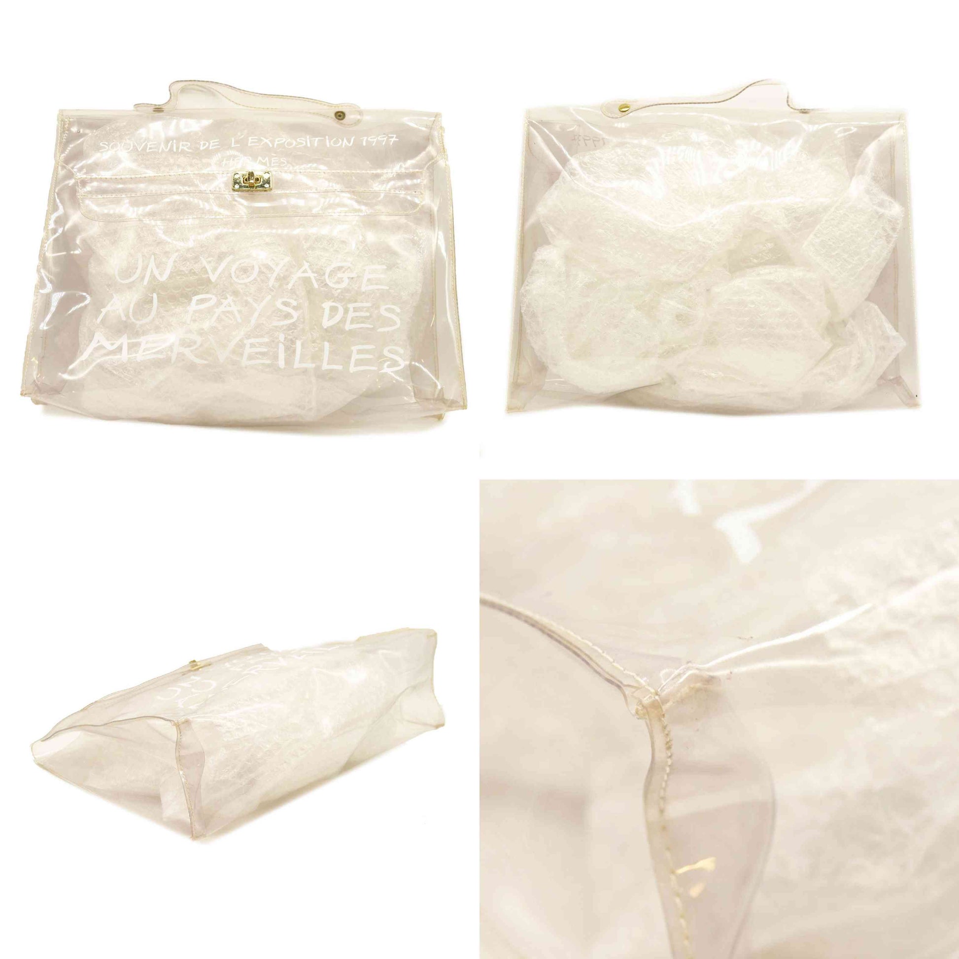 This is an authentic HERMES Vinyl Souvenir De L'Exposition Kelly in Transparent. This stylish tote is crafted of transparent vinyl and features voyage lettering on the front. There is a top handle strap and a cross-over flap with a polished gold Kelly signature turn lock. Carry this affordable Kelly bag for adventures to the beach or for a relaxed casual look for day. A truly one-of-a-kind, both practical with a touch of whimsy, only from Hermes.