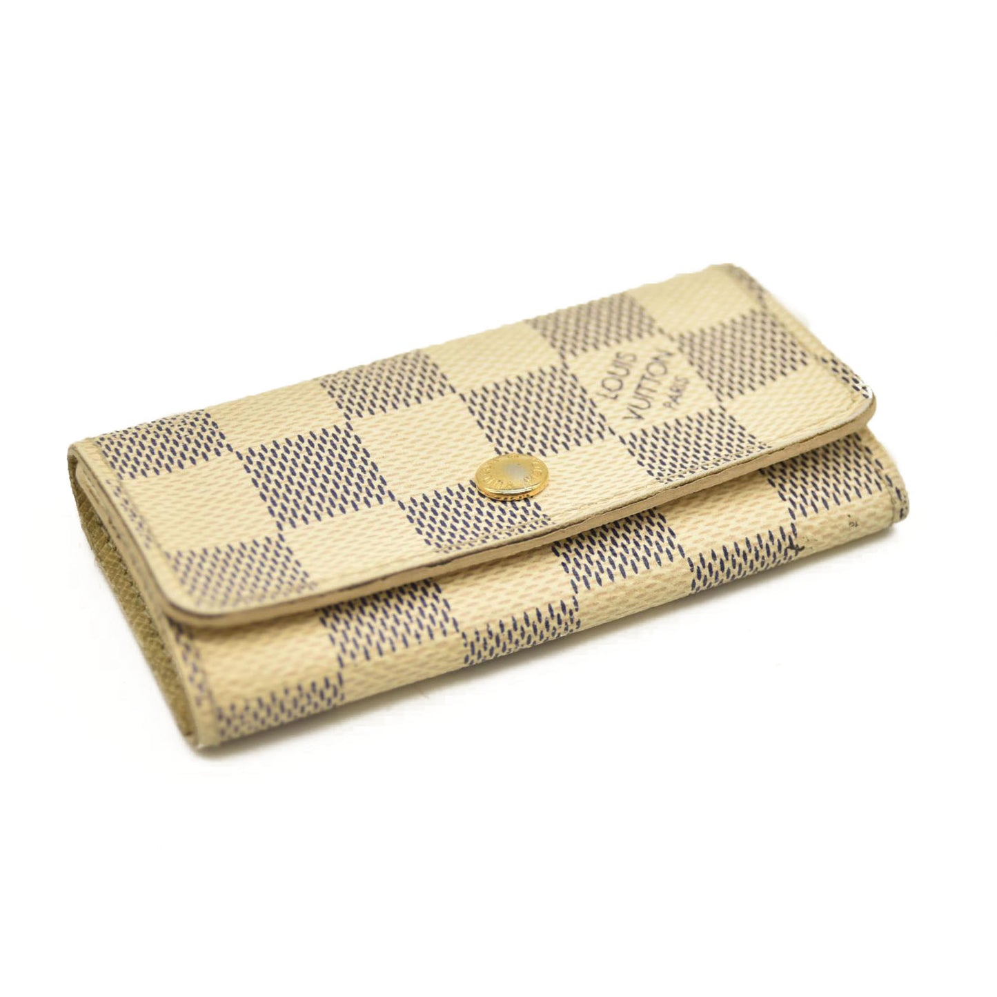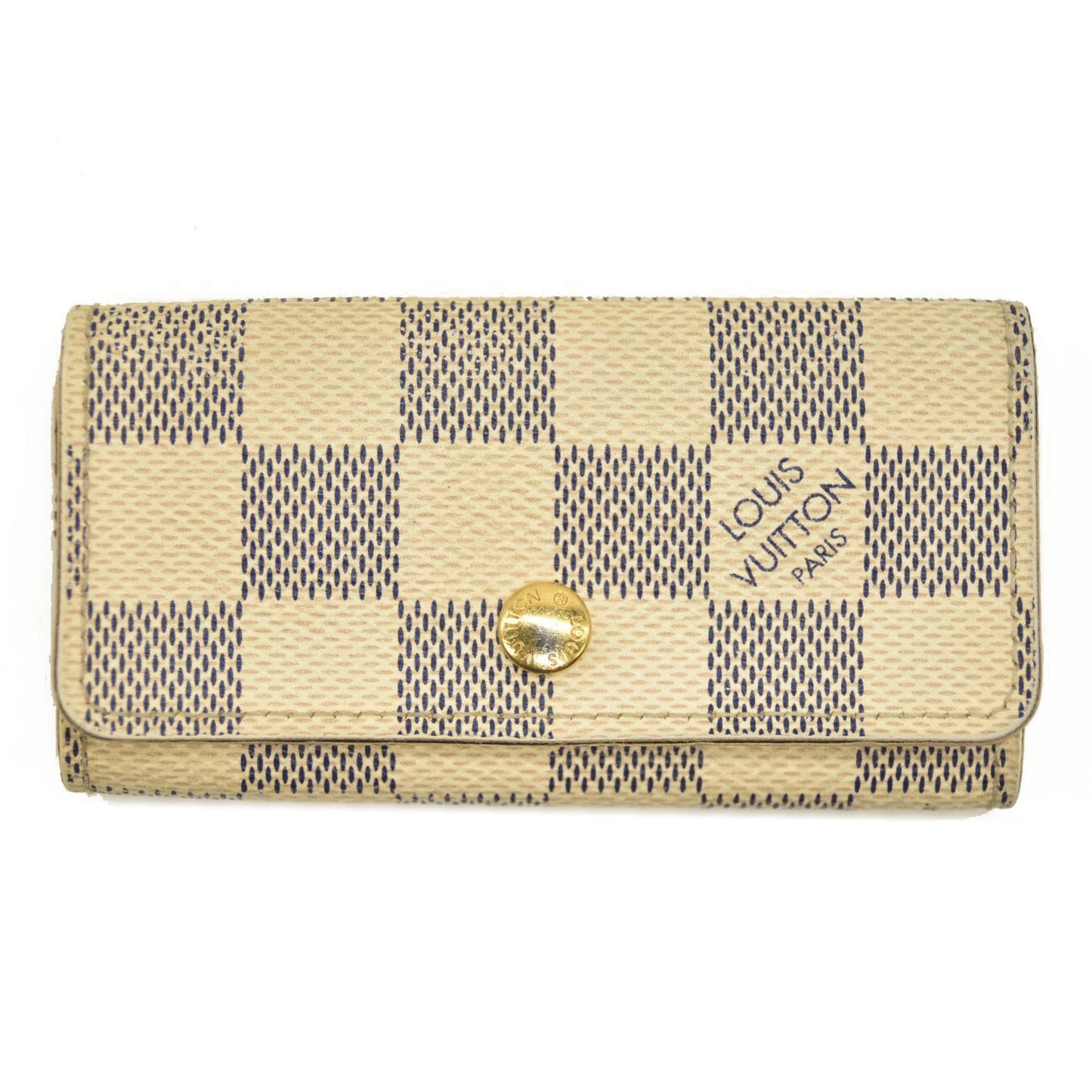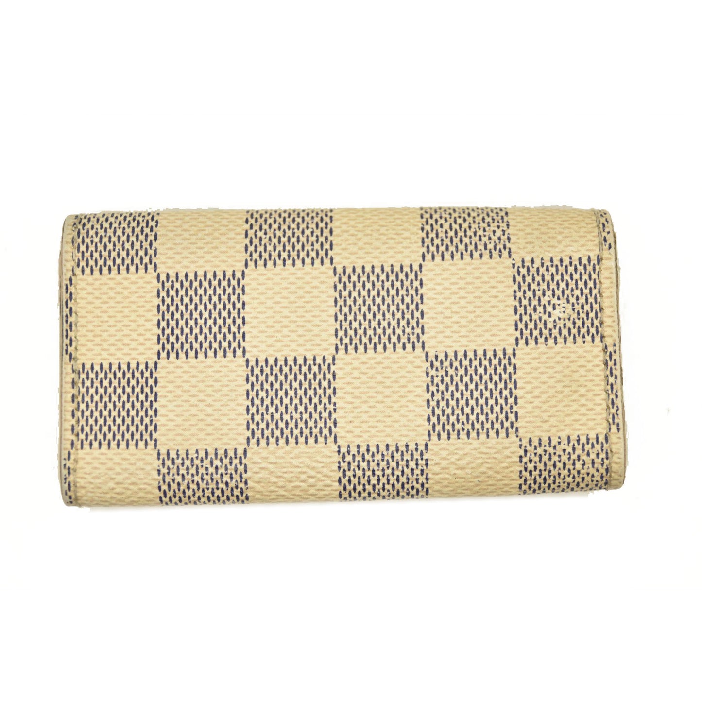 This is an authentic LOUIS VUITTON Damier Azur Multicles 4 Key Holder. This stylish key wallet is created of classic Louis Vuitton Damier checked coated canvas in blue and white. The flap unsnaps to a white cross-grain leather interior with 4 brass key rings to hold keys externally.