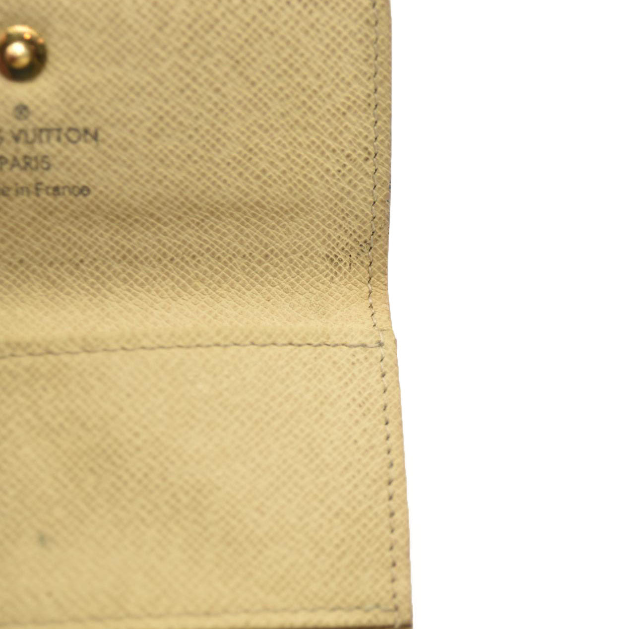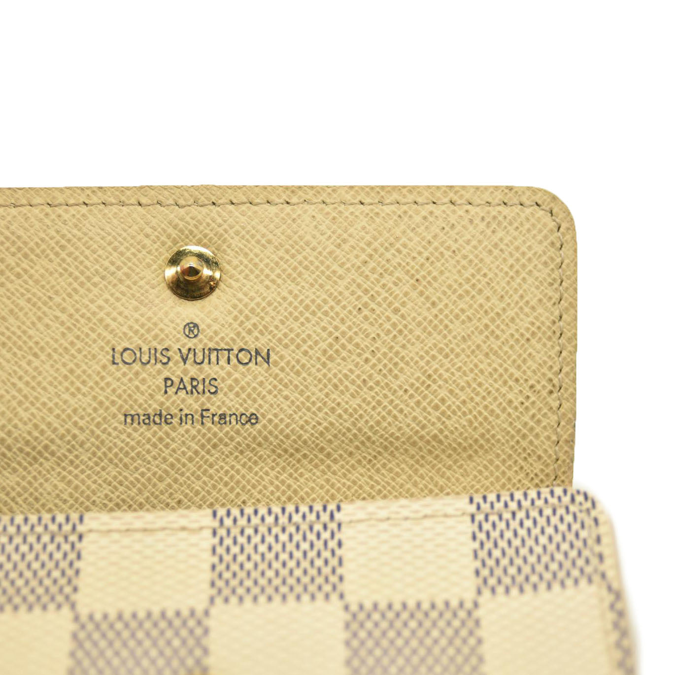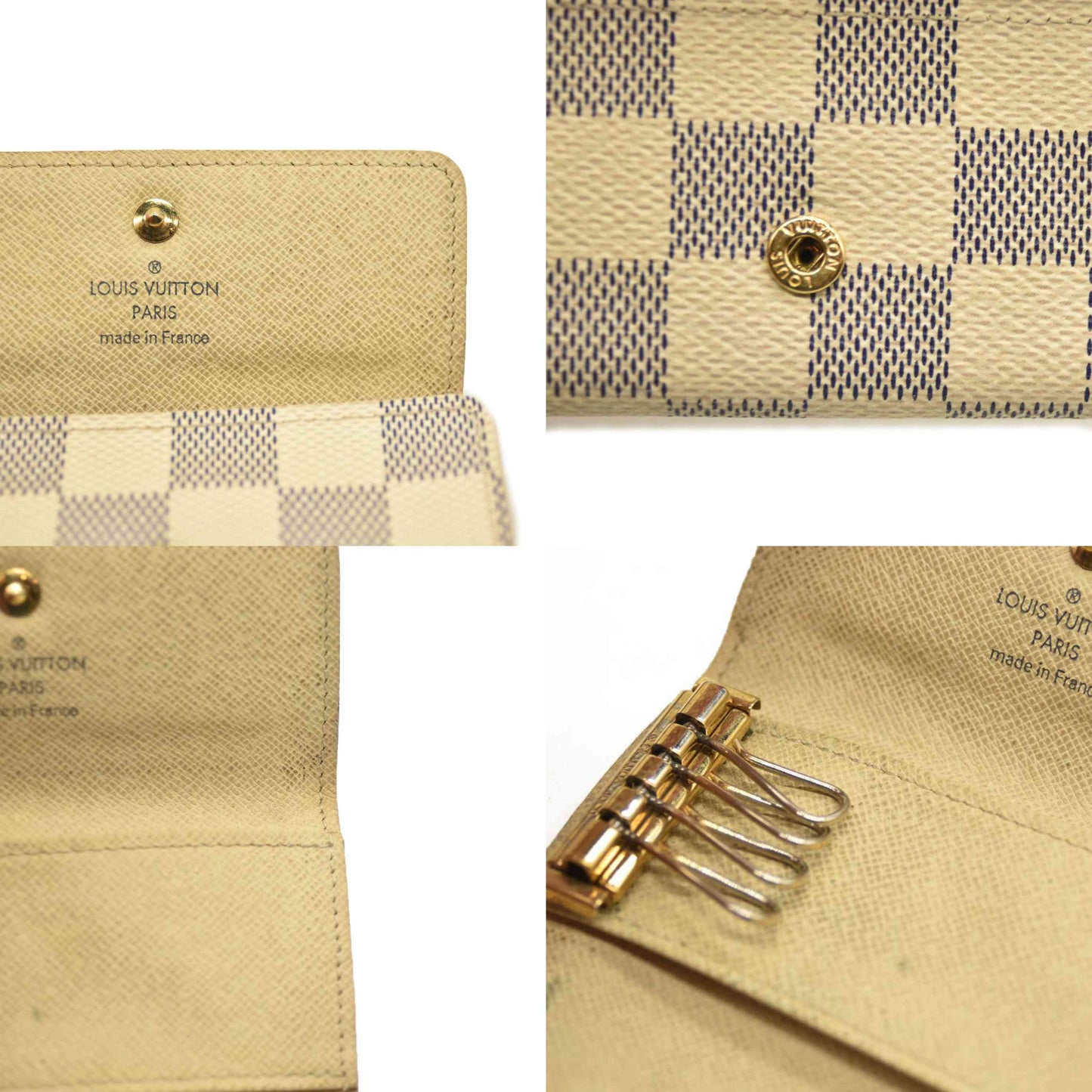 This is an authentic LOUIS VUITTON Damier Azur Multicles 4 Key Holder. This stylish key wallet is created of classic Louis Vuitton Damier checked coated canvas in blue and white. The flap unsnaps to a white cross-grain leather interior with 4 brass key rings to hold keys externally.
