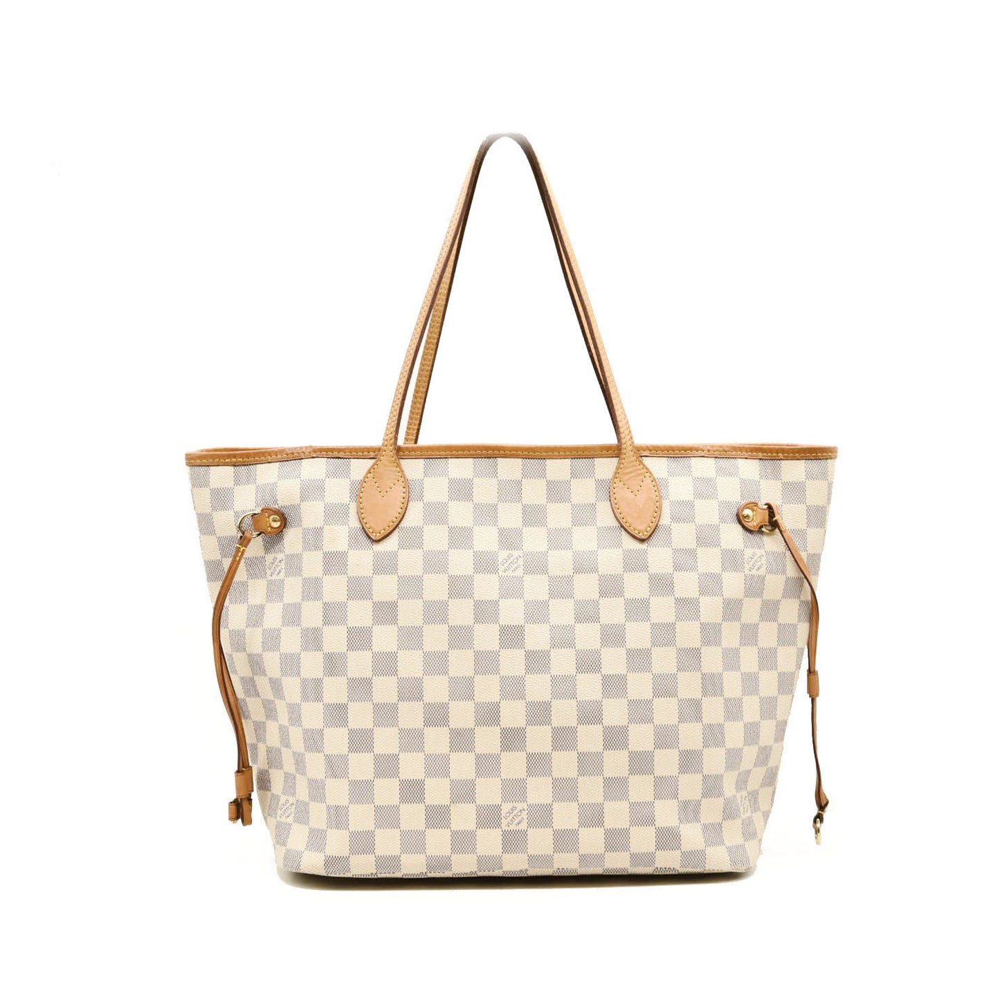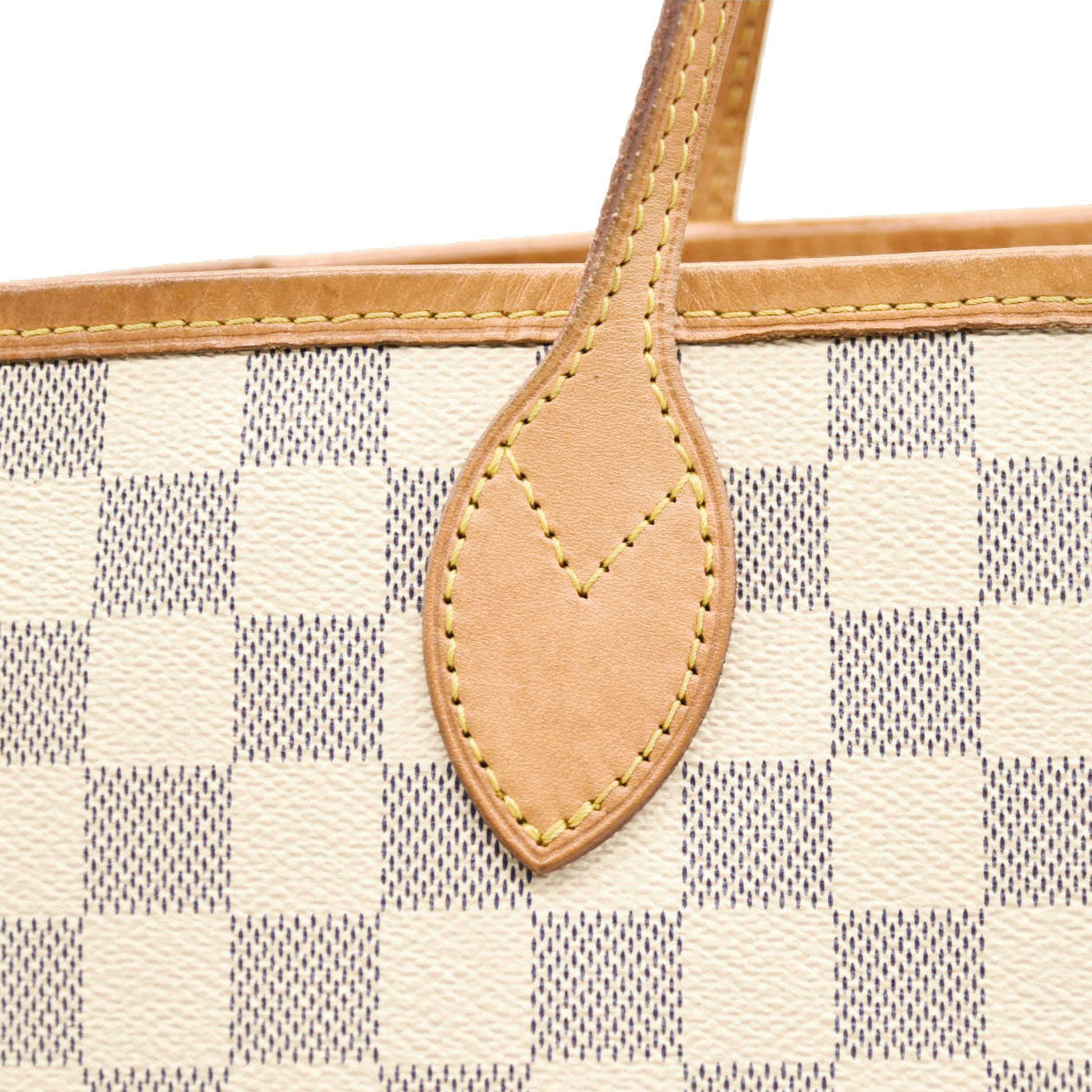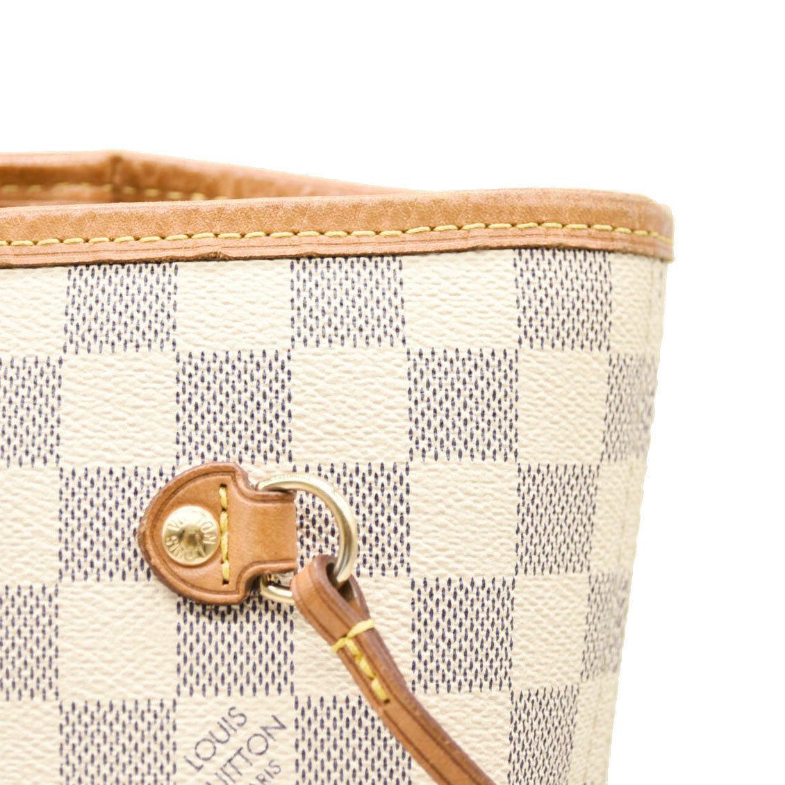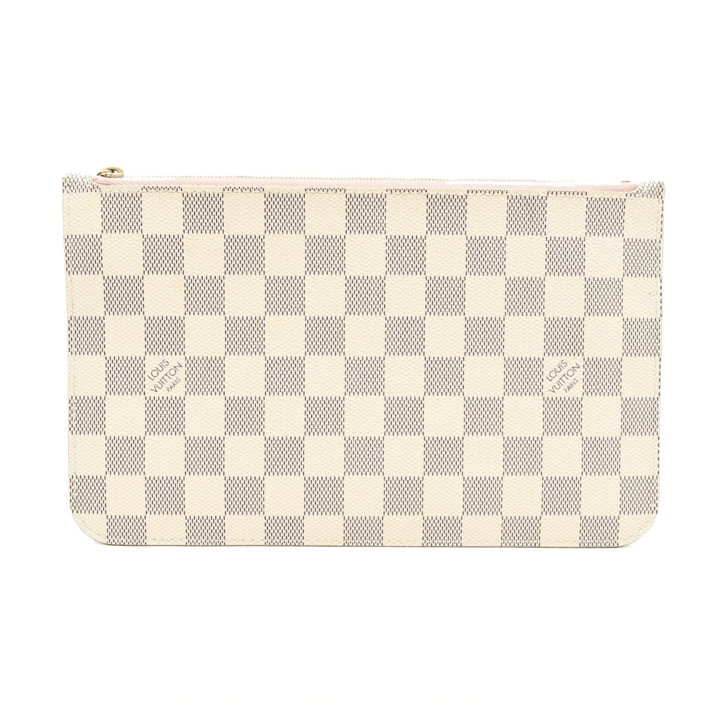 This is an authentic LOUIS VUITTON Damier Azur Neo Neverfull MM in Rose Ballerine. This is a stylish tote that is crafted of Louis Vuitton signature damier canvas in light azur blue in the medium size. The bag features vachetta cowhide leather strap handles, trim and side cinch cords with polished brass hardware. The top is wide and open to a striped pink fabric interior with a zipper pocket and a matching pochette. This is a marvelous tote for day with the luxury and style of Louis Vuitton!