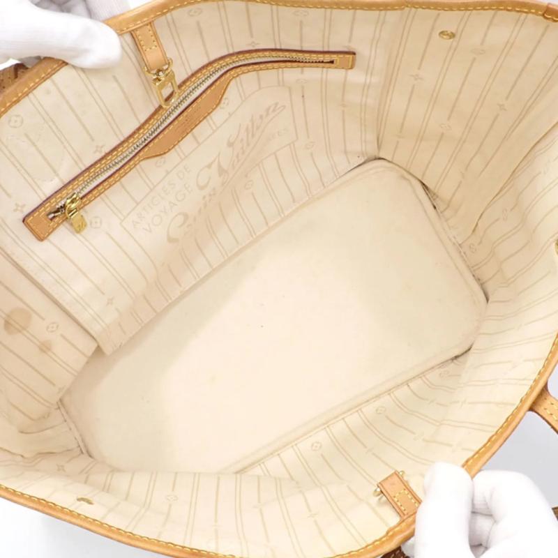 This is an authentic LOUIS VUITTON Damier Azur Neverfull MM. This tote bag is crafted of Louis Vuitton signature damier canvas in light azur blue in medium size. This handbag features vachetta cowhide leather strap handles, trim and side cinch cords with polished brass hardware. The top is wide and open to a beige and brown striped fabric interior with a zipper pocket. This tote is ideal for everyday use from Louis Vuitton.