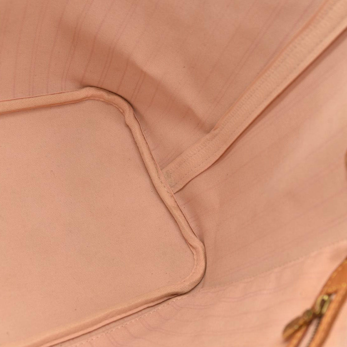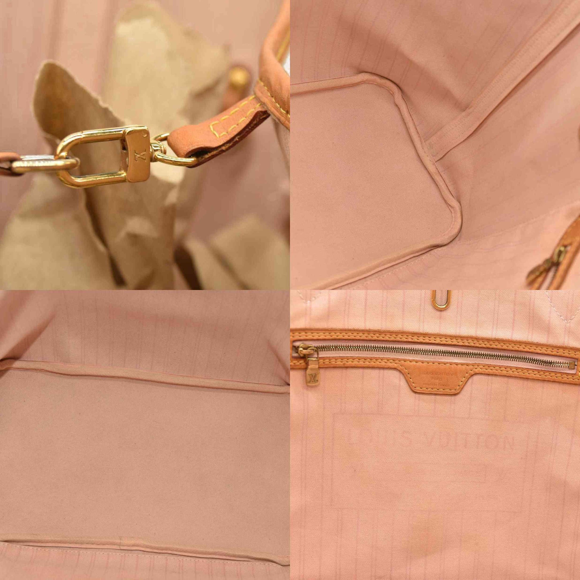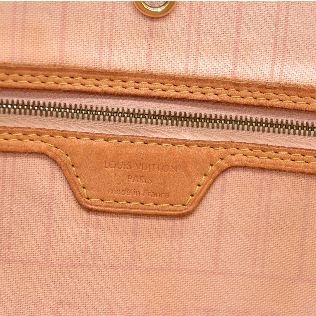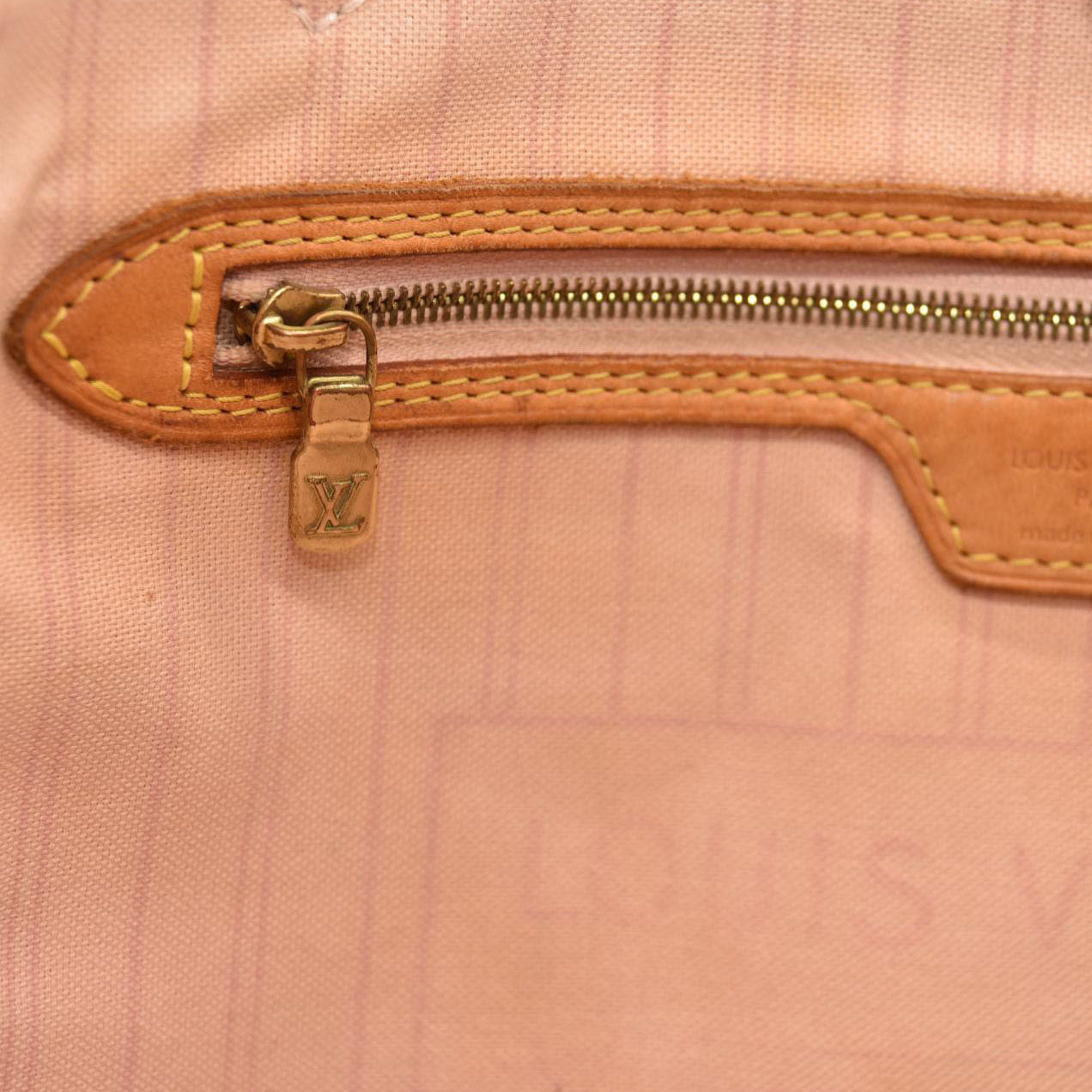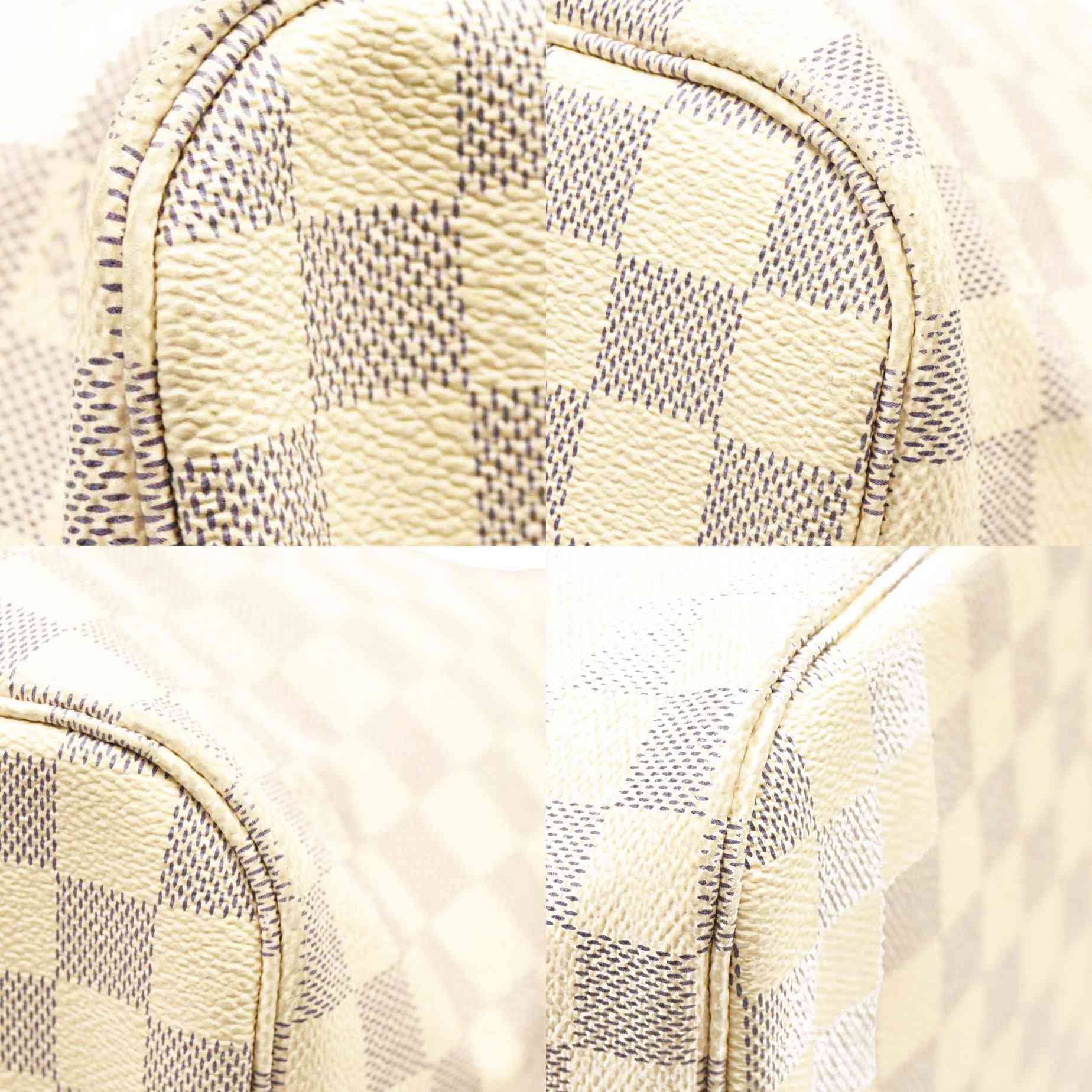 This is an authentic LOUIS VUITTON Damier Azur Neverfull MM. This stylish tote is crafted of Louis Vuitton's signature damier canvas in blue and white. This shoulder bag features vachetta cowhide leather trim, including strap handles and side cinch cords, with polished brass hardware. The top is wide and open to a striped white fabric interior with a hanging zipper pocket.