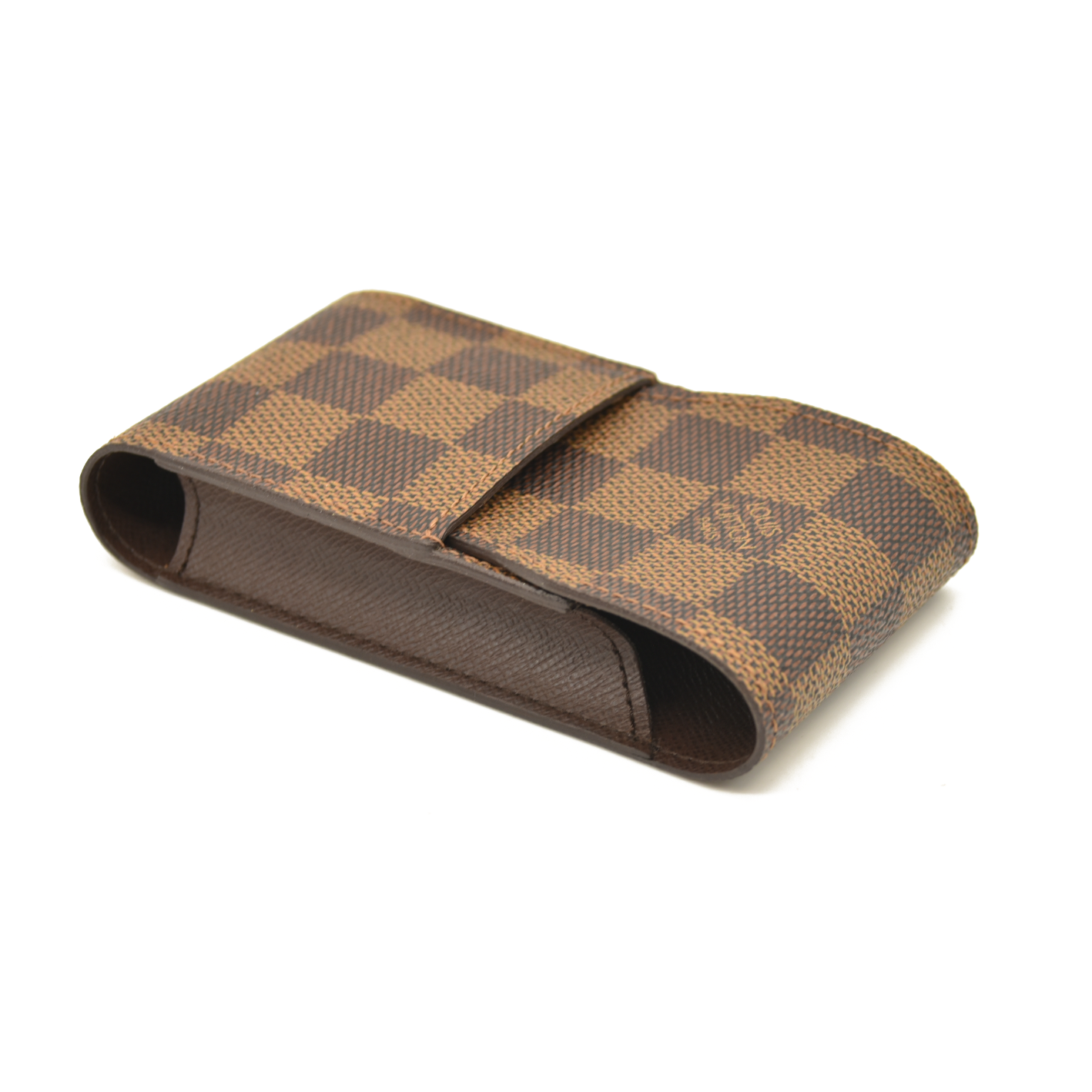 This is an authentic LOUIS VUITTON Damier Ebene Cigarette Case. This is a stylish case, crafted of Damier canvas in brown. The crossover flap opens to a compact chocolate brown cross-grain leather interior.
