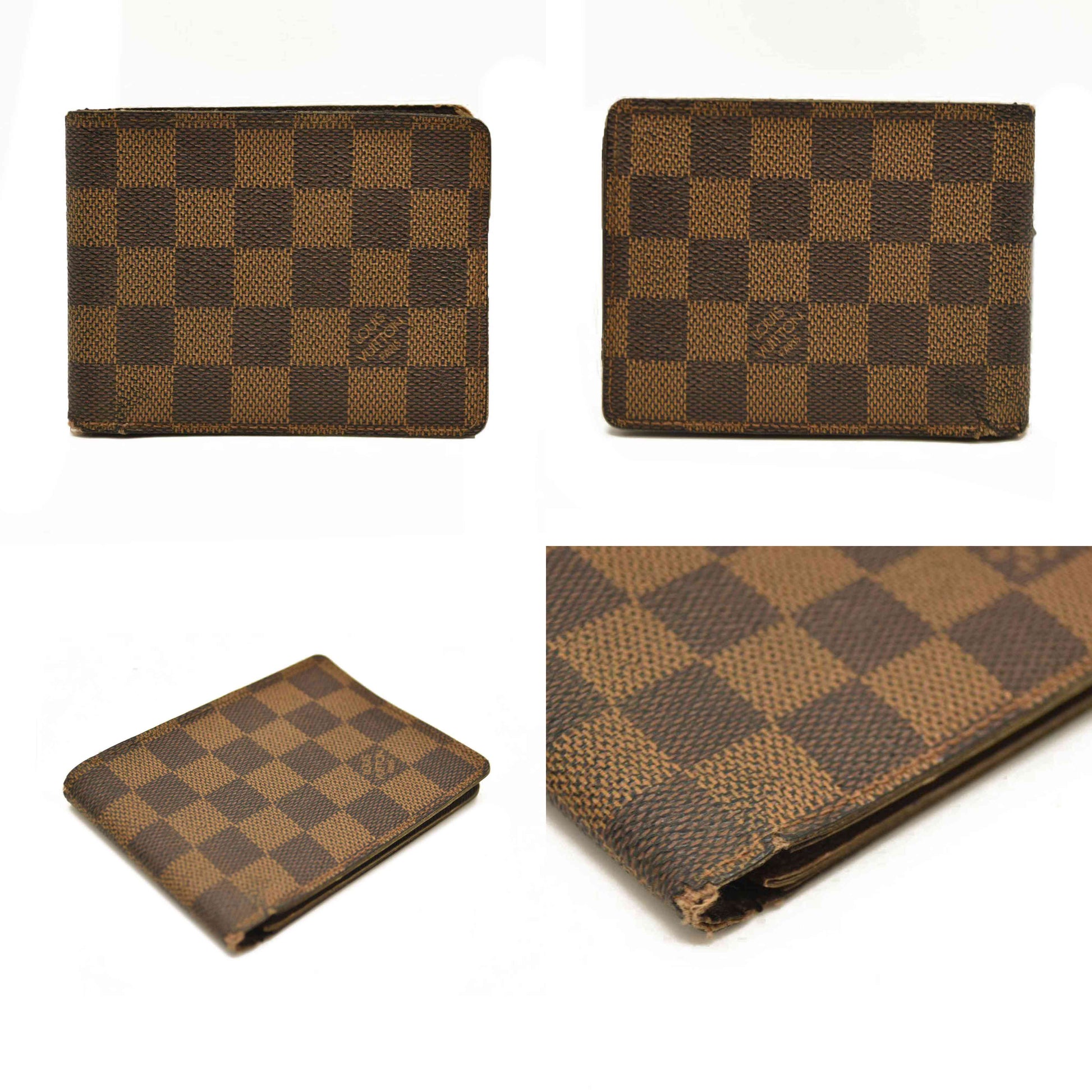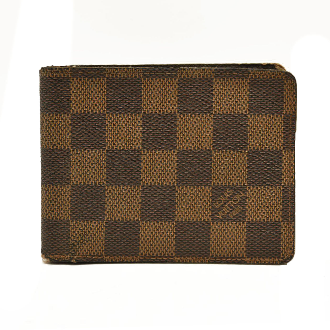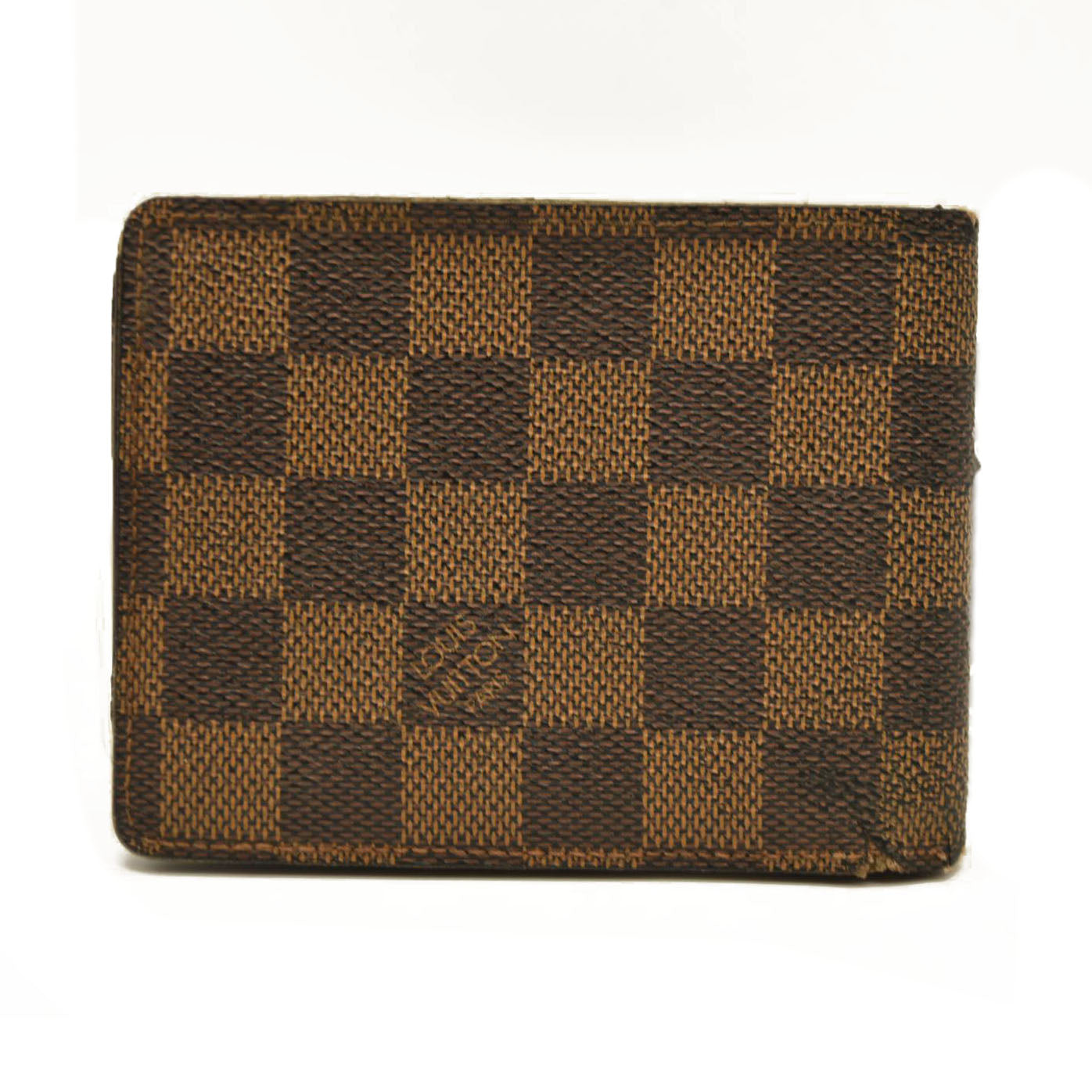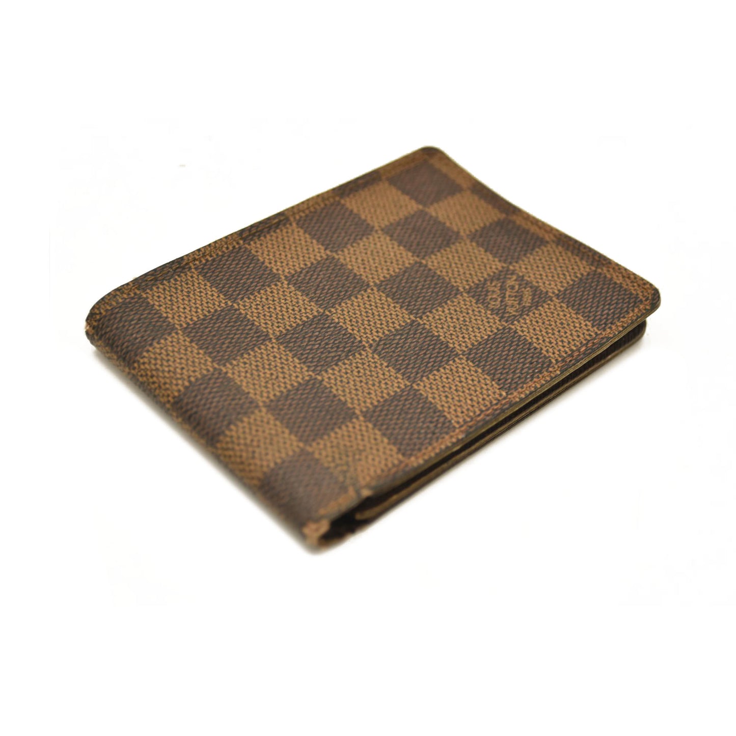 This is an authentic LOUIS VUITTON Damier Ebene Multiple Wallet. This stylish wallet is finely crafted of Louis Vuitton signature damier coated canvas. The wallet opens to a brown crossgrain leather interior with card slots, pockets, and a billfold.