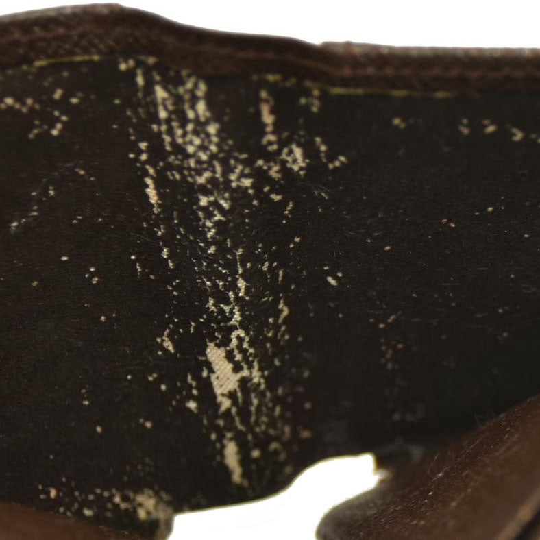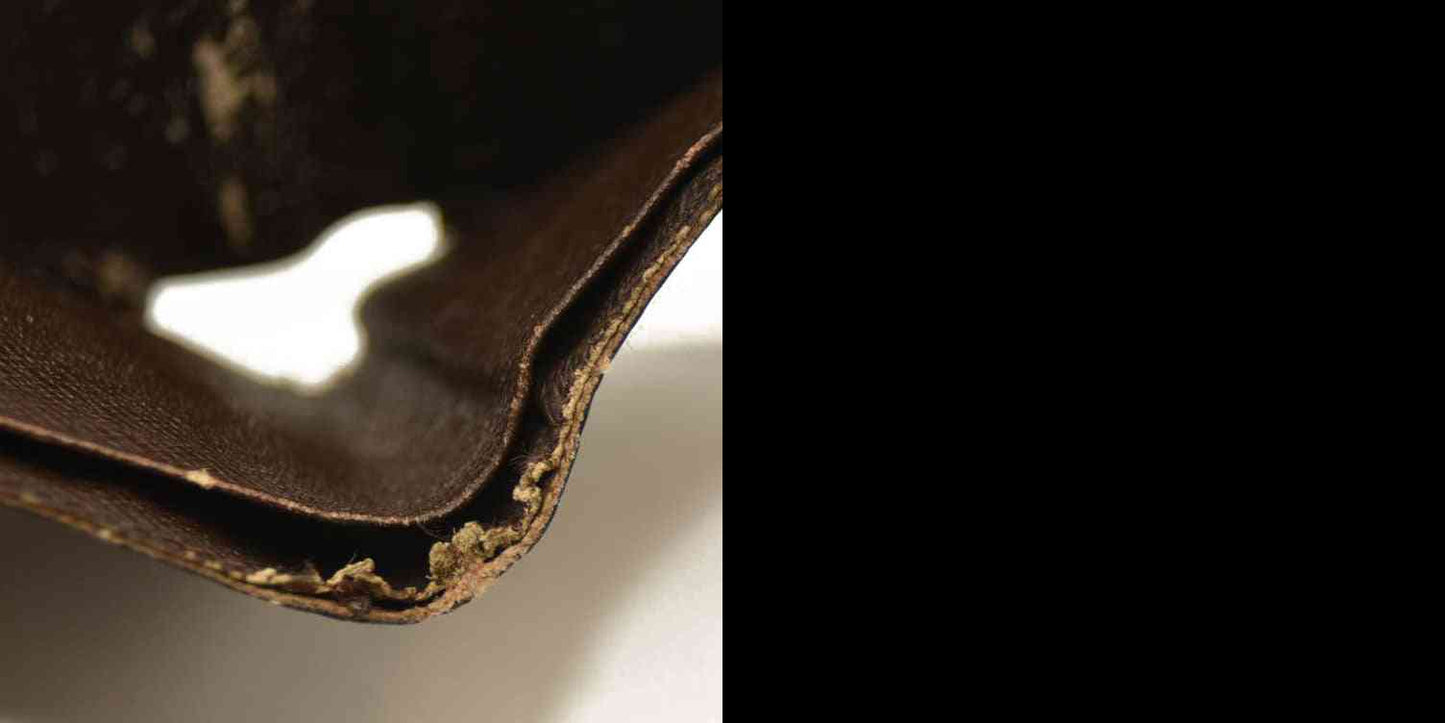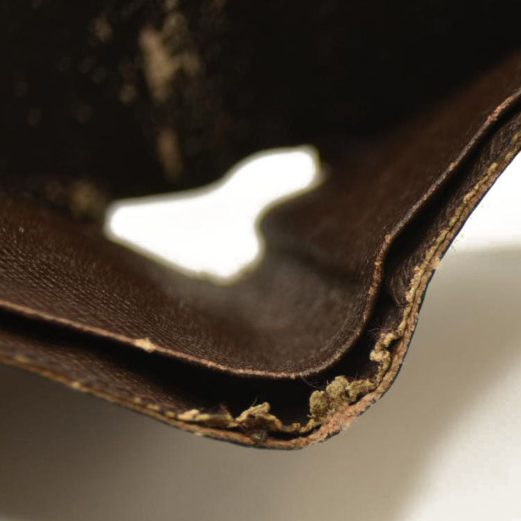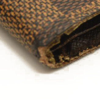 The corner has damage or break. The exterior is rubbed with scratches. There are rubbed marks on the inside. The inside of pocket/cash compartment are peeled.
