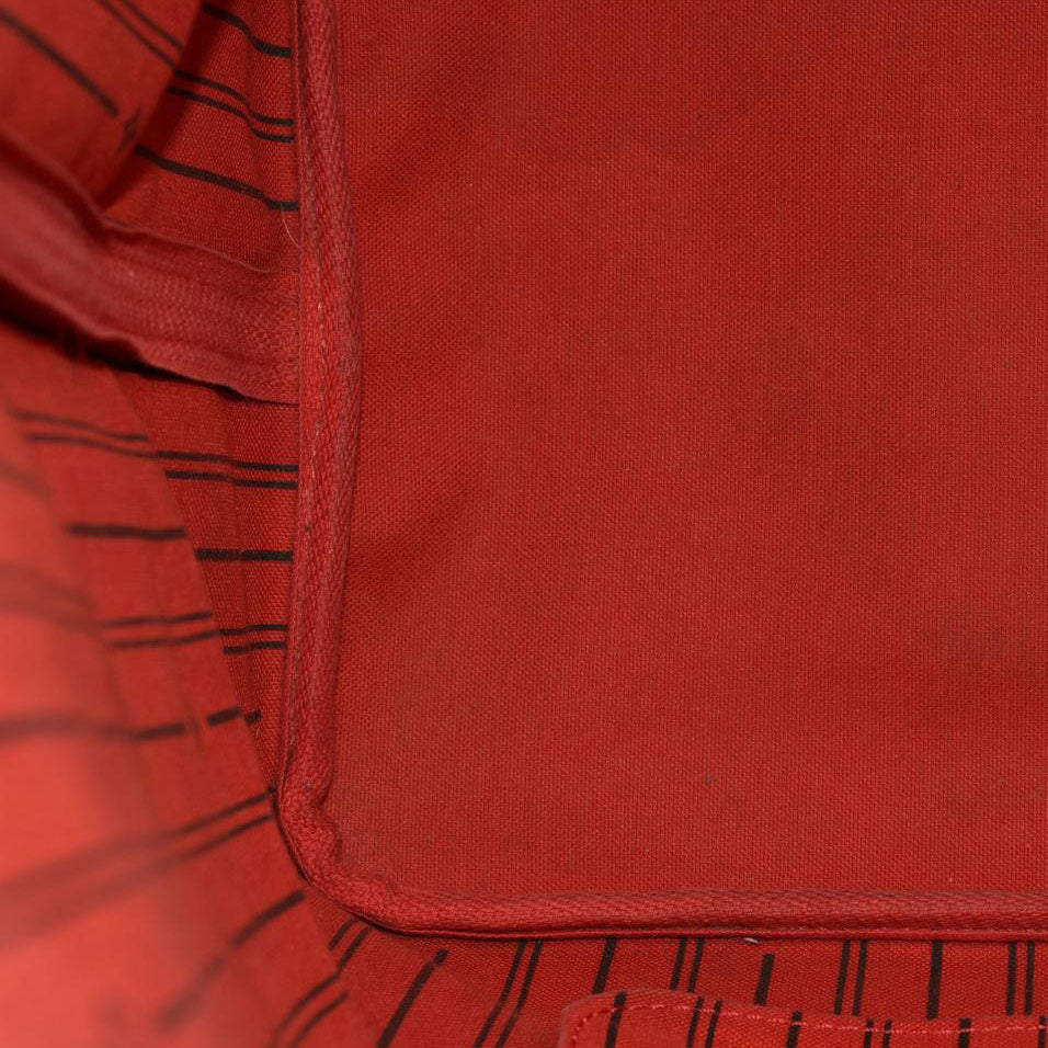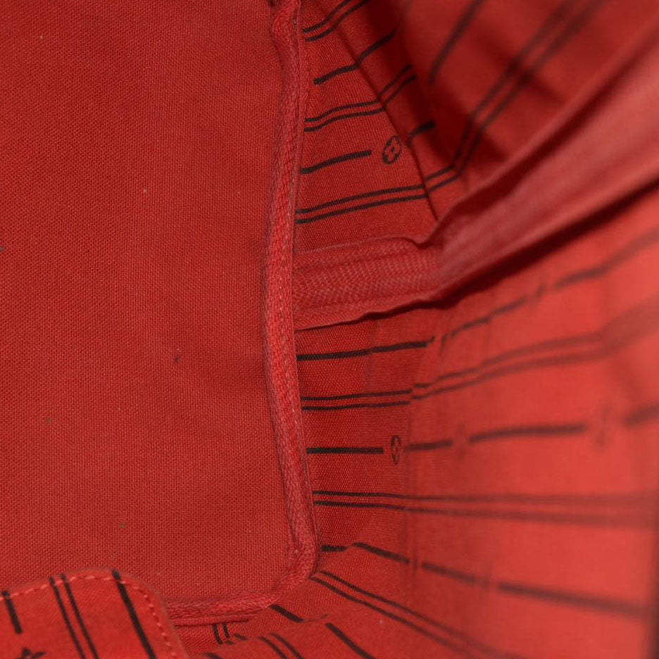 This is an authentic LOUIS VUITTON Damier Ebene Neo Neverfull GM. This chic handbag is crafted of classic Louis Vuitton Damier canvas with dark brown cowhide leather shoulder straps, trim, and side cinch cords with polished gold hardware. The top is open to an interior of rouge red striped fabric with a hanging zipper pocket.