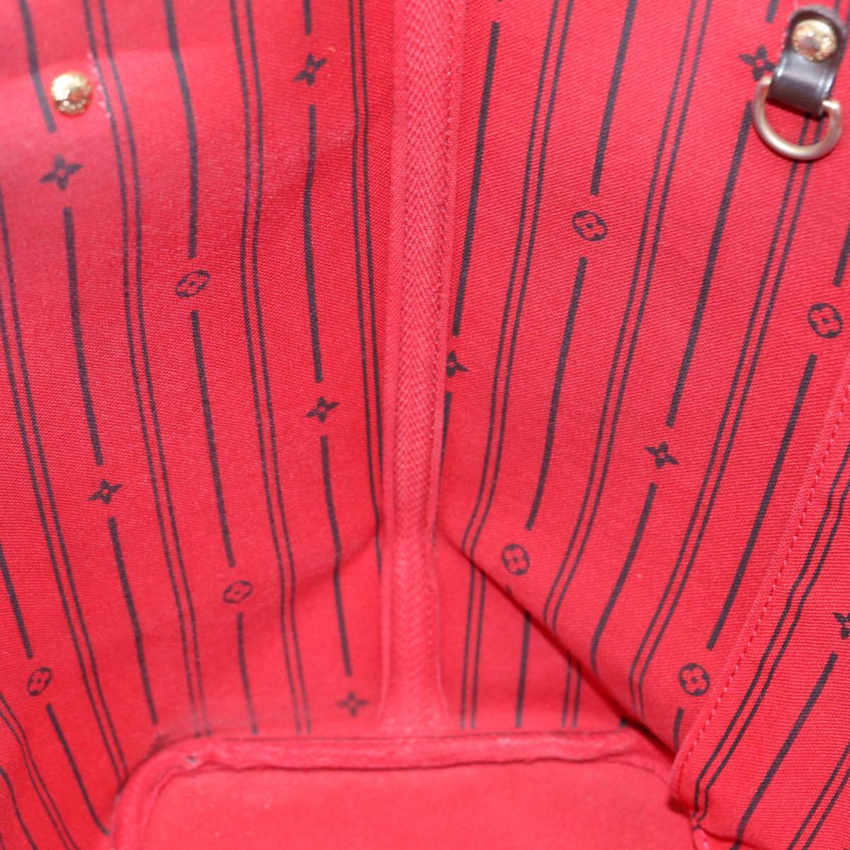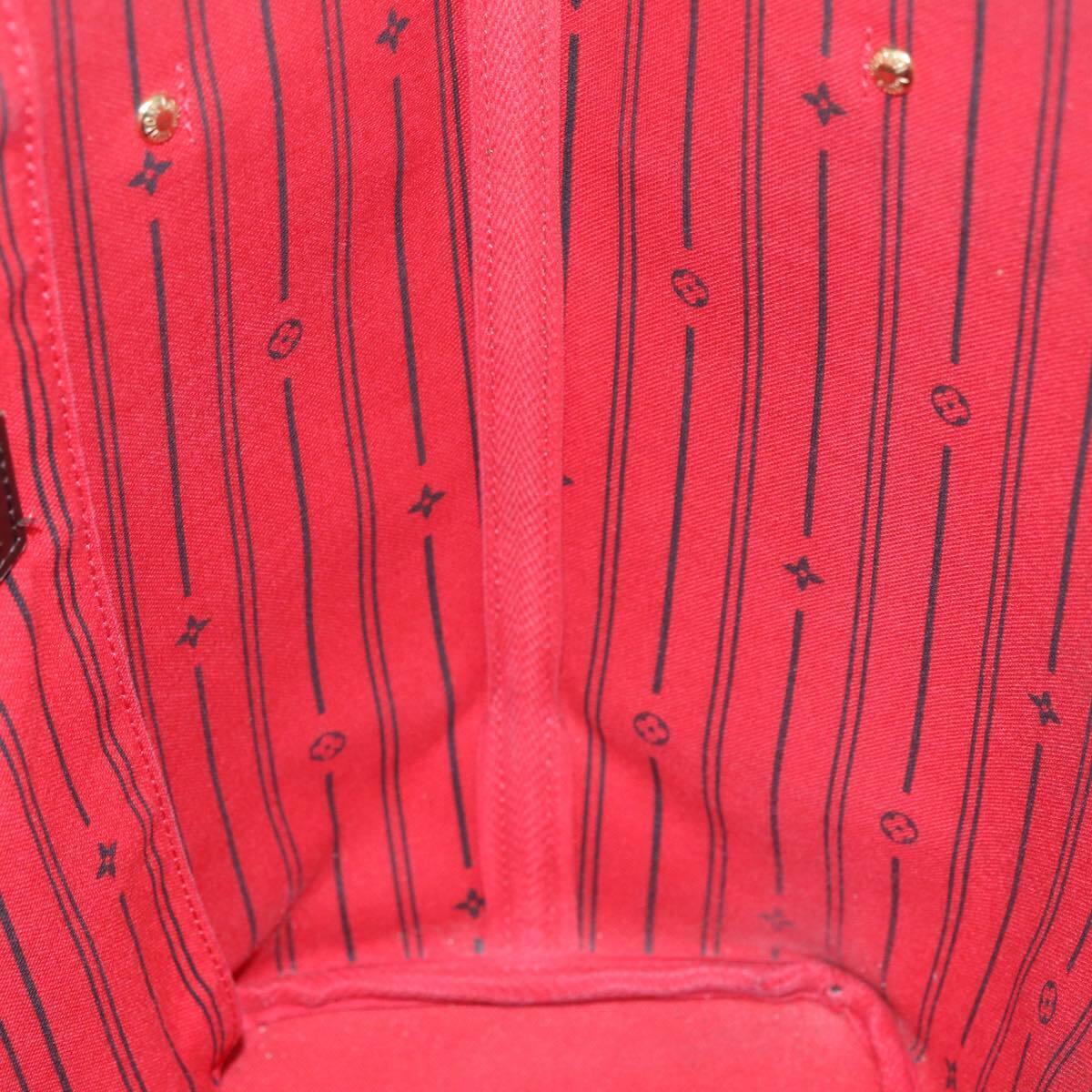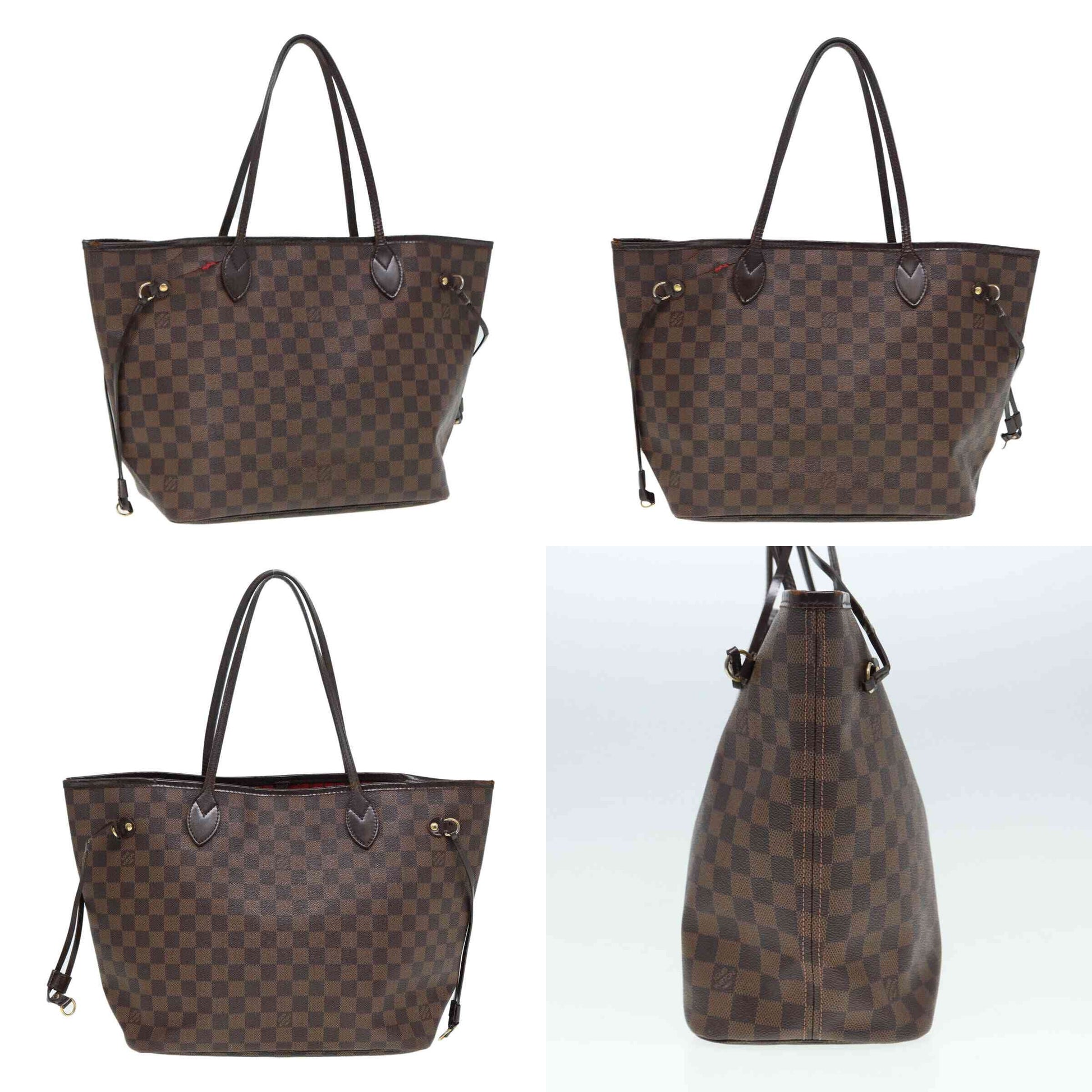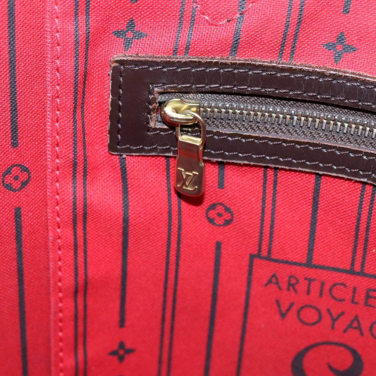 This is an authentic LOUIS VUITTON Damier Ebene Neverfull MM. This chic handbag is crafted of classic Louis Vuitton damier checkered canvas with chocolate brown cowhide leather top shoulder handles and trim. This bag opens to an interior of rouge red striped Louis Vuitton logo fabric with a zipper pocket. This is a wonderful tote that is ideal for all of your everyday needs with the special accent of luxury and style, from Louis Vuitton