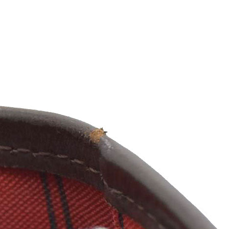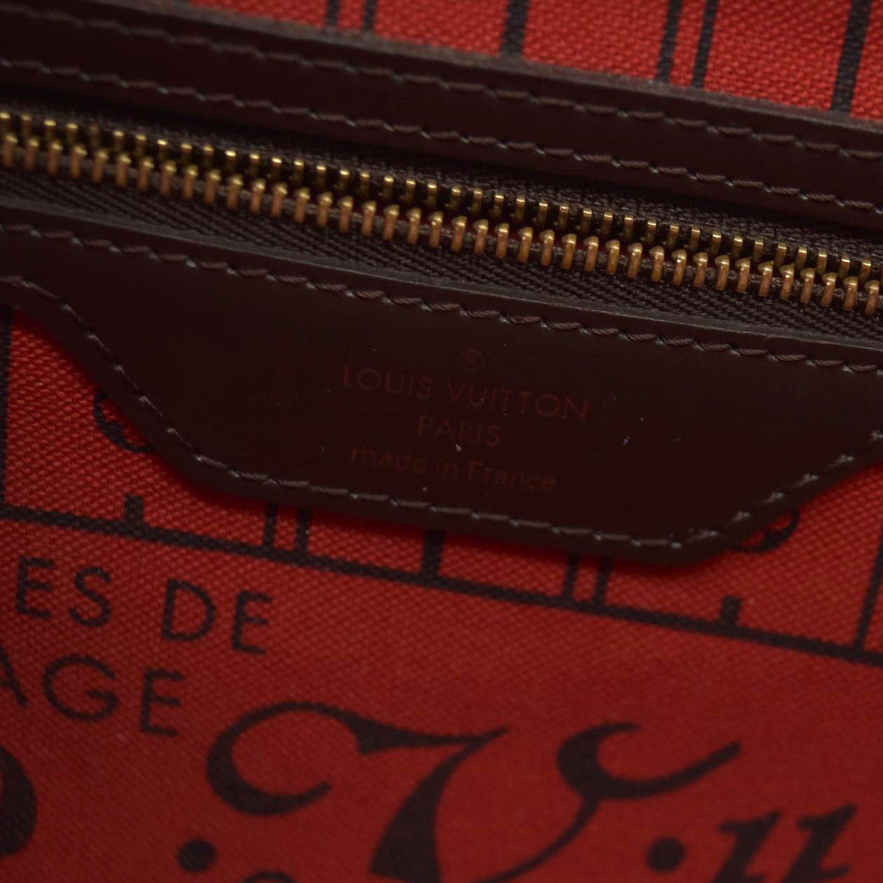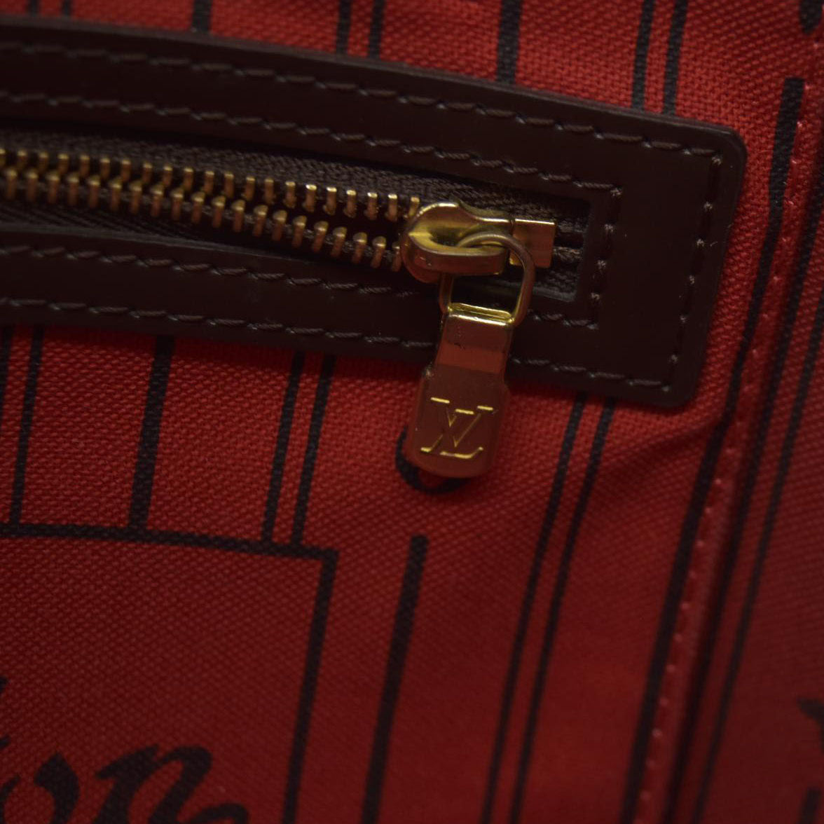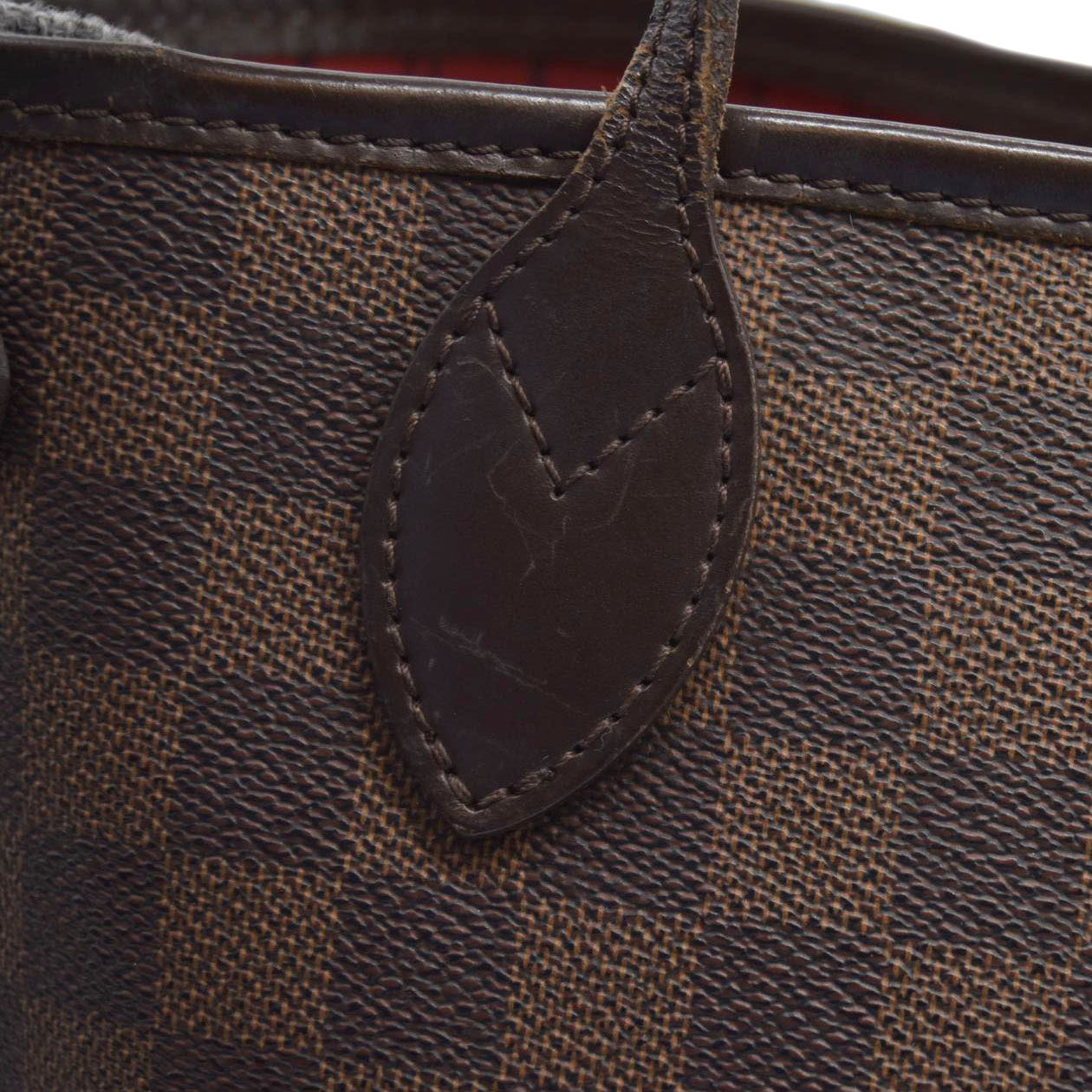 This is an authentic LOUIS VUITTON Damier Ebene Neverfull PM. This chic tote is crafted of classic Louis Vuitton checkerboard coated canvas in brown with complimentary dark brown cowhide leather trim and top handles. The top is open to a red and black striped fabric interior with a hanging zipper pocket.