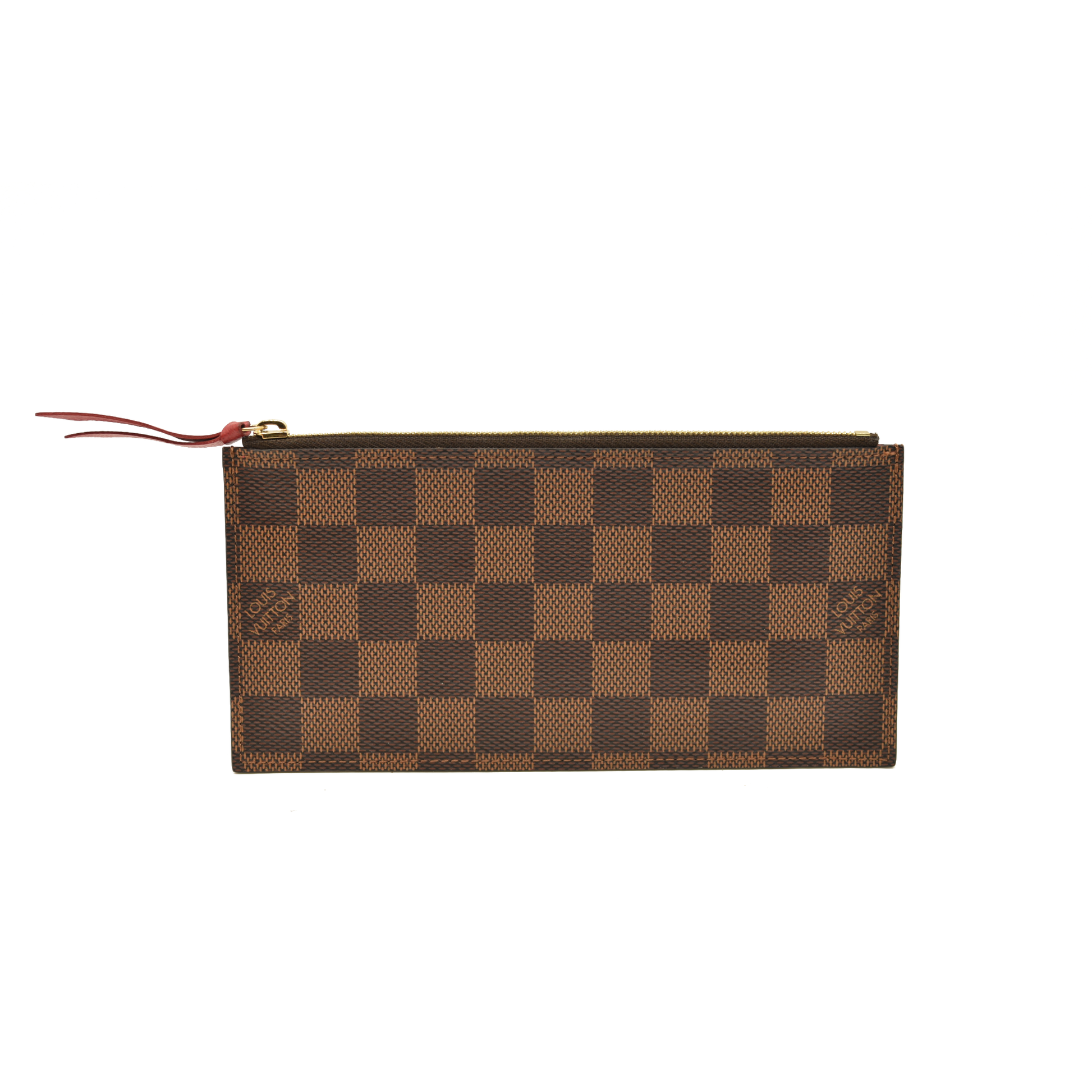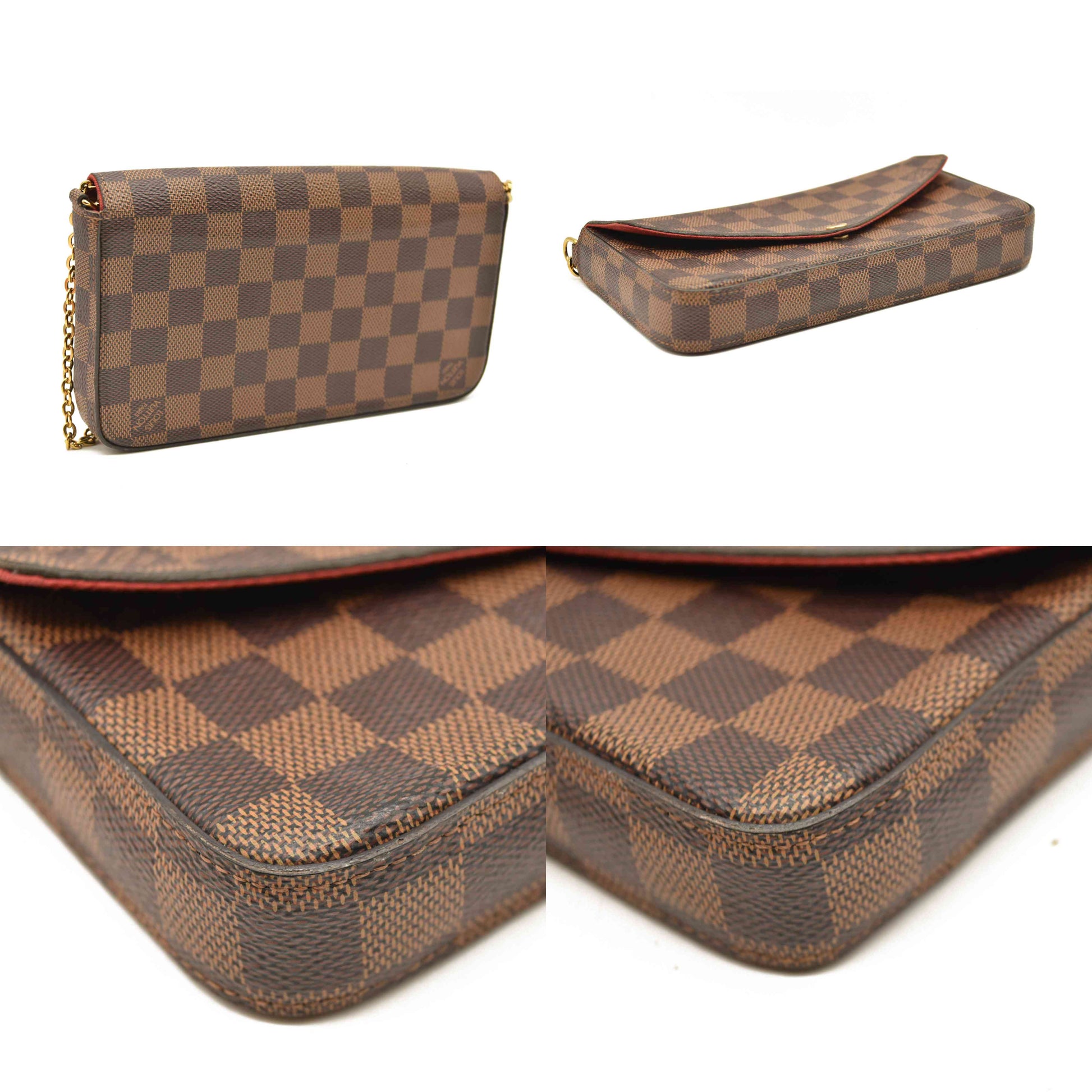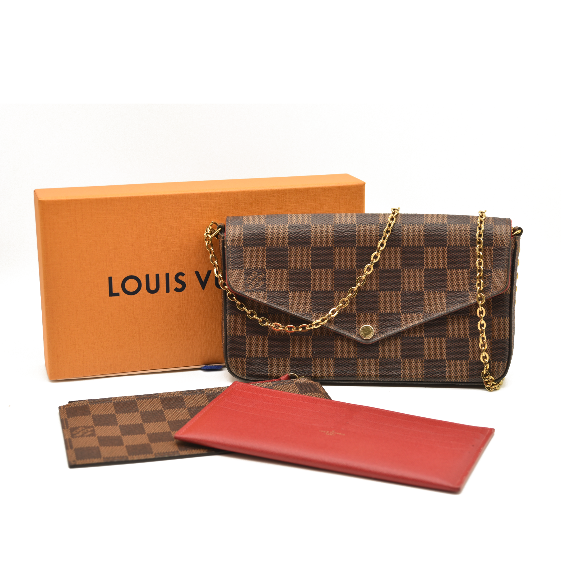 This is an authentic LOUIS VUITTON Damier Ebene Pochette Felicie Chain Wallet. This stylish wallet is crafted of Louis Vuitton Damier coated canvas. The bag features an envelope-style facing flap and a gold chain shoulder strap. This opens to a red fabric interior with a pocket.