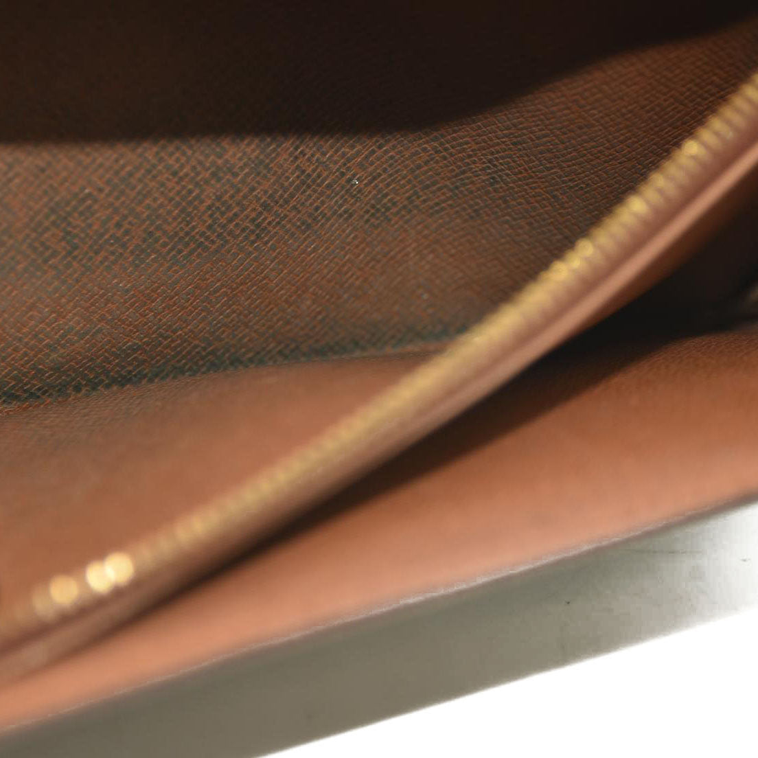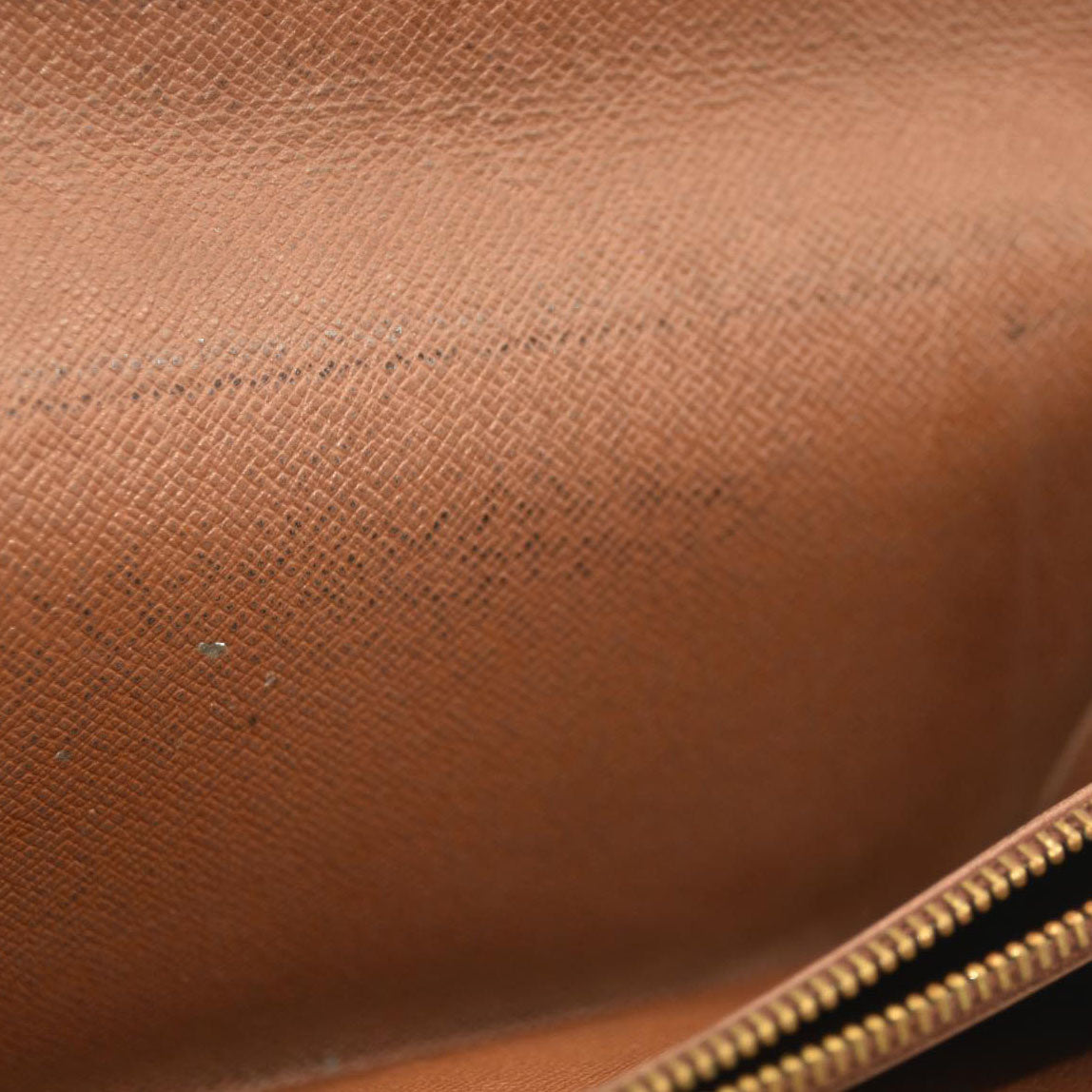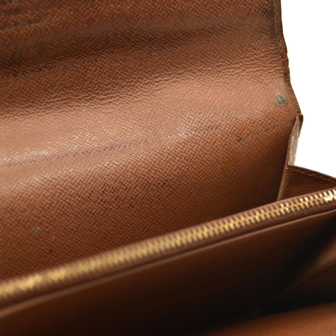 The exterior is rubbed with scratches. There are loose stitches around the folding area. There are rubbed marks on the inside.