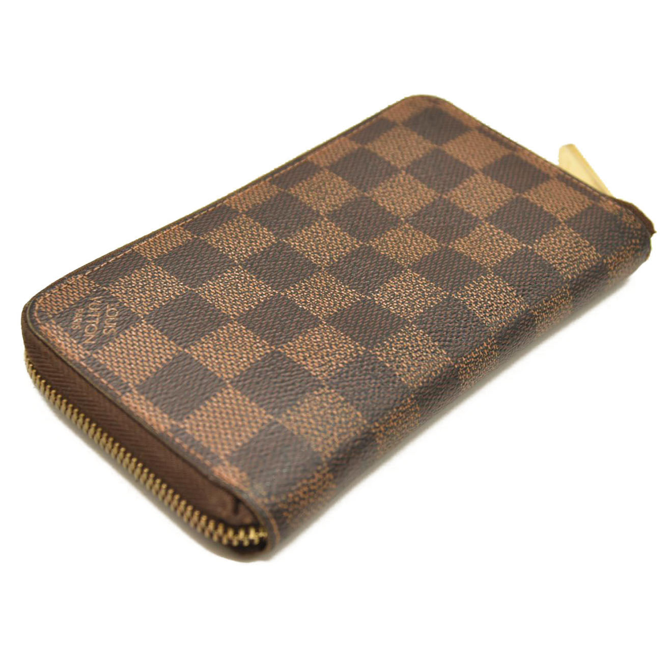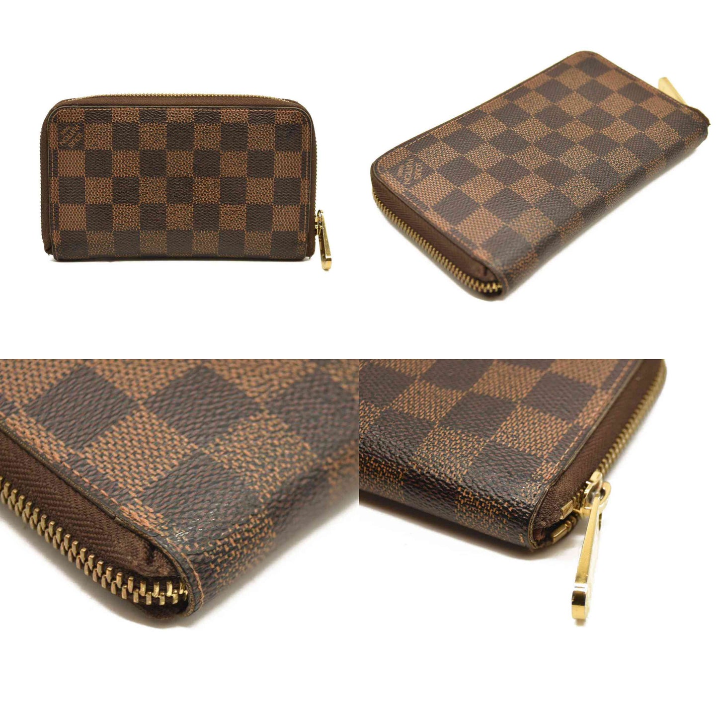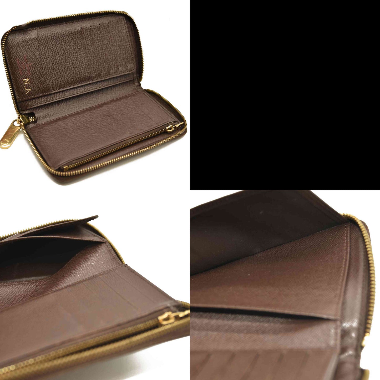 This is an authentic LOUIS VUITTON Damier Ebene Zippy Compact Wallet. This wallet is crafted of Louis Vuitton's signature checkerboard coated canvas in brown. The wallet features a brass wrap-around zipper that opens to a dark brown cross-grain leather interior with card slots, patch pockets, and a zipper compartment.