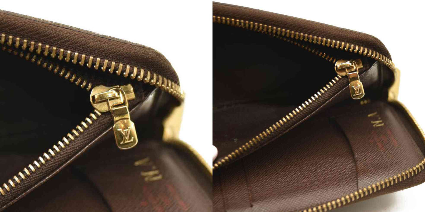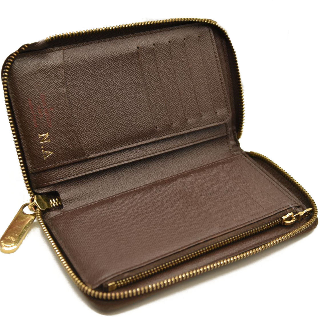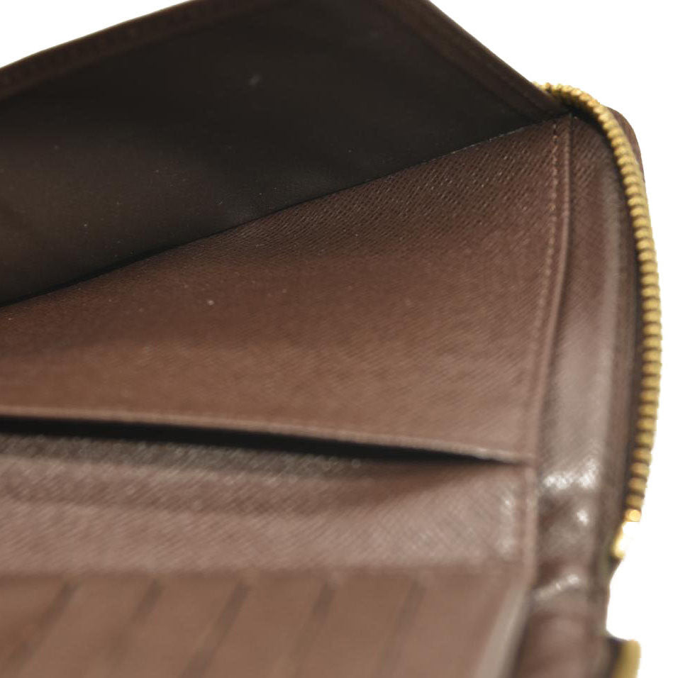 This is an authentic LOUIS VUITTON Damier Ebene Zippy Compact Wallet. This wallet is crafted of Louis Vuitton's signature checkerboard coated canvas in brown. The wallet features a brass wrap-around zipper that opens to a dark brown cross-grain leather interior with card slots, patch pockets, and a zipper compartment.