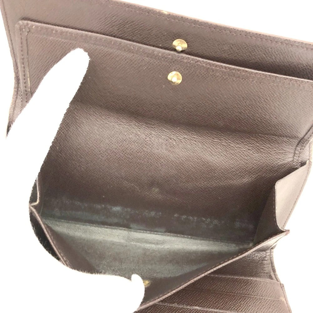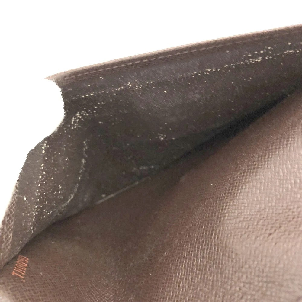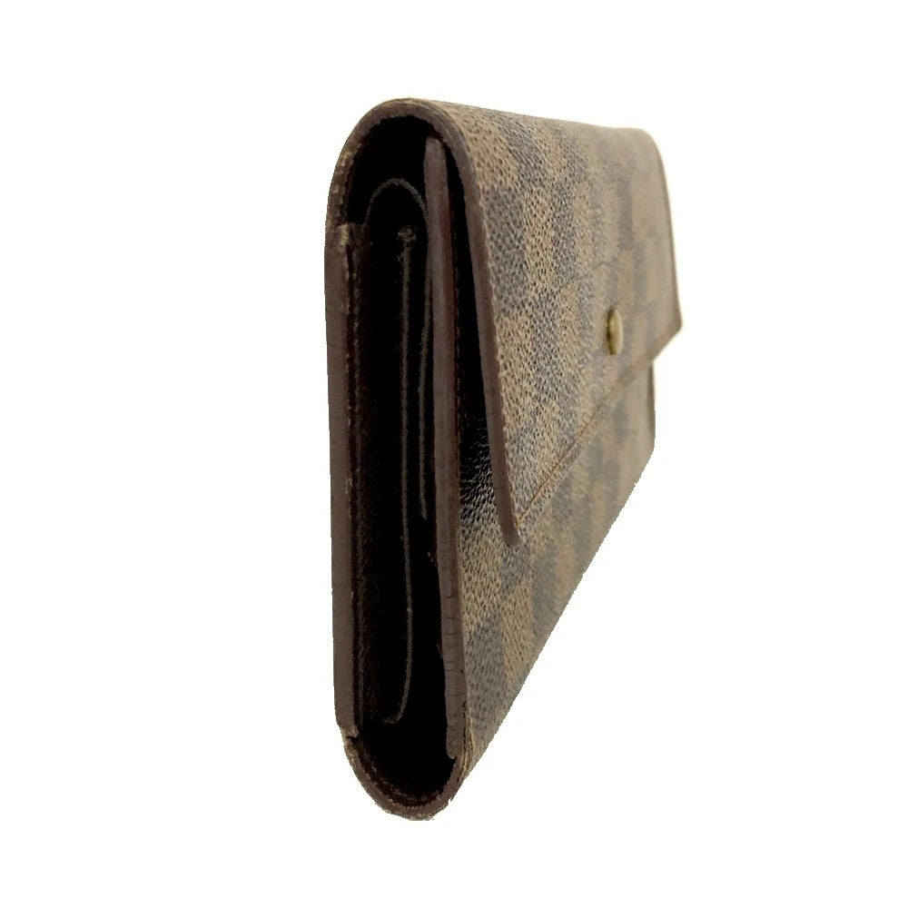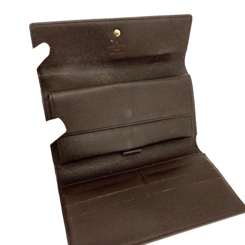 This is an authentic LOUIS VUITTON Porte Trésor International Wallet, crafted from signature Damier Ebene coated canvas with a smooth chocolate brown leather interior. The trifold design features a flap with gold-tone LV-engraved snap closure, opening to reveal multiple card slots, slip pockets, a bill compartment, and a spacious snap coin pocket. Elegant and highly functional, this long wallet offers classic organization with timeless Louis Vuitton style.