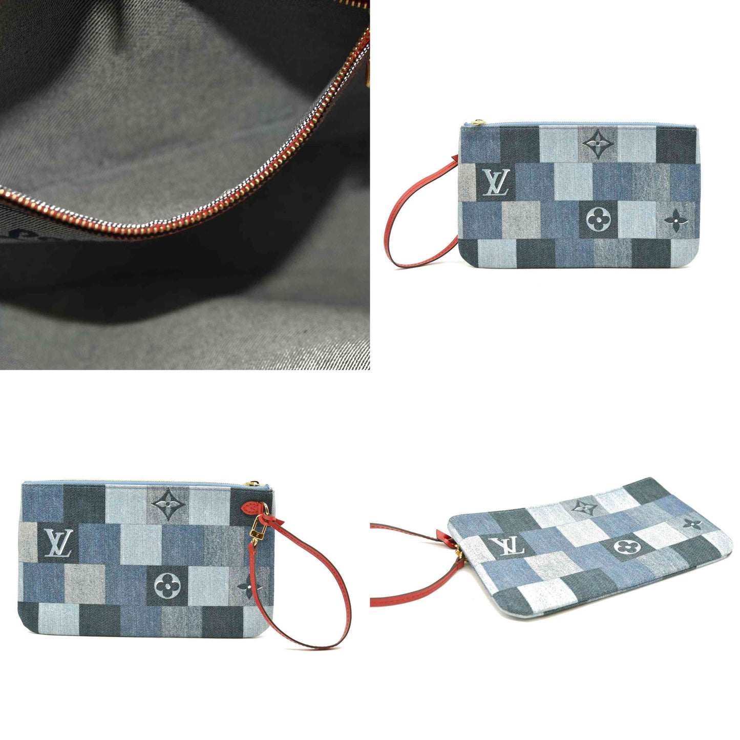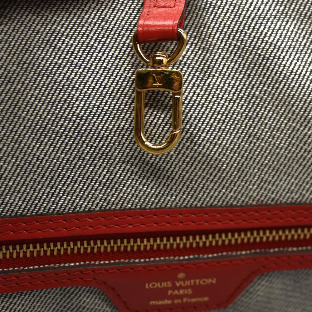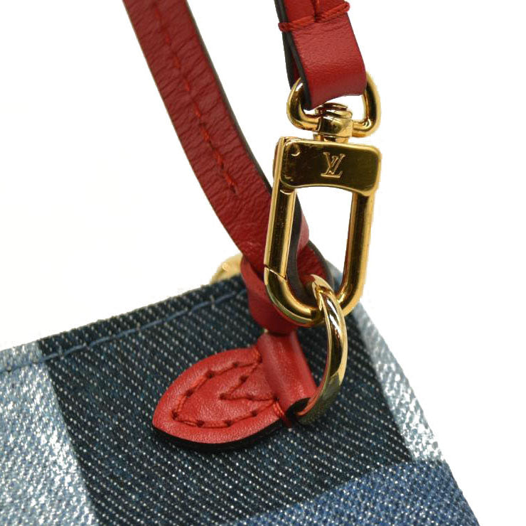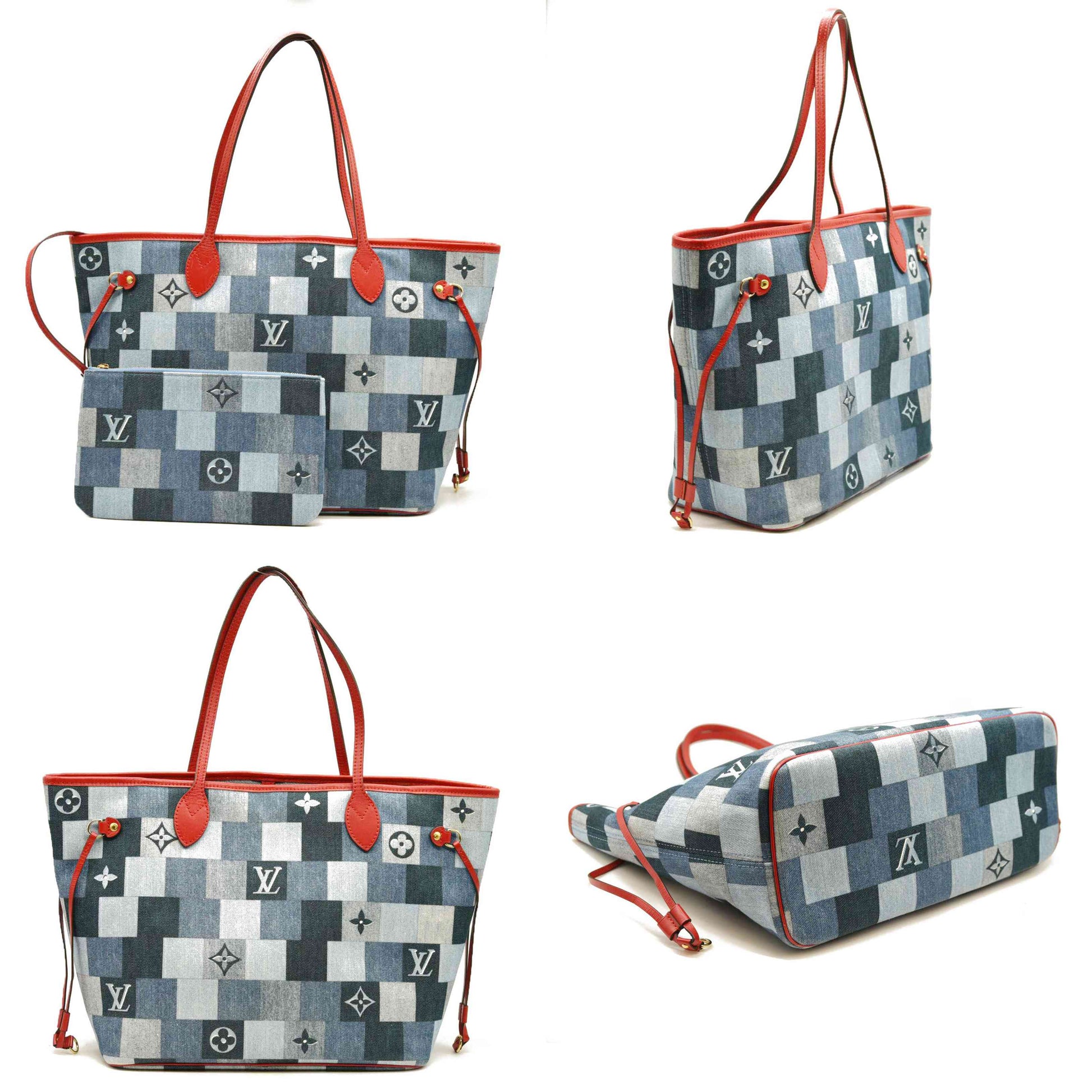 This is an authentic LOUIS VUITTON Denim Damier Monogram Patchwork Neverfull in Bleu and Rouge. This stylish tote is crafted of Louis Vuitton monogram denim in blue. This tote features tall red leather shoulder straps and red leather side cinch straps. The broad top is secured with a brass clasp and opens to a denim fabric interior with a zipper pocket and a matching pochette. This is a chic tote, ideal for everyday use, from Louis Vuitton!