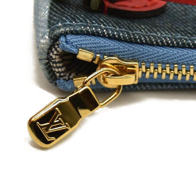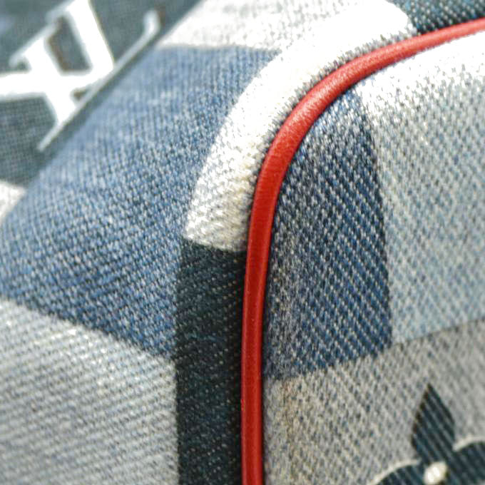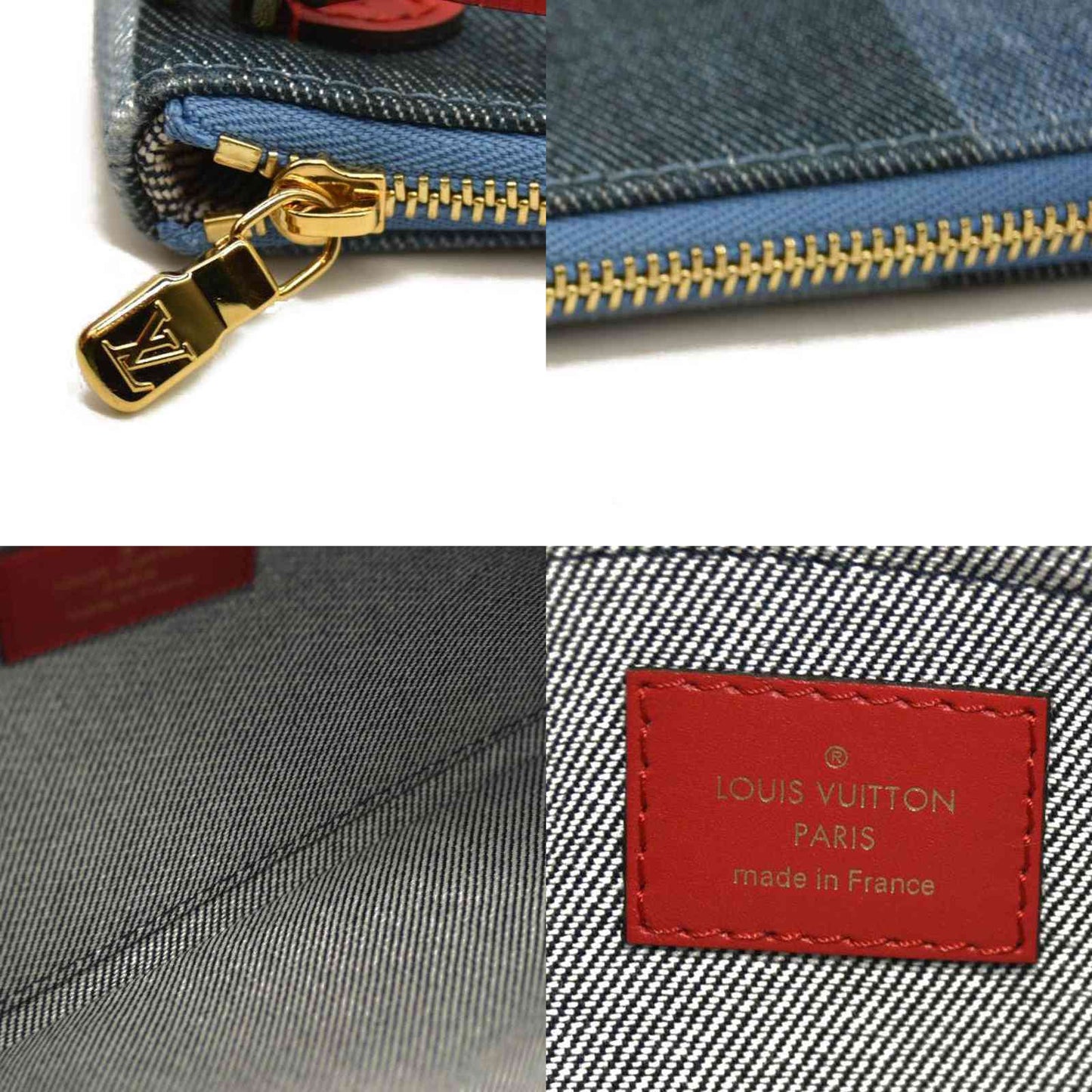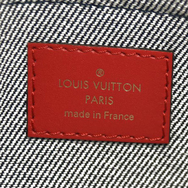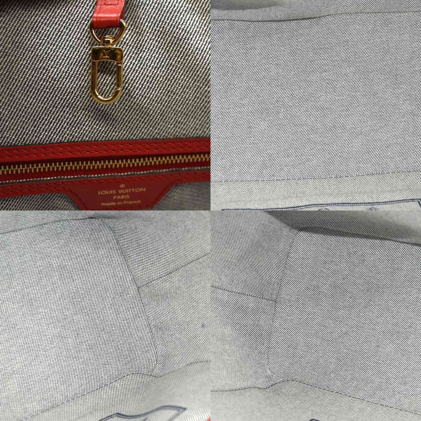 This is an authentic LOUIS VUITTON Denim Damier Monogram Patchwork Neverfull in Bleu and Rouge. This stylish tote is crafted of Louis Vuitton monogram denim in blue. This tote features tall red leather shoulder straps and red leather side cinch straps. The broad top is secured with a brass clasp and opens to a denim fabric interior with a zipper pocket and a matching pochette. This is a chic tote, ideal for everyday use, from Louis Vuitton!