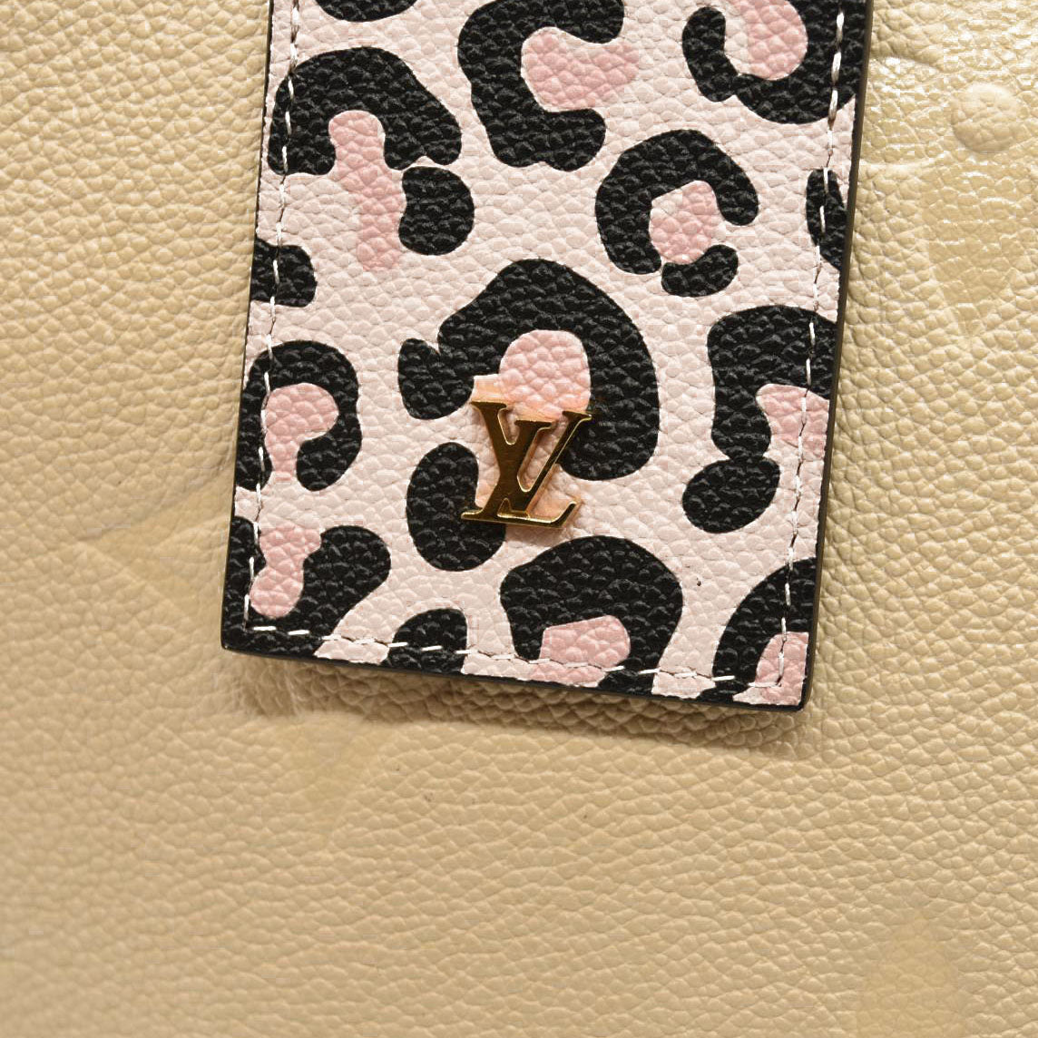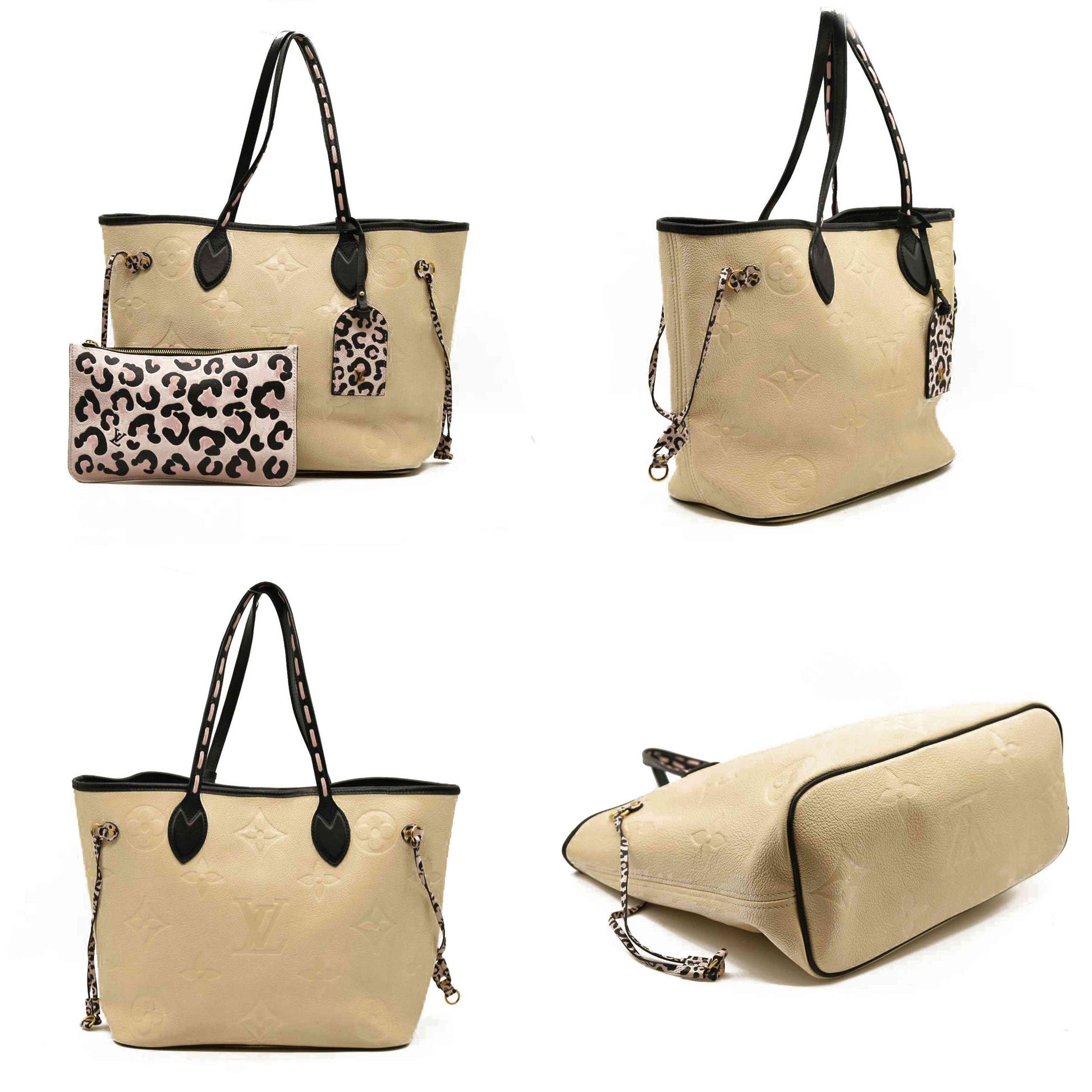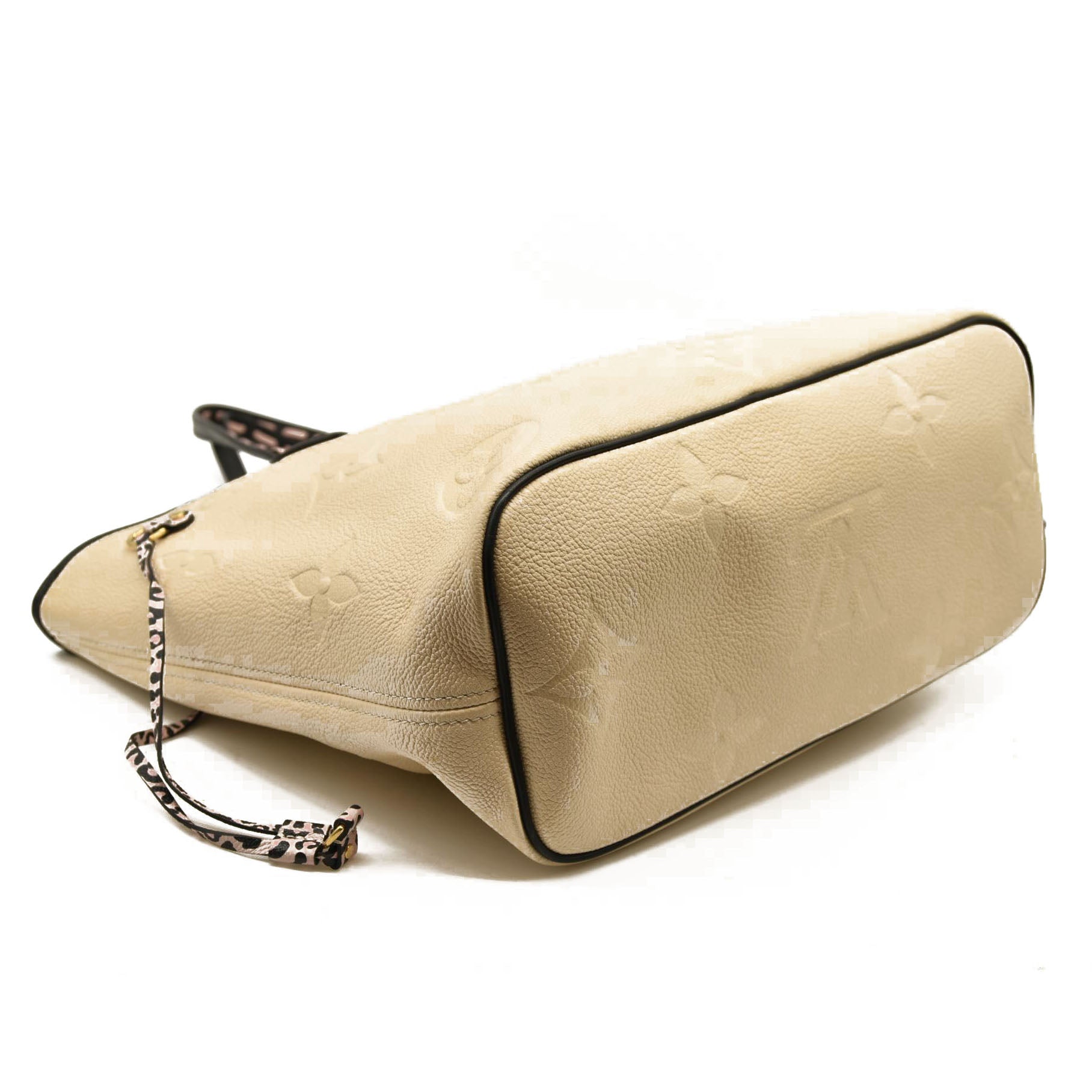 This is an authentic LOUIS VUITTON Empreinte Monogram Giant Wild At Heart Neverfull MM in Creme. This pre-owned luxury tote is part of the Louis Vuitton Fall 2021 “Wild at Heart” collection. This limited edition tote bag is crafted of oversized Louis Vuitton monogram embossed calf leather in ivory. The bag features black with pink leather top handles and polished gold-tone hardware with four leopard print side laces for cinching. The top is open to a spacious black microfiber interior with a hanging zipper pocket and a removable leopard print pochette in pinkish hues. The top can be secured across with a snap strap inlay. The Louis Vuitton Neverfull MM can be carried by hand, in the crook of the arm, or over the shoulder. This is the perfect everyday tote, only from Louis Vuitton!