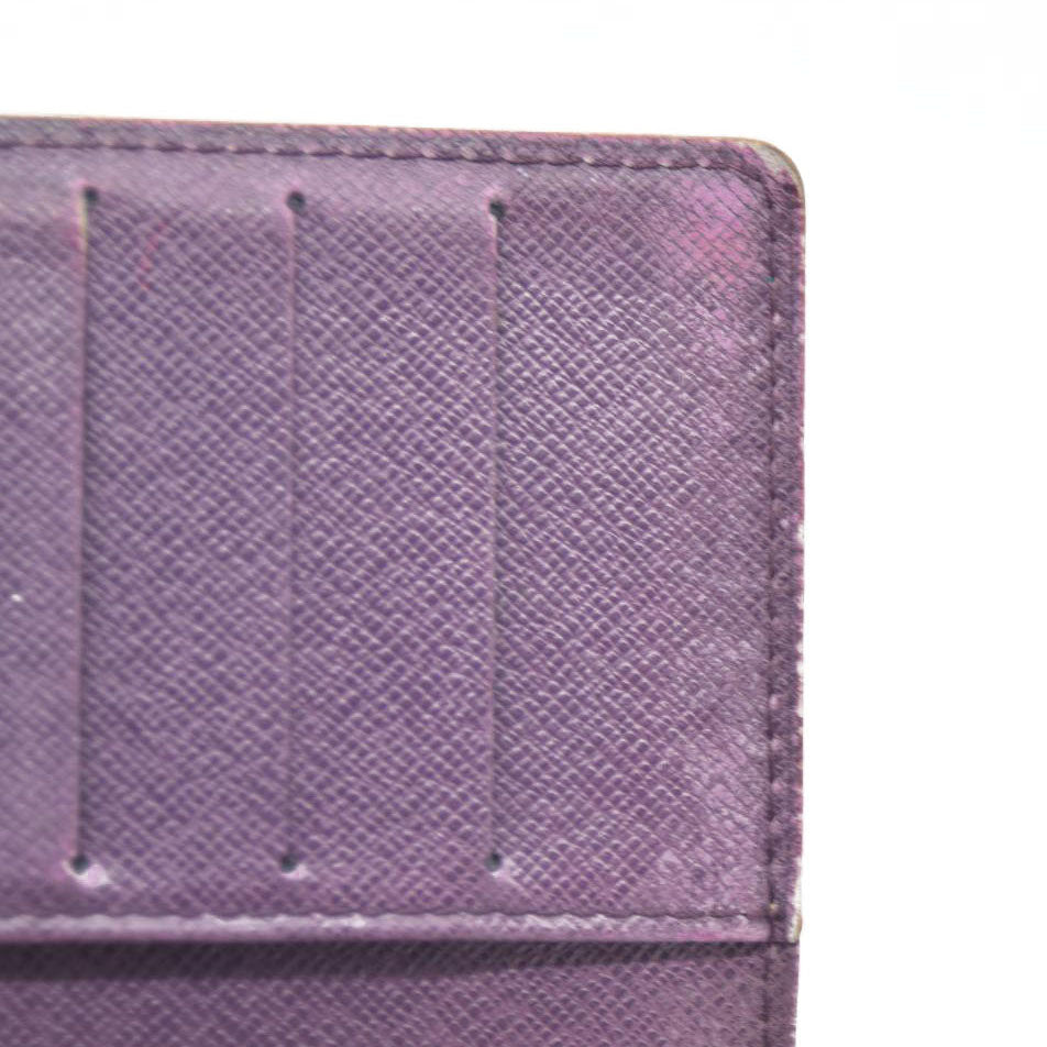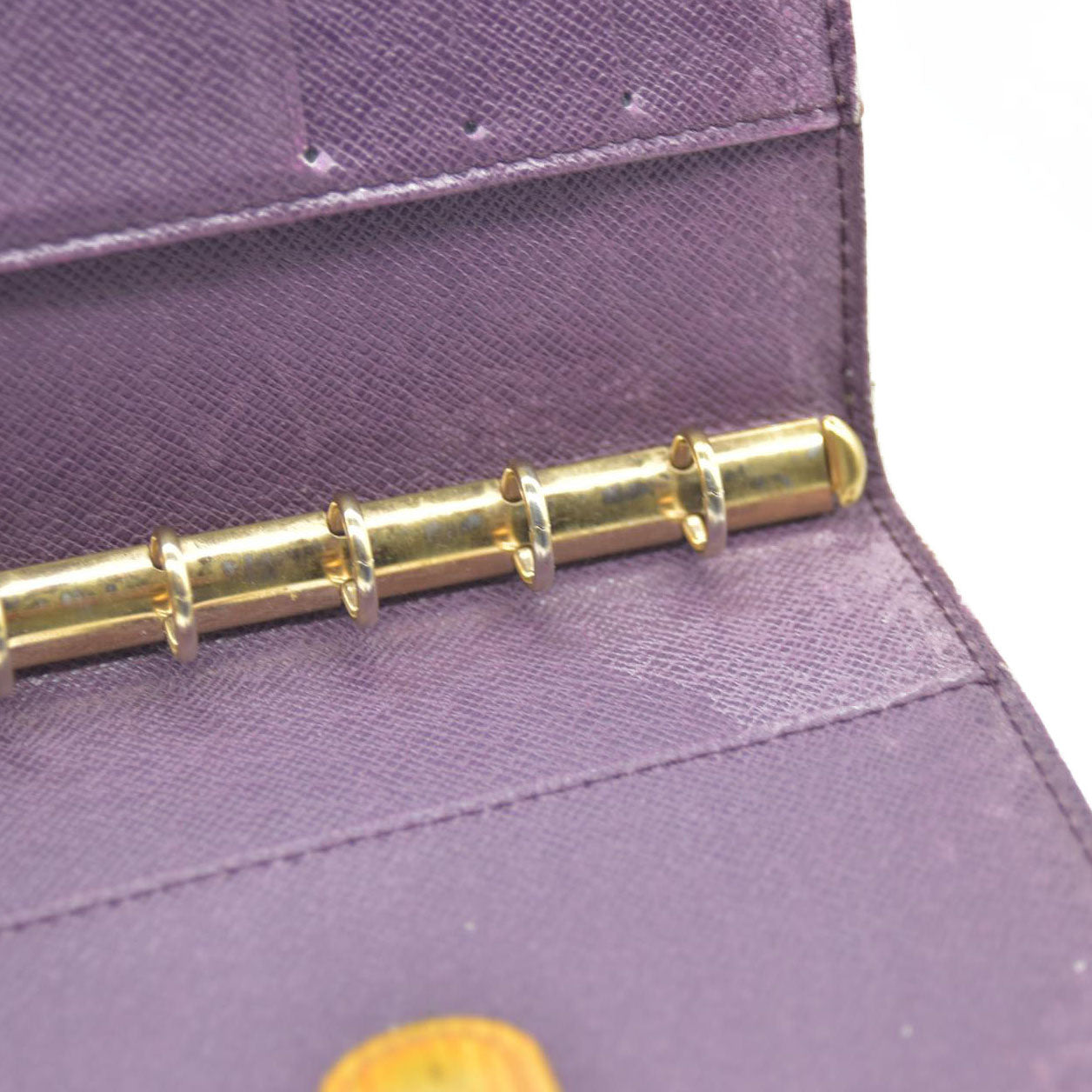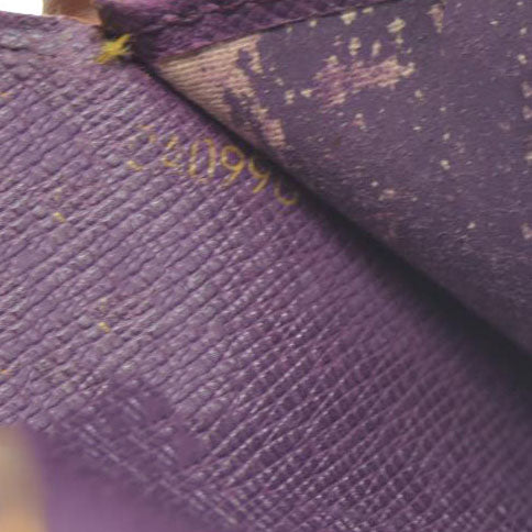 The date code/serial number is rubbed off and unable to be read. The exterior is rubbed with scratches. There are rubbed marks on the inside. The inside of pocket is peeled.