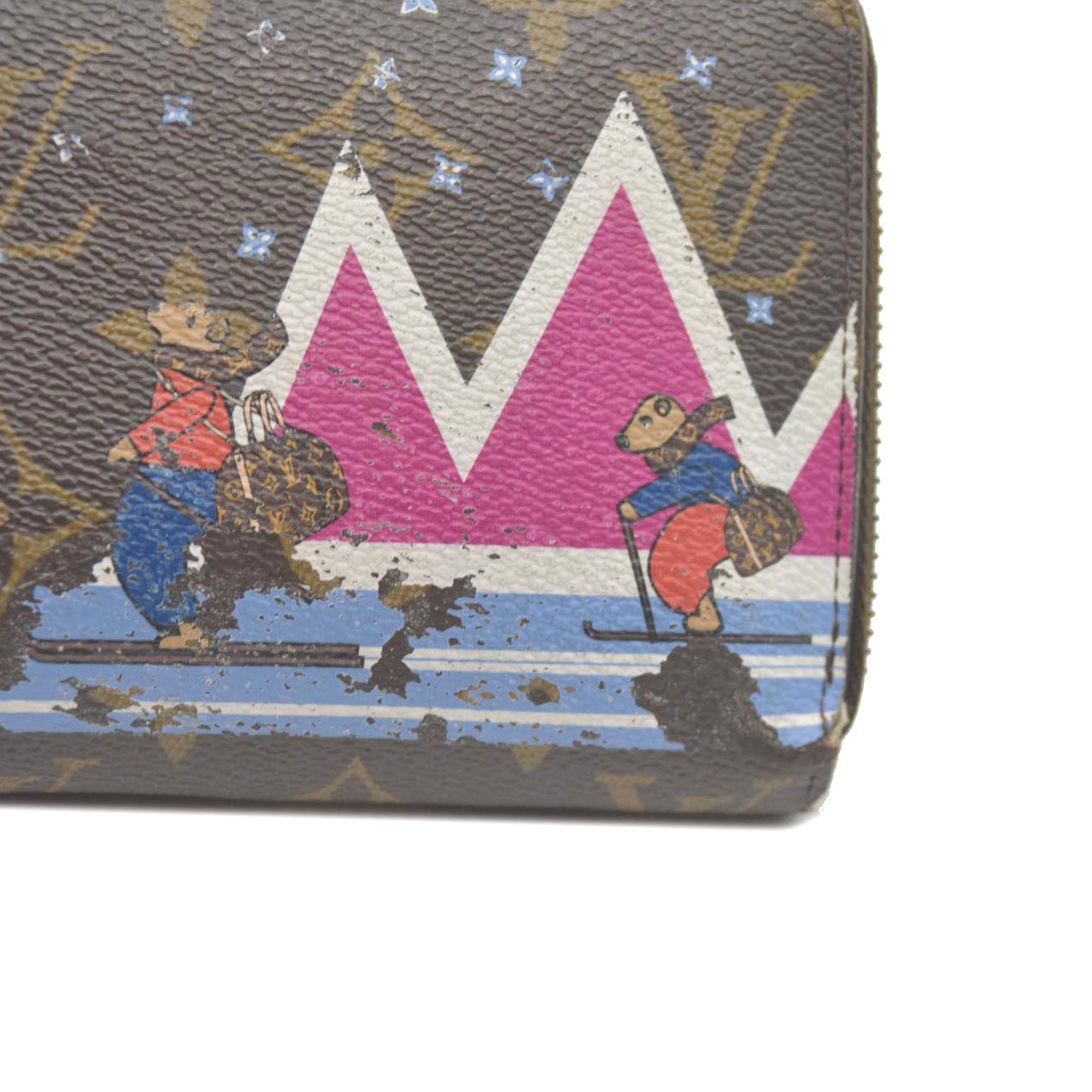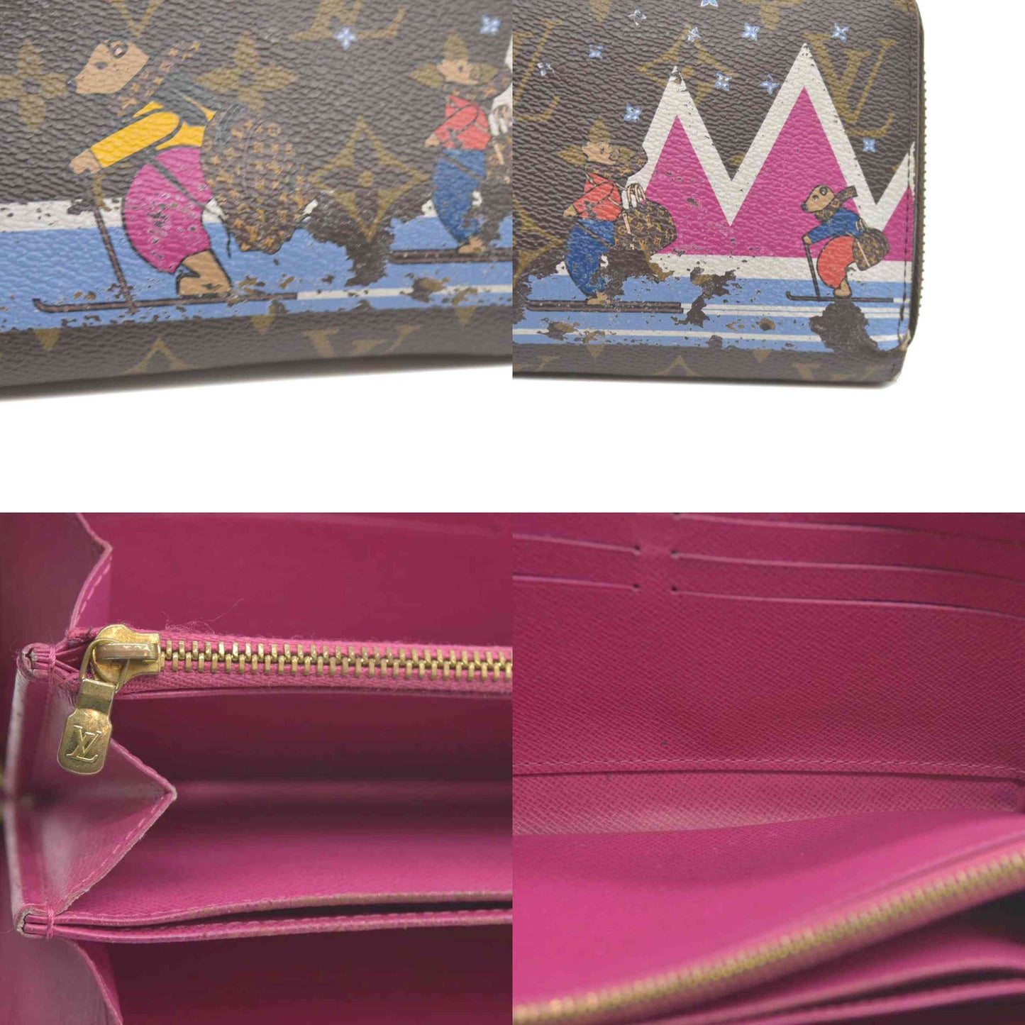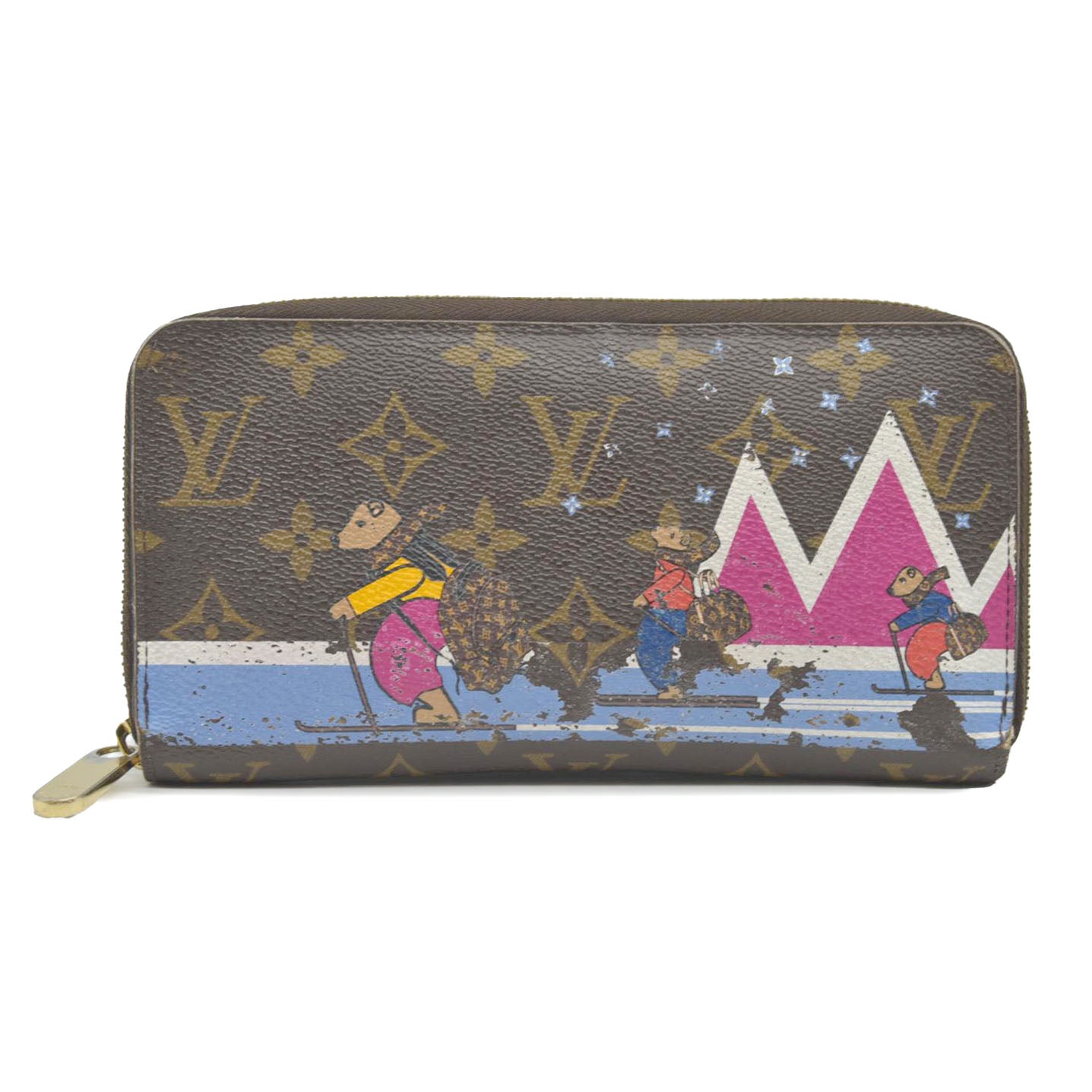 This is the authentic LOUIS VUITTON Monogram Bears Xmas Zippy Wallet. This classic wallet is crafted of traditional monogram coated canvas that features a whimsical overlay of bears skiing while they carry Louis Vuitton handbags. The polished brass wrap-around zipper opens the wallet to a partitioned bright pink cross grain leather interior with a zipper compartment, patch pockets, and card slots. This is an excellent everyday wallet for keeping contents close at hand, from Louis Vuitton