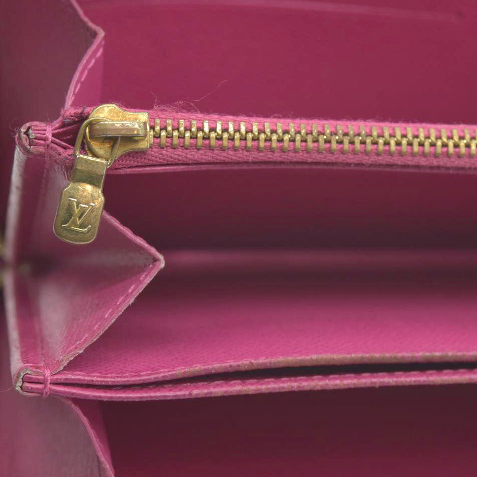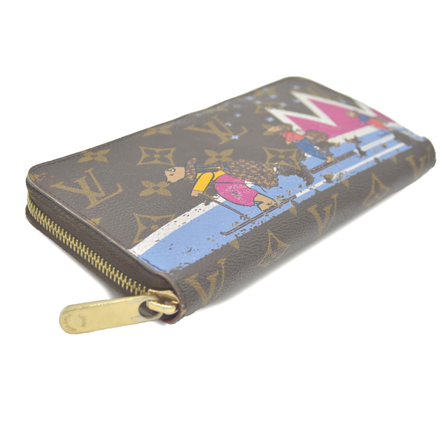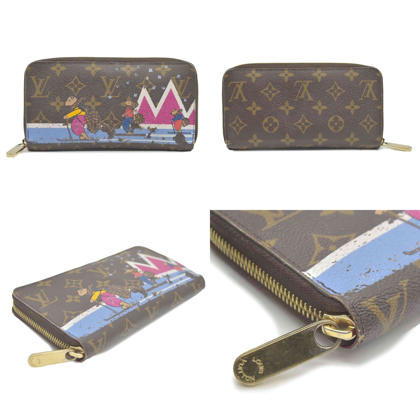 This is the authentic LOUIS VUITTON Monogram Bears Xmas Zippy Wallet. This classic wallet is crafted of traditional monogram coated canvas that features a whimsical overlay of bears skiing while they carry Louis Vuitton handbags. The polished brass wrap-around zipper opens the wallet to a partitioned bright pink cross grain leather interior with a zipper compartment, patch pockets, and card slots. This is an excellent everyday wallet for keeping contents close at hand, from Louis Vuitton