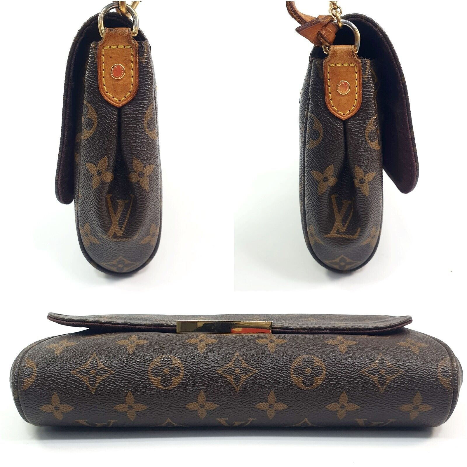 This is an authentic OUIS VUITTON Monogram Favorite MM. This stylish wrist bag is crafted of Louis Vuitton monogram coated canvas. The bag features a short gold chain end to end wrist strap and a cross over flap. This opens to a plum fabric interior. This is an excellent baguette, ideal for everyday essentials, from Louis Vuitton!