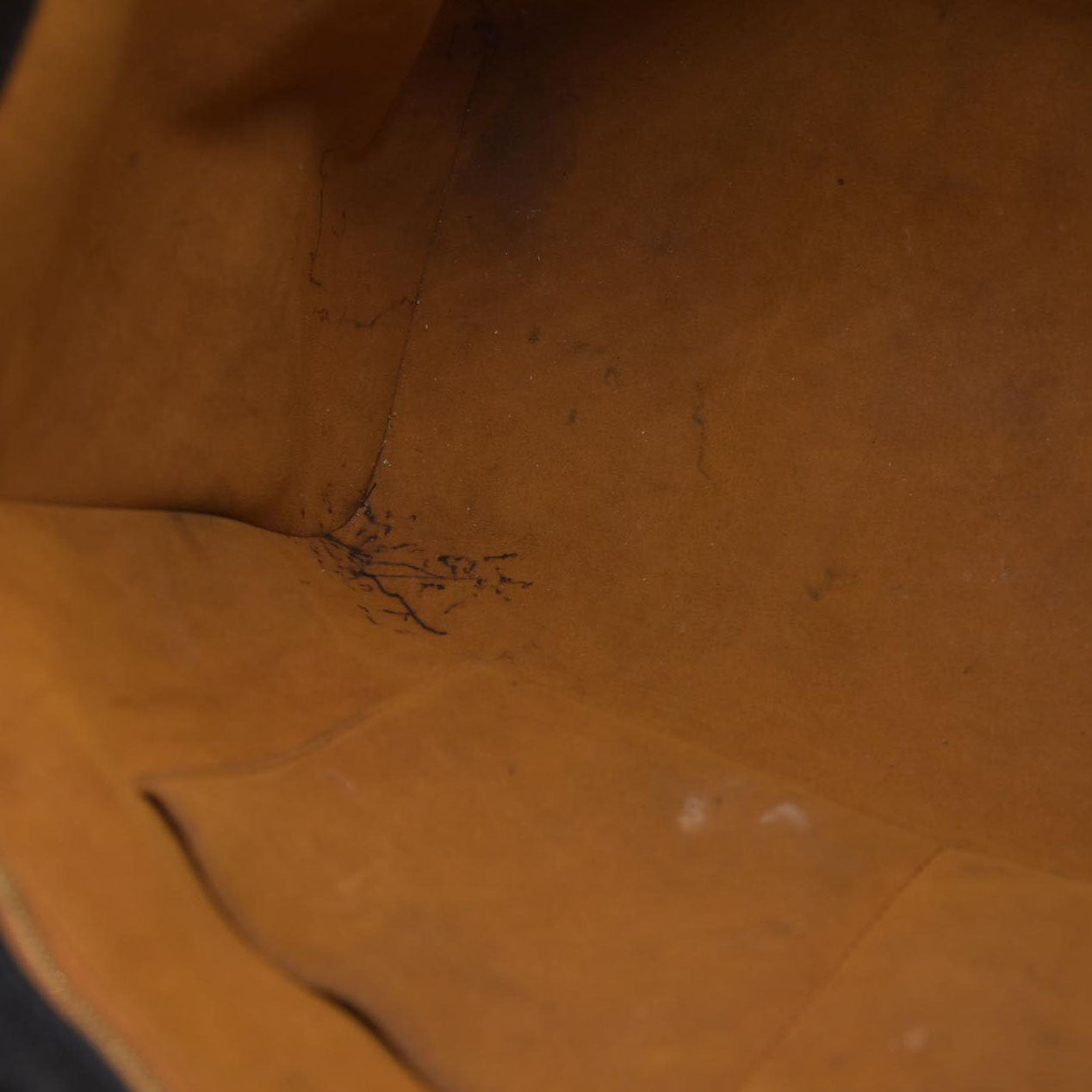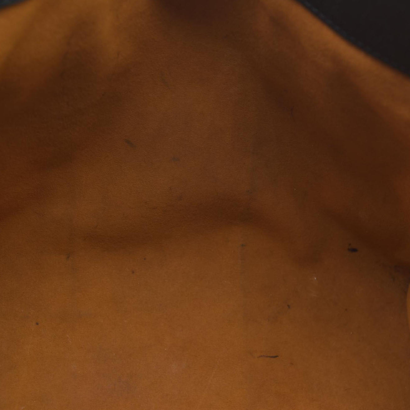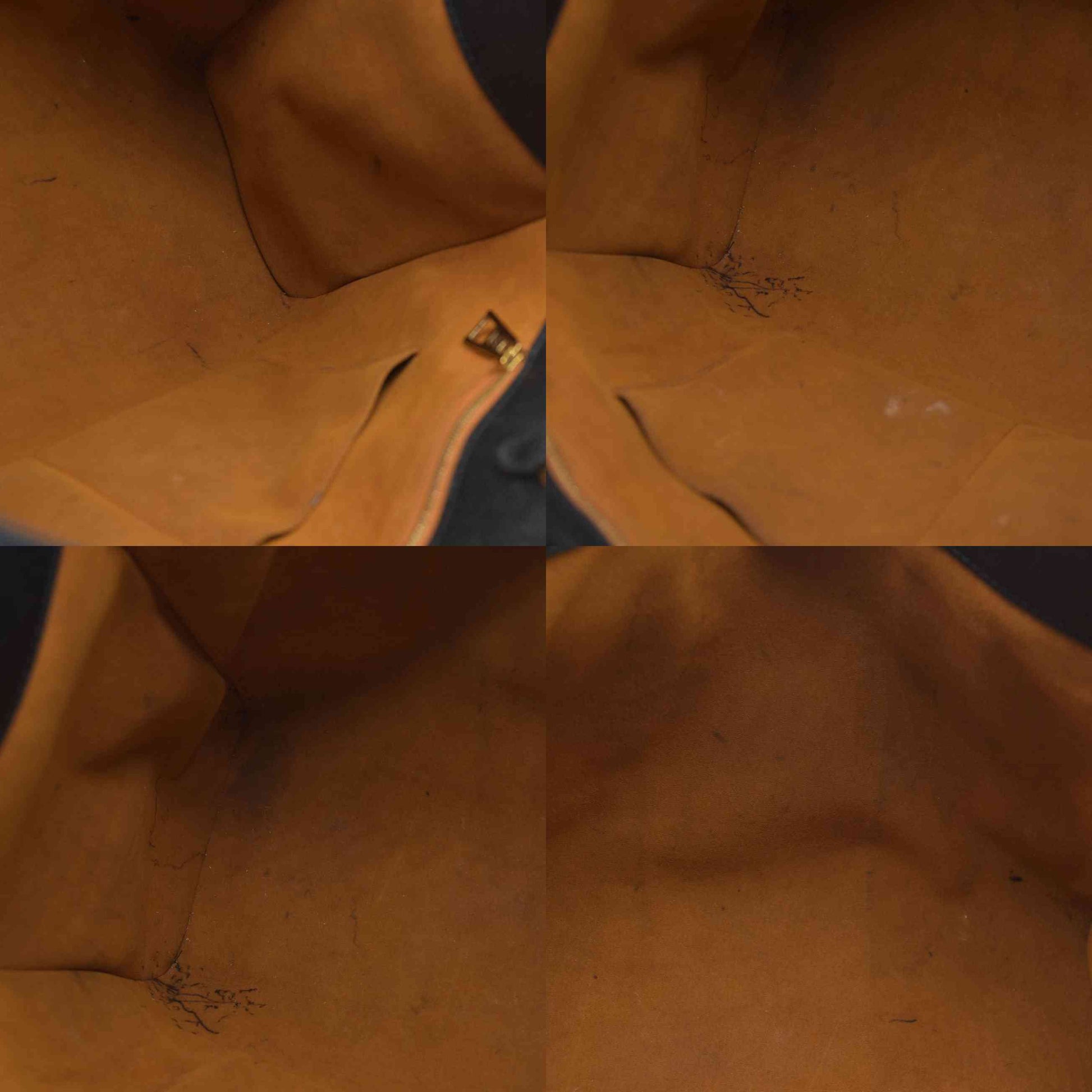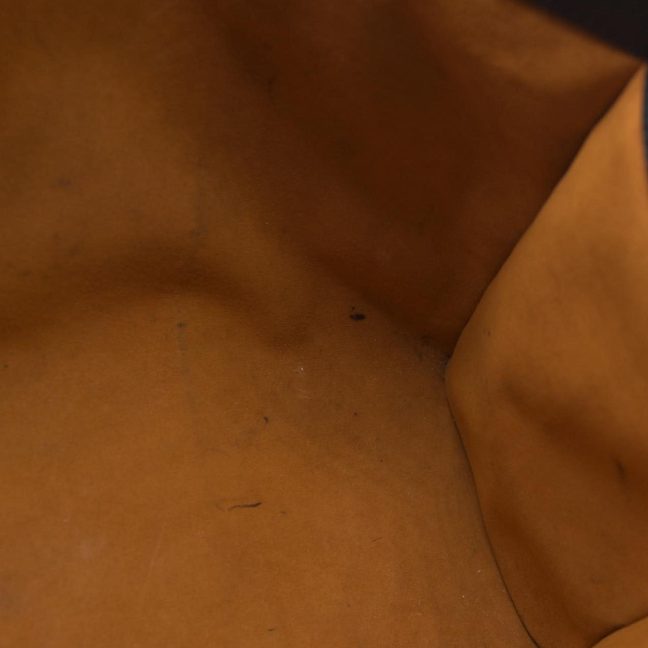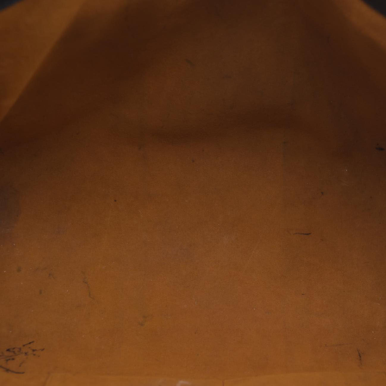 Heavy residue at exterior; moderate discoloration and marking at interior; minor scratches and patina at hardware; shape has relaxed due to wear.