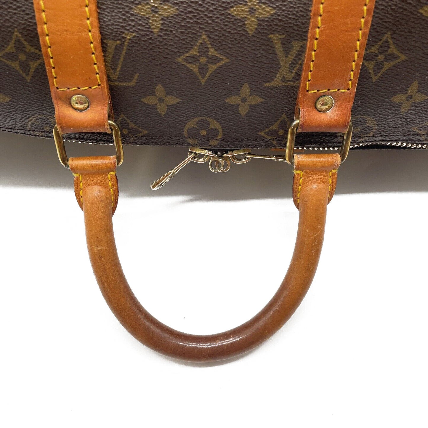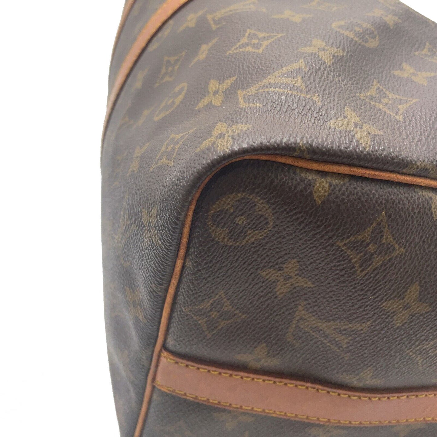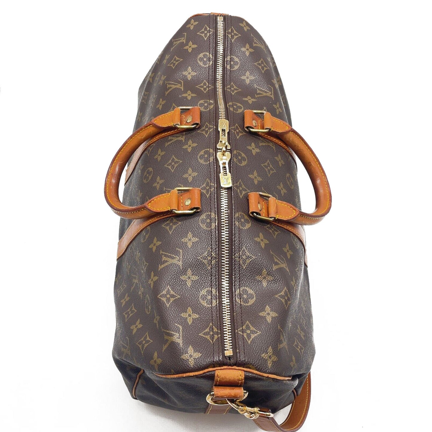 This is an authentic LOUIS VUITTON Monogram Keepall Bandouliere 45. This circa 1990 large sized travel duffel is crafted of signature Louis Vuitton monogram on toile canvas. The shoulder bag features natural vachetta leather rolled top handles, an optional adjustable shoulder strap, vachetta trim and brass hardware. The top zippers open to a spacious cocoa brown fabric interior. This is a remarkable tote, ideal for weekend travel or as a carry-on, from Louis Vuitton!
