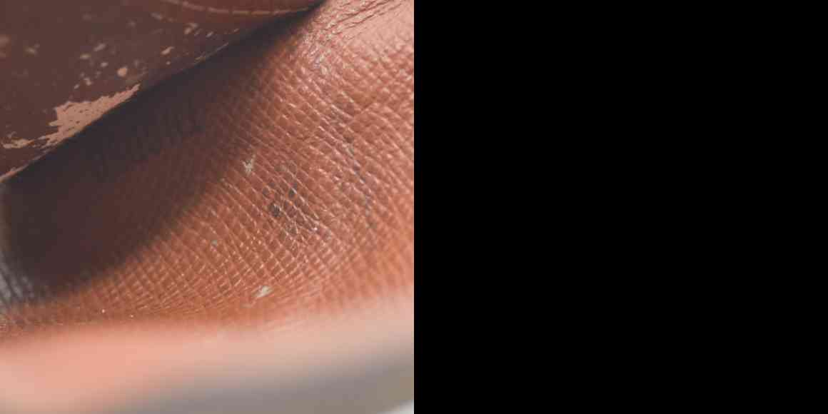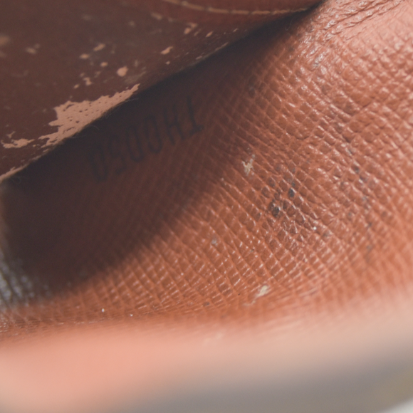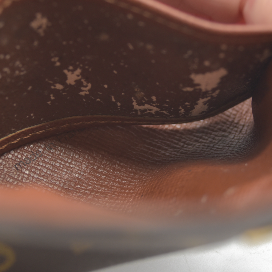 The exterior is rubbed with scratches. There are loose stitches around the folding area. There are rubbed marks on the inside. The inside is peeled.