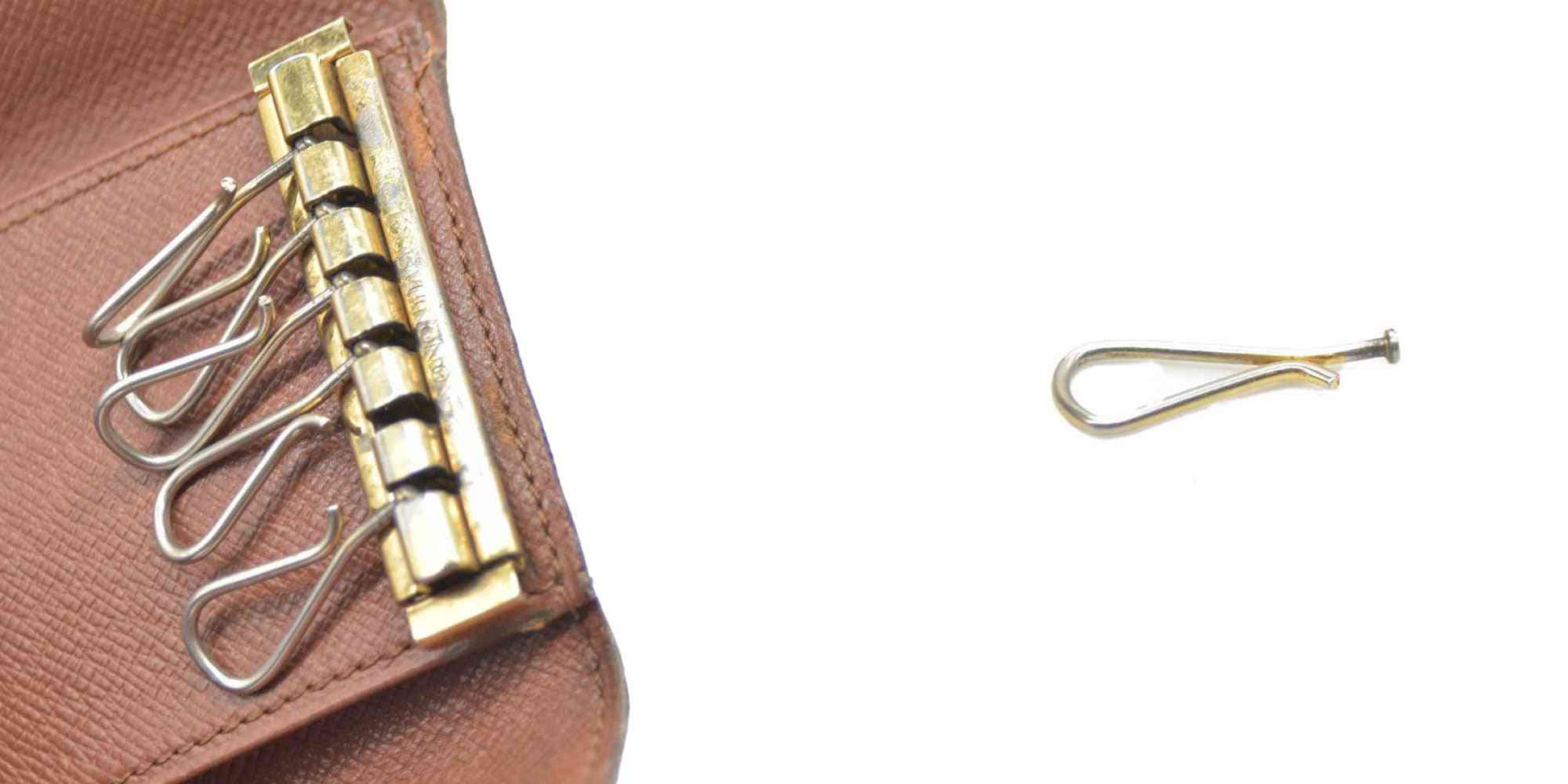 The exterior is rubbed with scratches. There are rubbed marks on the inside. The surface platings of the hardware is peeling off, one ring broken off. one broken key ring.