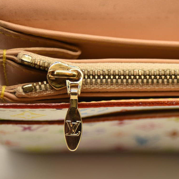 This is an authentic LOUIS VUITTON Multicolor Sarah Wallet in White. This accessory is crafted of Louis Vuitton monogram Multicolor on toile canvas. This frontal flap opens with a snap in an accordion style to a leather interior with a zipper coin compartment, billfolds and card slots. This is an excellent clutch wallet for everyday use, from Louis Vuitton!