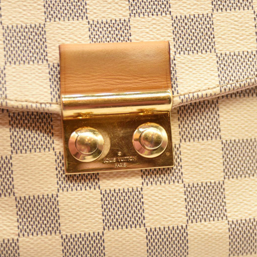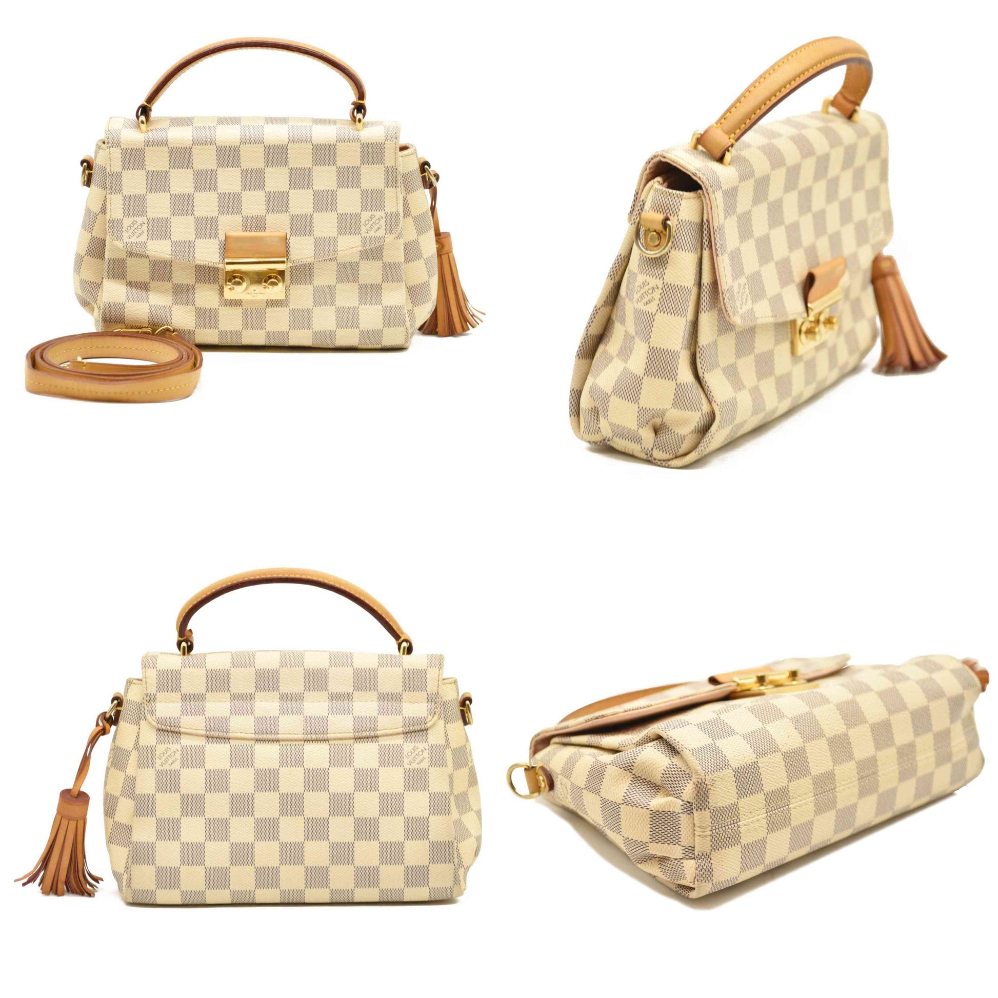 This is an authentic LOUIS VUITTON Damier Azur Croisette. This compact tote is crafted of Louis Vuitton Damier coated canvas in blue and white. The bag features signature vachetta cowhide leather trim including a top handle with a removable tassel, and an optional shoulder strap with gold plated hardware. The crossover flap opens with a push lock to a ballerina pink fabric interior with a patch pocket.