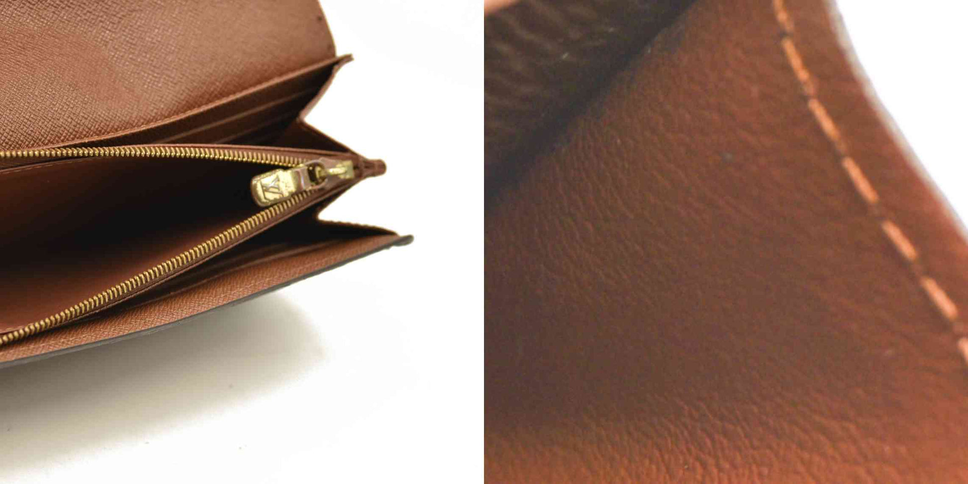 The exterior is rubbed with scratches. There are loose stitches around the folding area. There are rubbed marks on the inside. Color loss on exterior. Edge wear. Creases in interior.