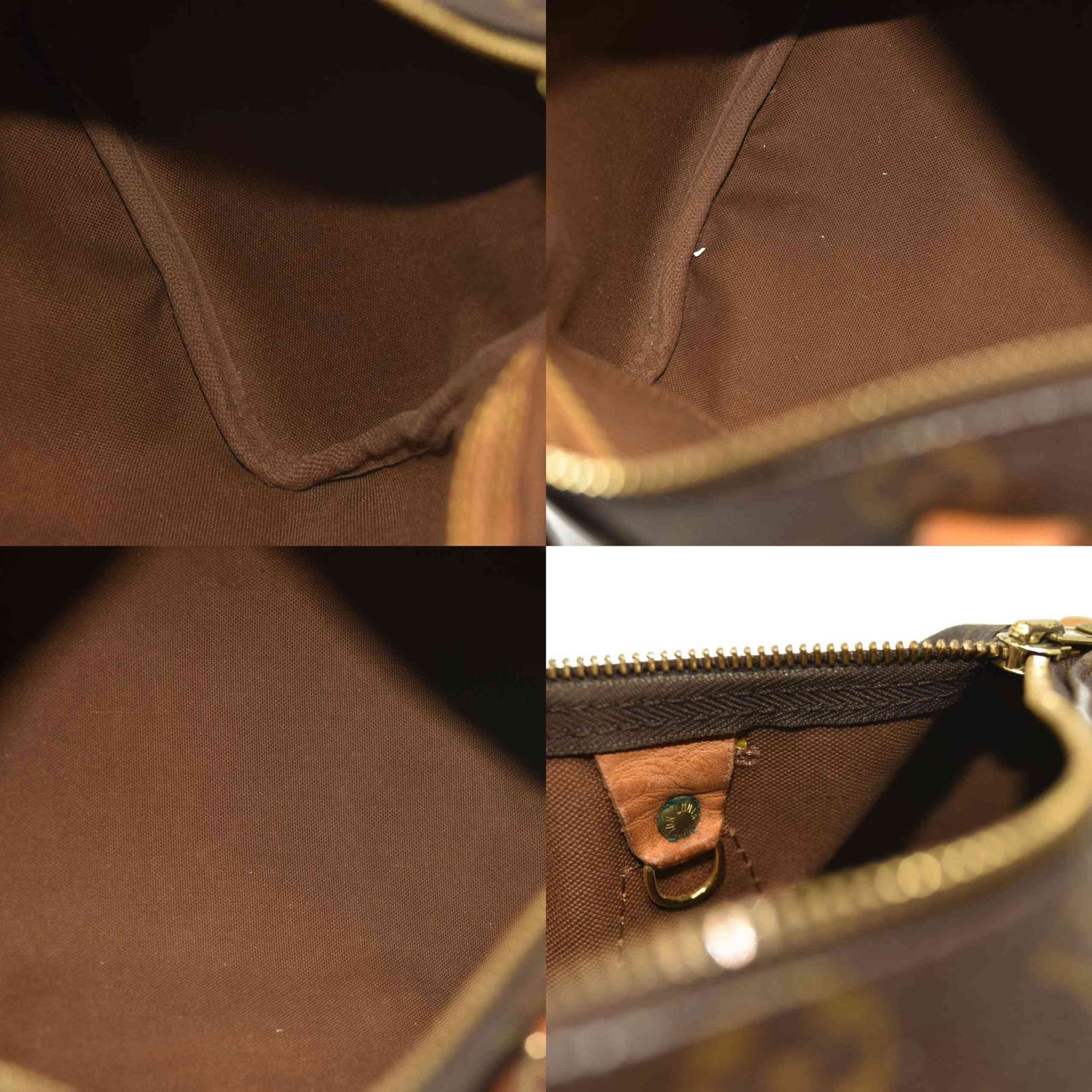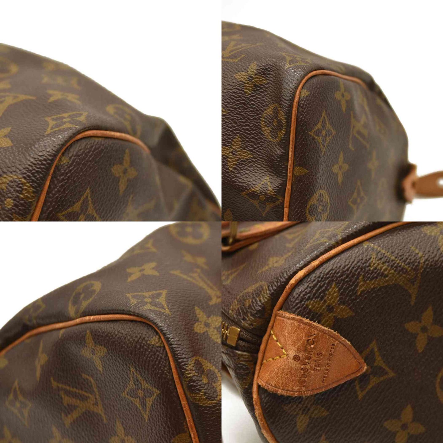 [Outside] overall : small scratches / lightly soiled / obviously losing shape / metal coat peeling and partially rusted bottom : Noticeable corner wear, but no tears. handle : obvious rubbing / darkening / cracks main opening : Slightly rubbed corners cowhide leather : obvious rain stains / discoloration into brown due to tanning