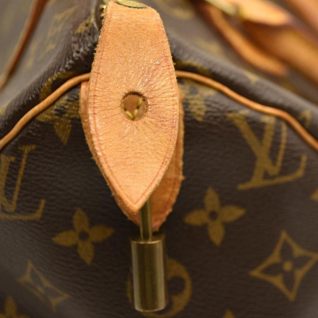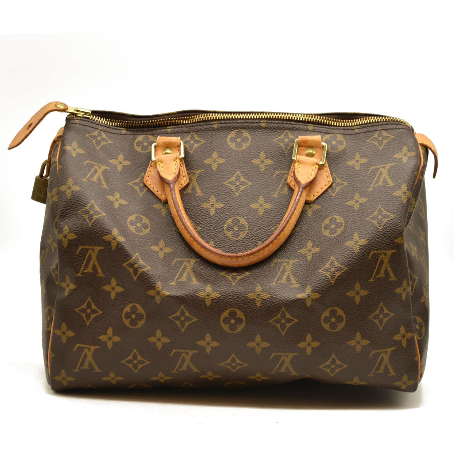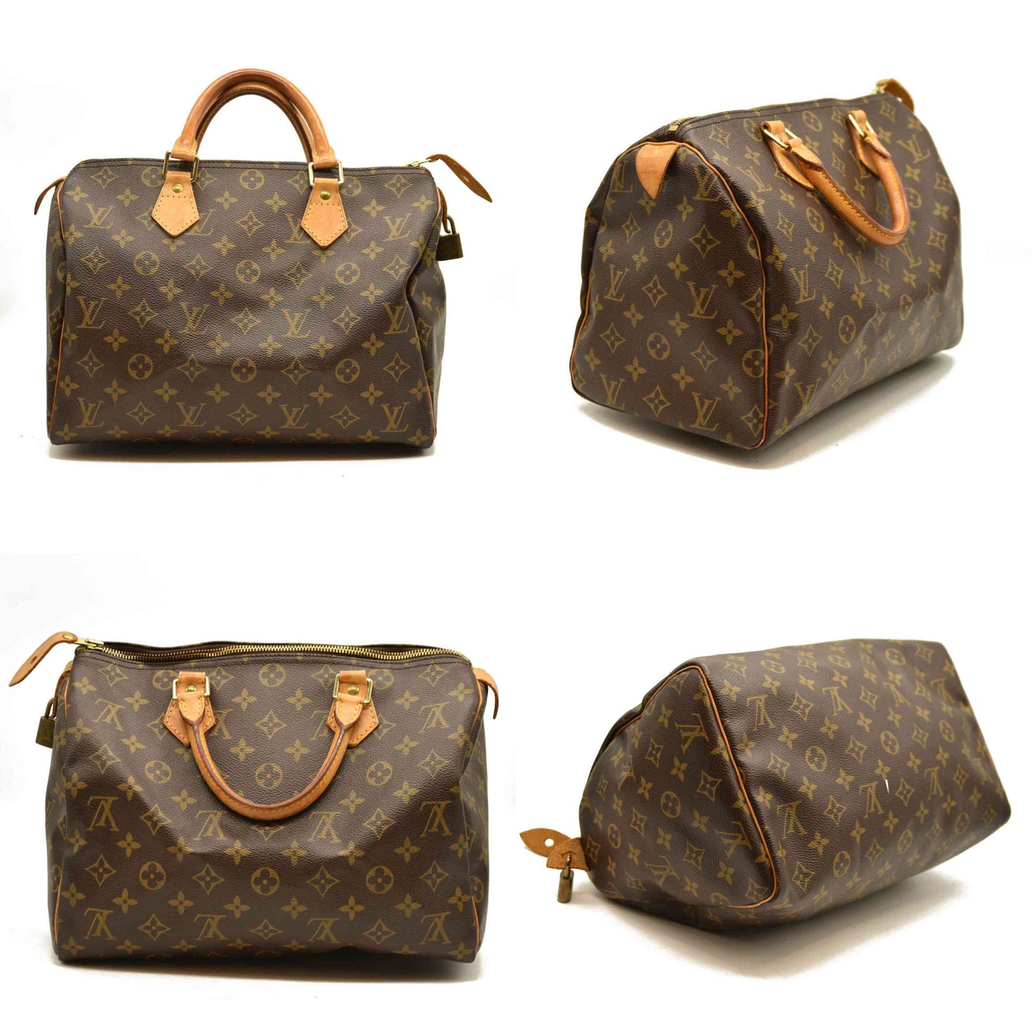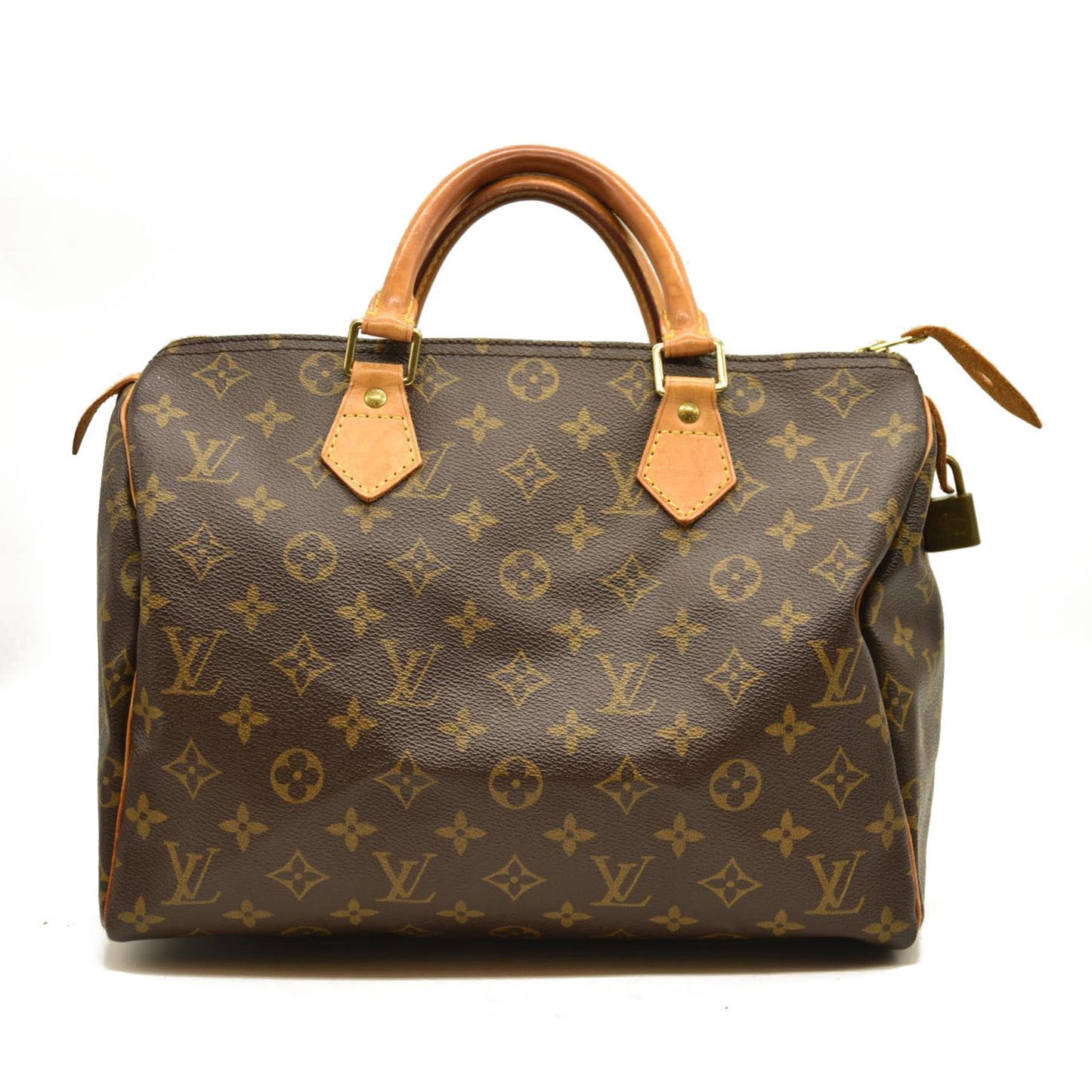 This is an authentic LOUIS VUITTON Monogram Speedy 30. This classic handbag is crafted of traditional Louis Vuitton monogram toile coated dark brown canvas. The bag features vachetta cowhide rolled leather top handles and trim with polished brass hardware The top zipper opens to a cocoa brown fabric interior with a hanging patch pocket.