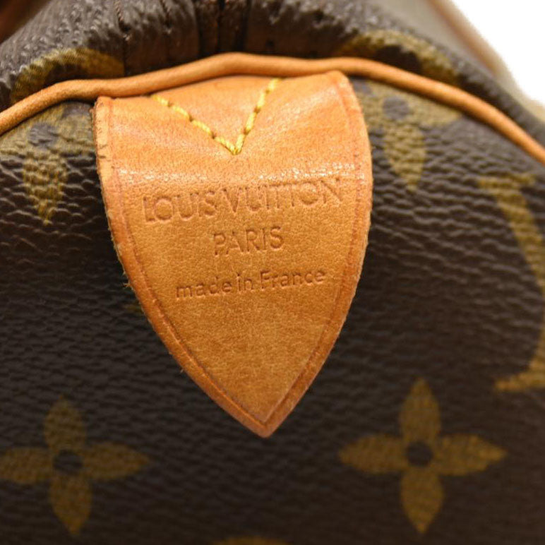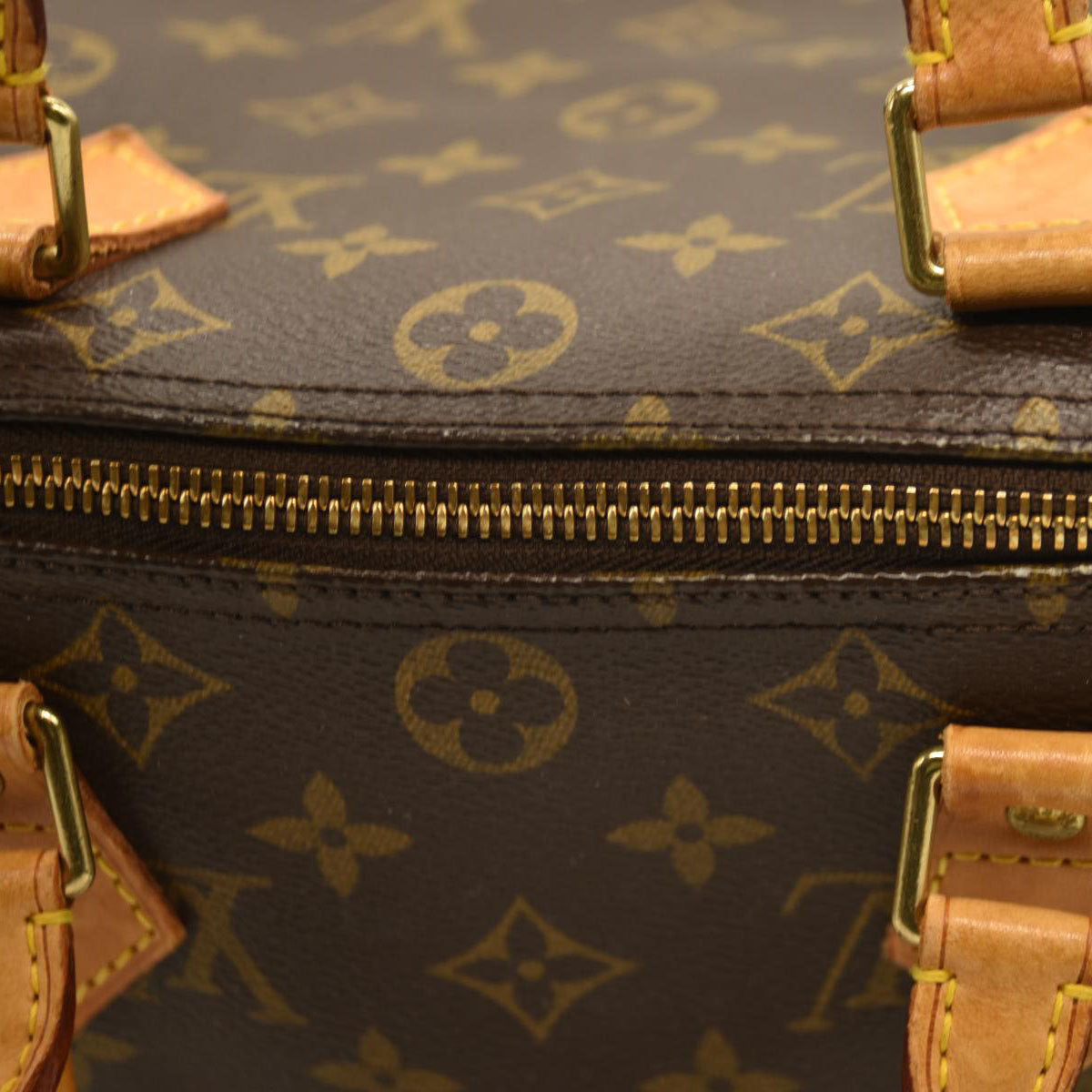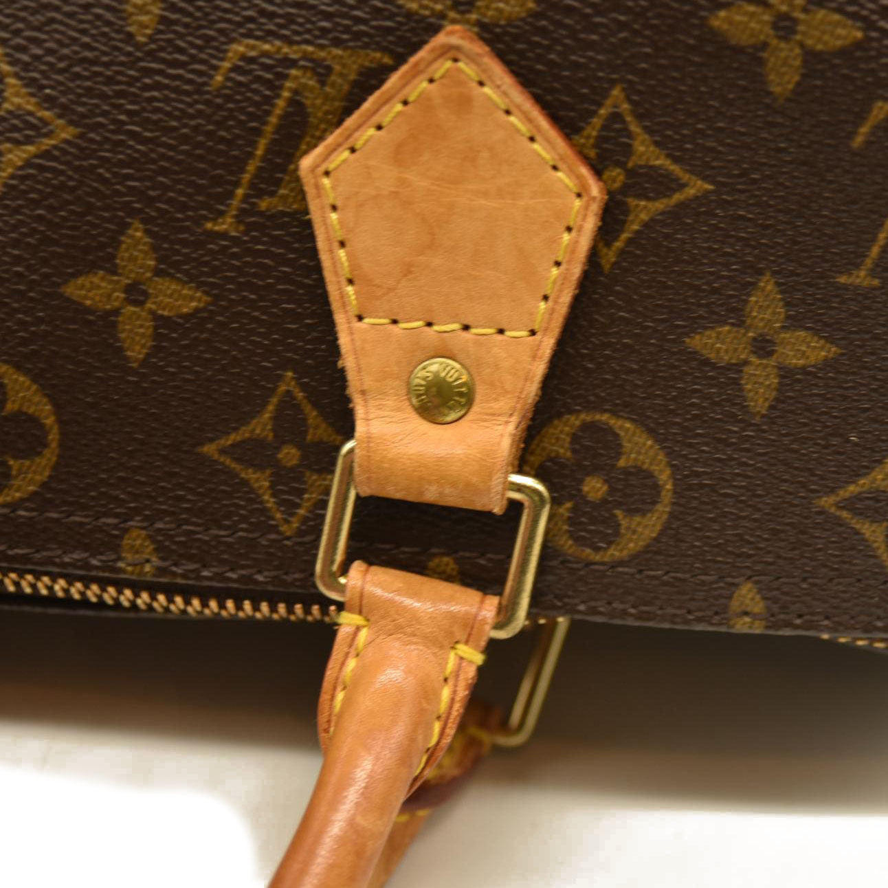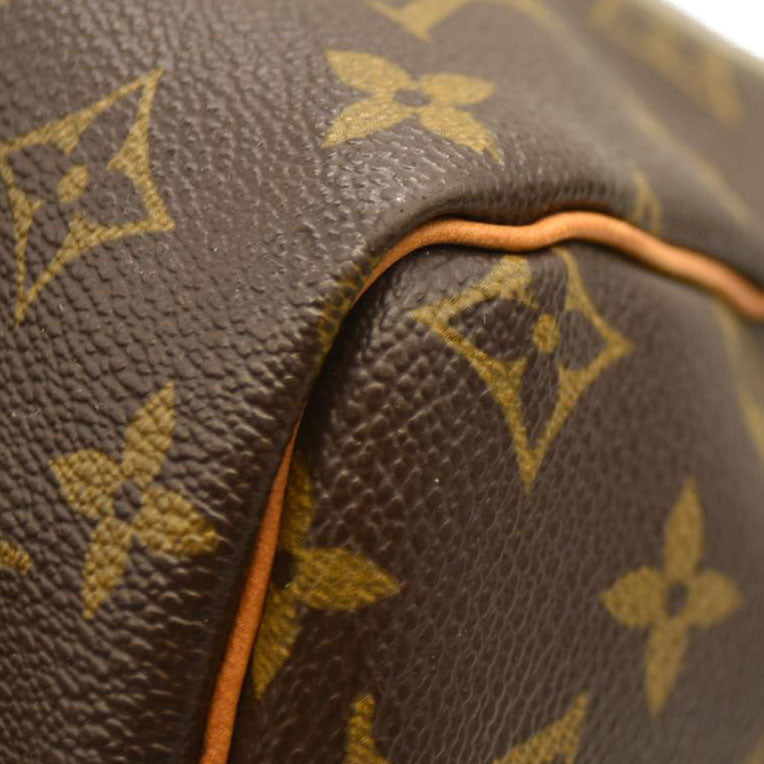 This is an authentic LOUIS VUITTON Monogram Speedy 30. This classic handbag is crafted of traditional Louis Vuitton monogram toile coated dark brown canvas. The bag features vachetta cowhide rolled leather top handles and trim with polished brass hardware The top zipper opens to a cocoa brown fabric interior with a hanging patch pocket.
