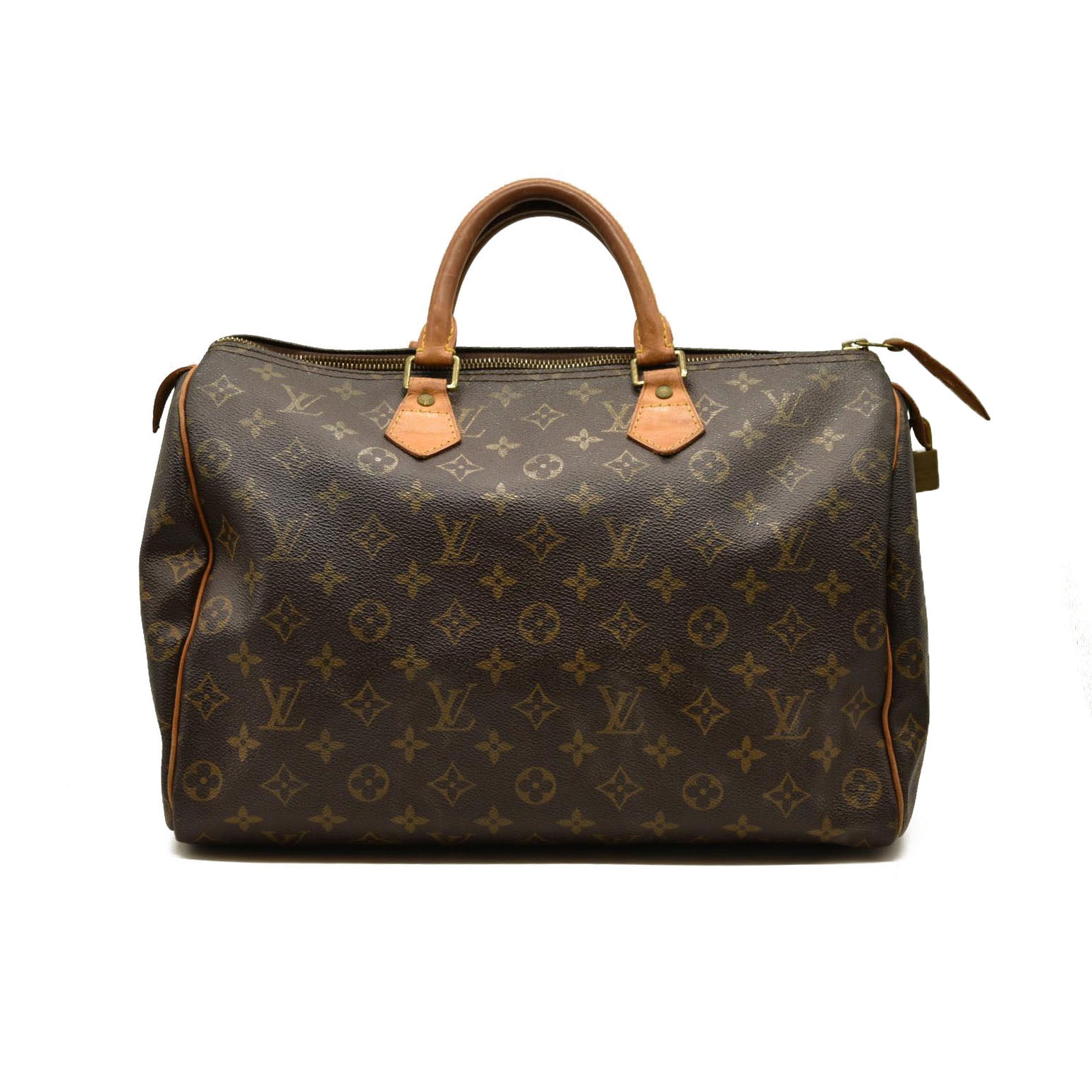 This is an authentic LOUIS VUITTON Monogram Speedy 35. This stylish tote bag is finely crafted of signature Louis Vuitton monogram coated canvas and features vachetta cowhide rolled leather top handles and trim with polished brass hardware. This bag includes a padlock and key. The top zipper opens to a complimentary cocoa brown fabric interior with a patch pocket. This is a classic handbag that is ideal for everyday with the luxury and style, from Louis Vuitton!
