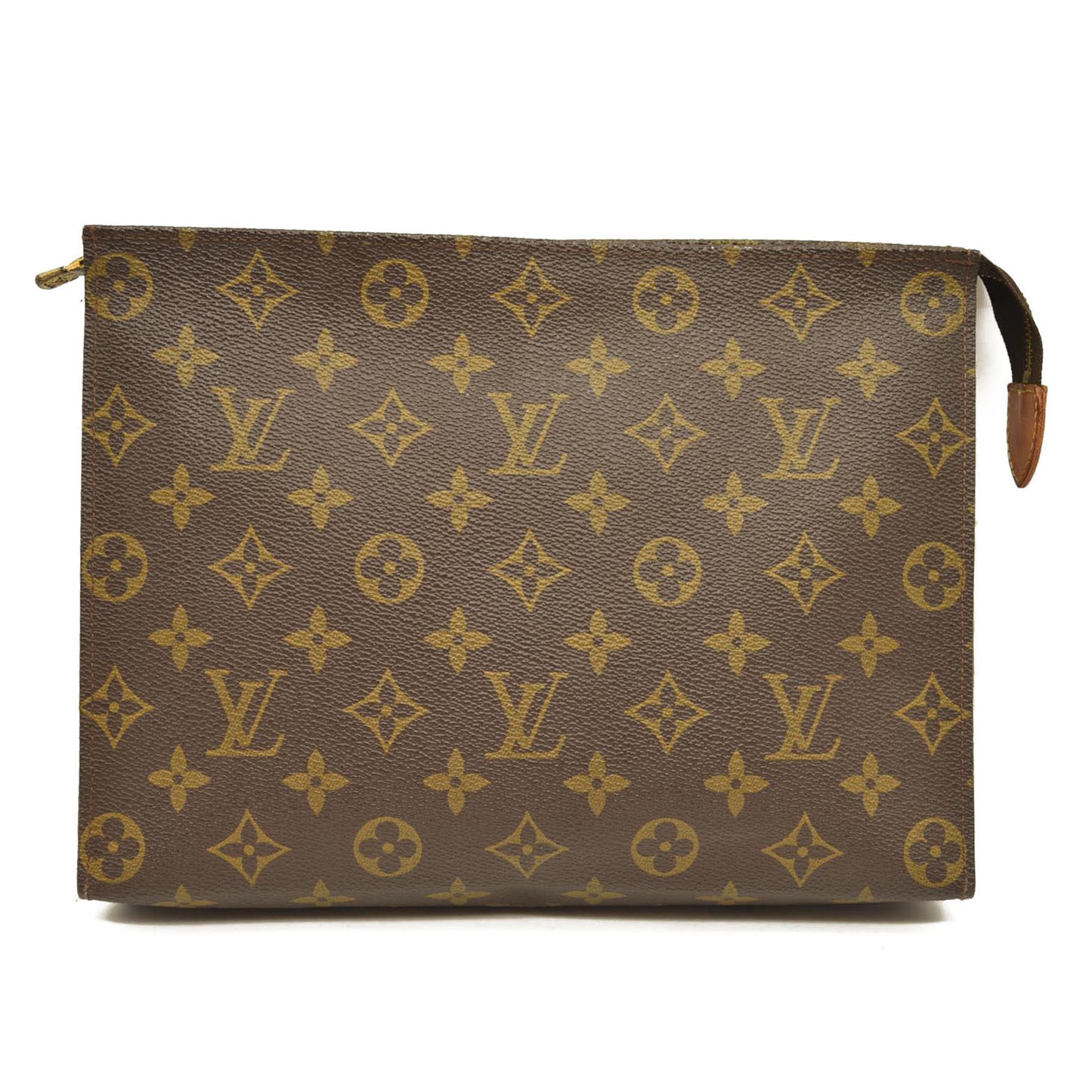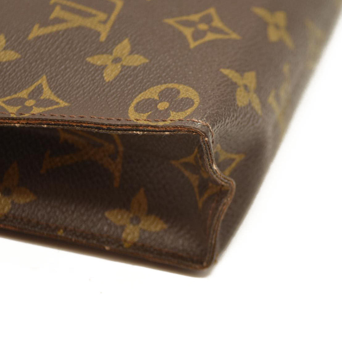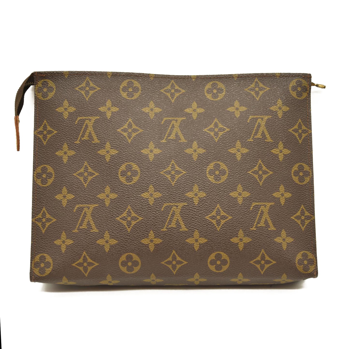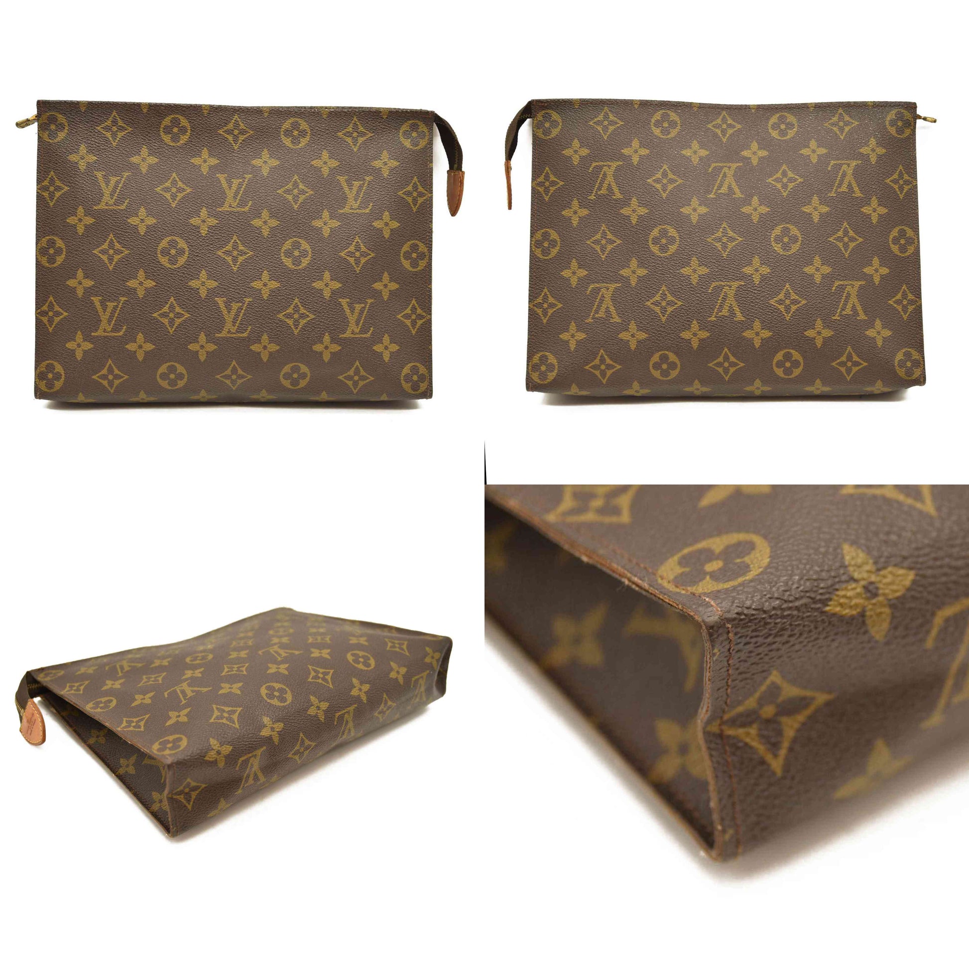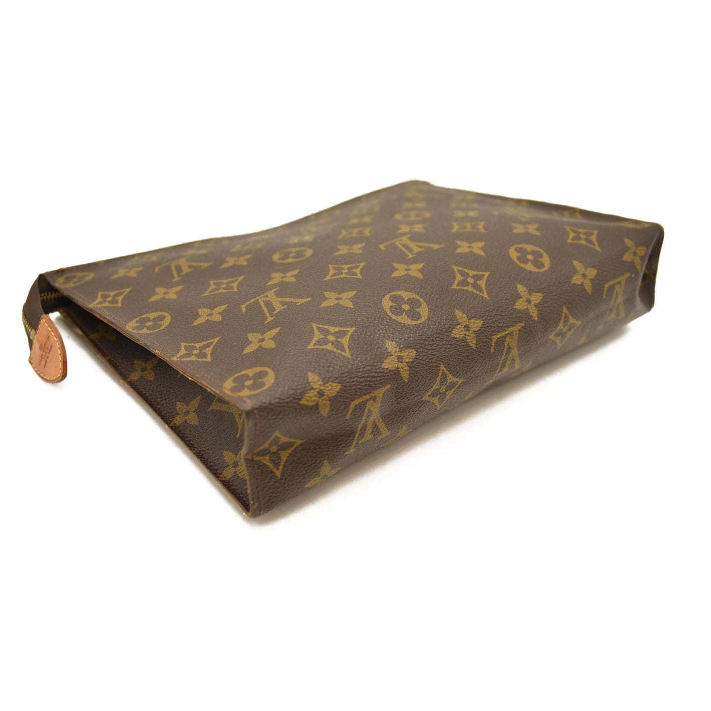 This is an authentic LOUIS VUITTON Monogram Toiletry Pouch 26. This handy travel accessory is crafted of traditional Louis Vuitton monogram on toile coated canvas. The pouch features a top overextended zipper that opens to a spacious vintage brown interior.