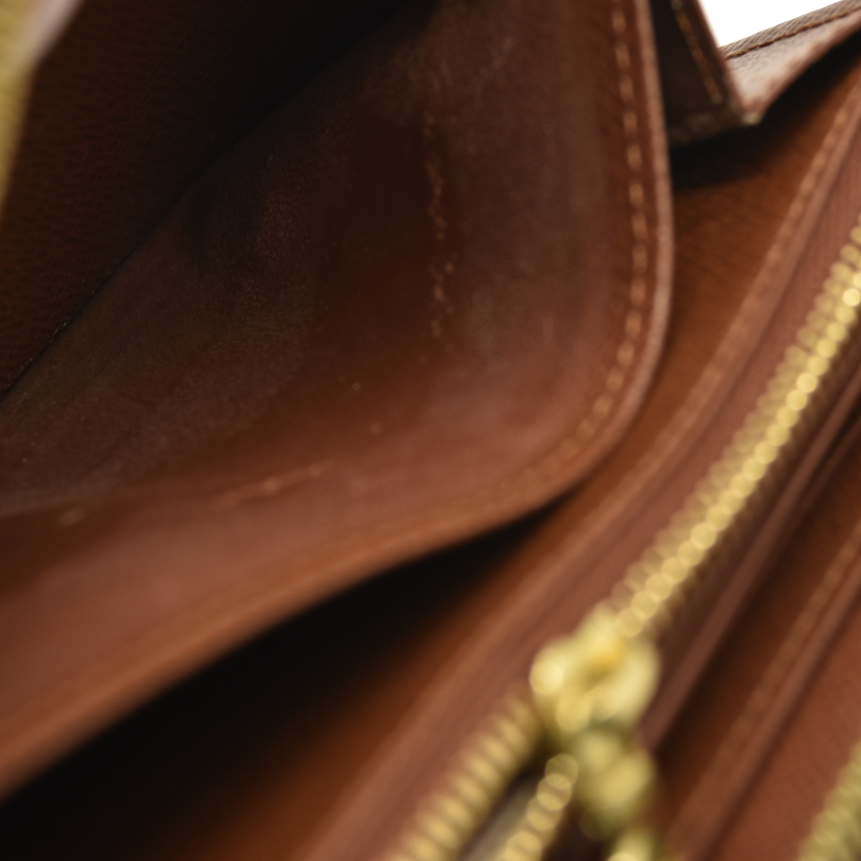 This is an authentic LOUIS VUITTON Monogram Zippy Wallet. This stylish wallet is crafted of Louis Vuitton monogram-coated canvas. It features a 3/4 wrap-around polished gold zipper that opens to a partitioned brown cross-grain leather interior with patch pockets, card slots, and a zipper compartment.