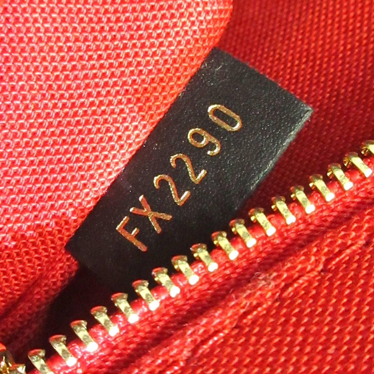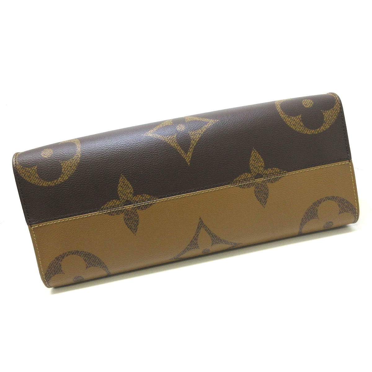 This is an authentic LOUIS VUITTON Reverse Monogram Giant Onthego MM. This limited edition tote features oversized and smaller versions of the classic Louis Vuitton monogram printed in brown on coated canvas in beige. The bag features rolled top handles and long shoulder straps that can be tucked away inside the bag, accented with polished brass hardware. The top is open to a spacious red fabric interior with zipper and patch pockets.