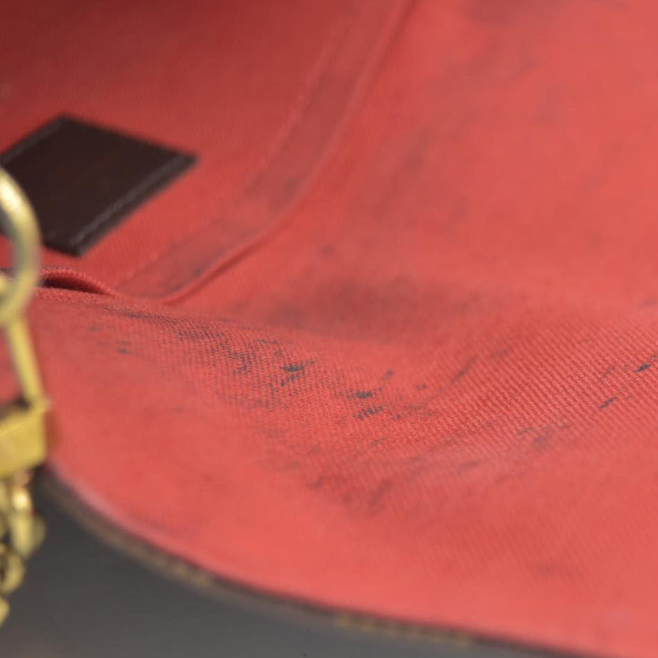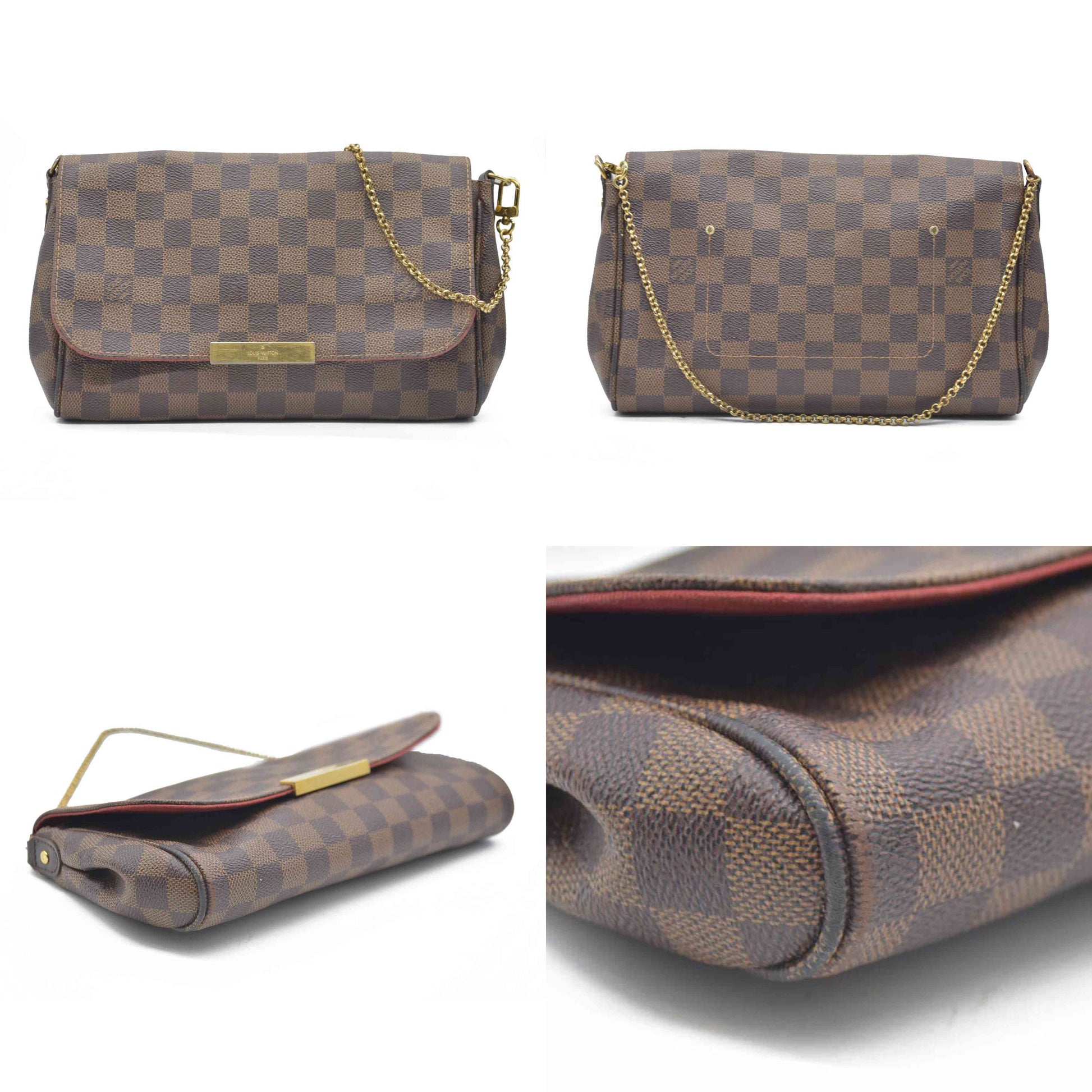 This is an authentic LOUIS VUITTON Damier Ebene Favorite MM. This chic crossbody is crafted of Louis Vuitton's signature Damier Ebene coated canvas. The bag features a short gold-tone chain strap, a removable leather shoulder strap, and a flap closure with a magnetic snap. The interior is lined with a soft textile and includes a flat pocket for small essentials.