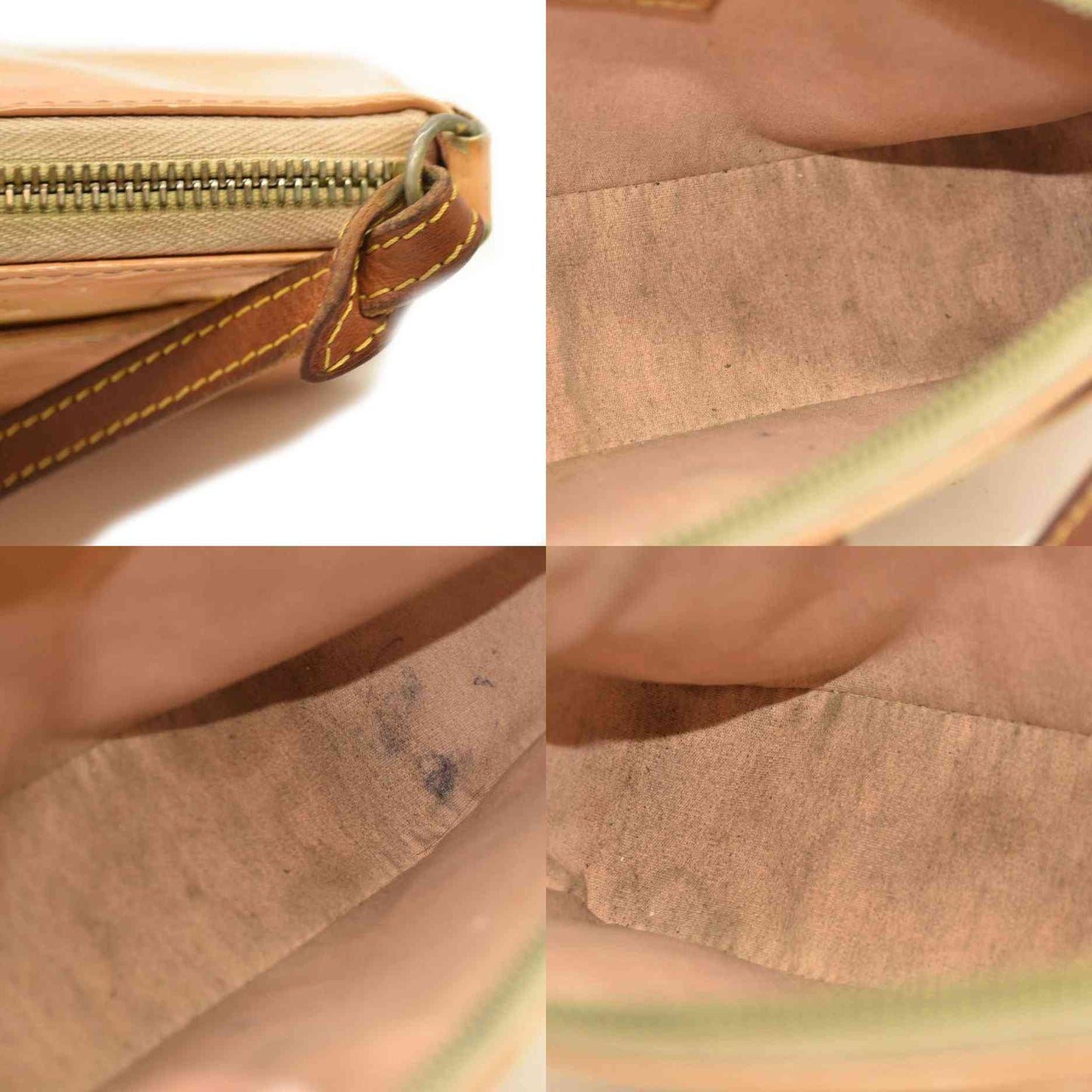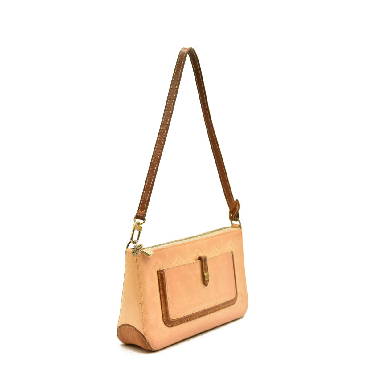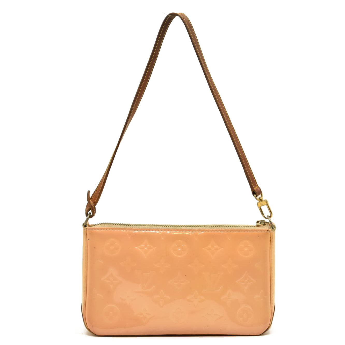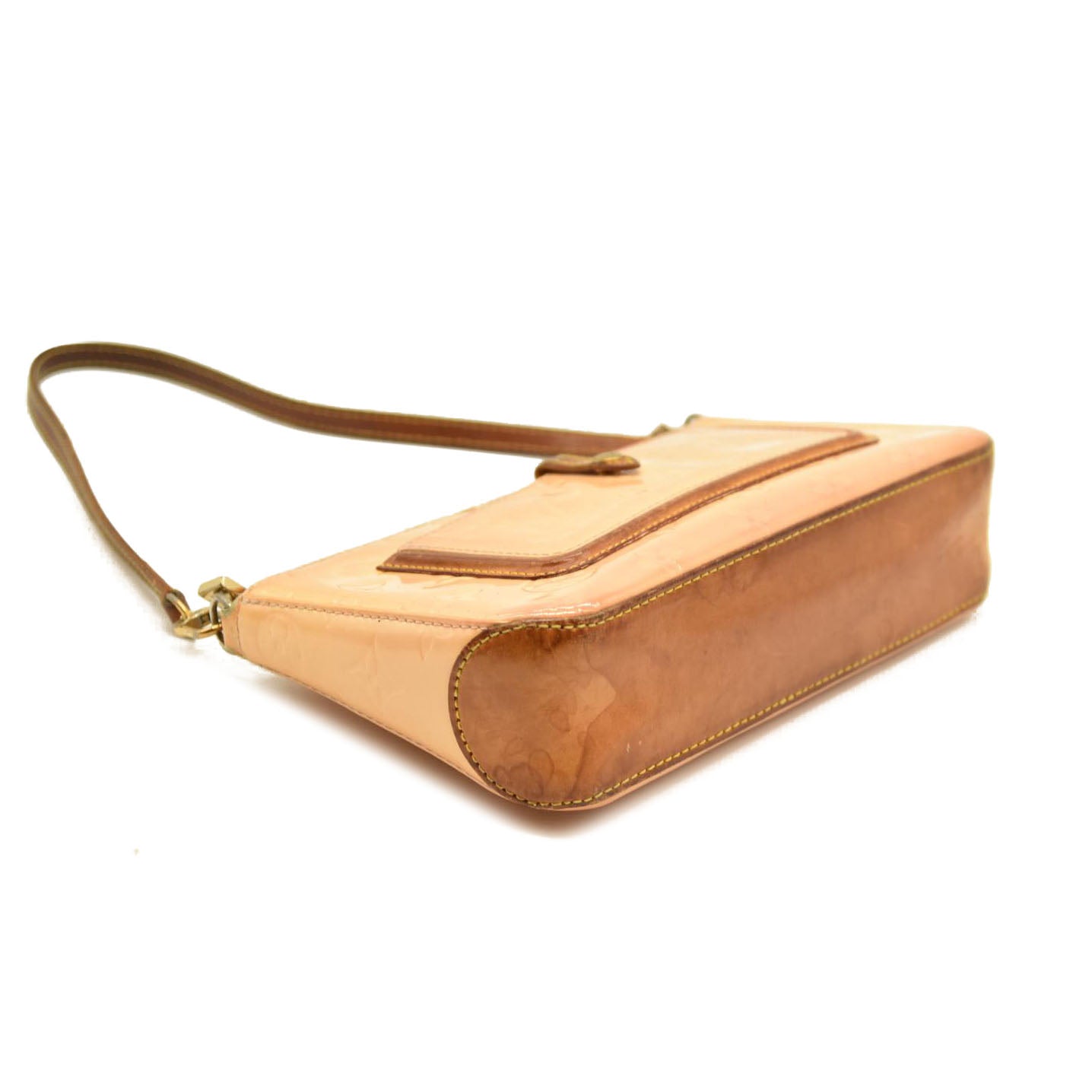 Square in Noisette. This chic baguette is crafted of Louis Vuitton monograph vernis patent leather in light beige. The bag features a looping vachetta leather end to end top handle with a D-ring clasp at one end, a front pocket and gold hardware. The bag features vachetta leather at the base sides and a facing flap with vachette trim. The top zipper opens to a pink fabric.