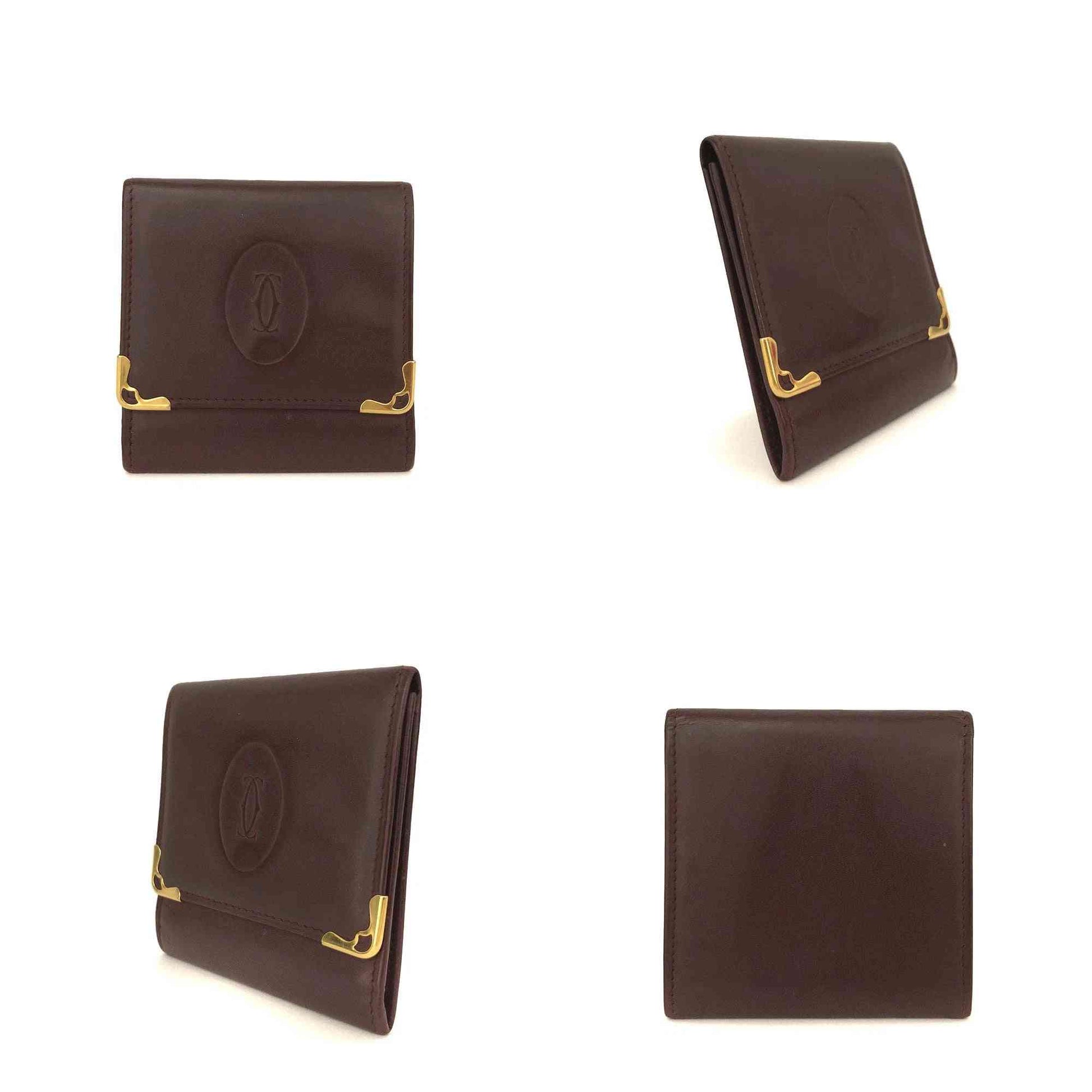 This is an authentic MUST de CARTIER Leather Coin Purse Wallet in Bordeaux. Crafted from rich bordeaux leather, this compact coin purse features a snap closure and is embossed with the iconic Cartier logo on the front. The interior is lined with smooth leather and includes a single compartment for coins or small essentials.