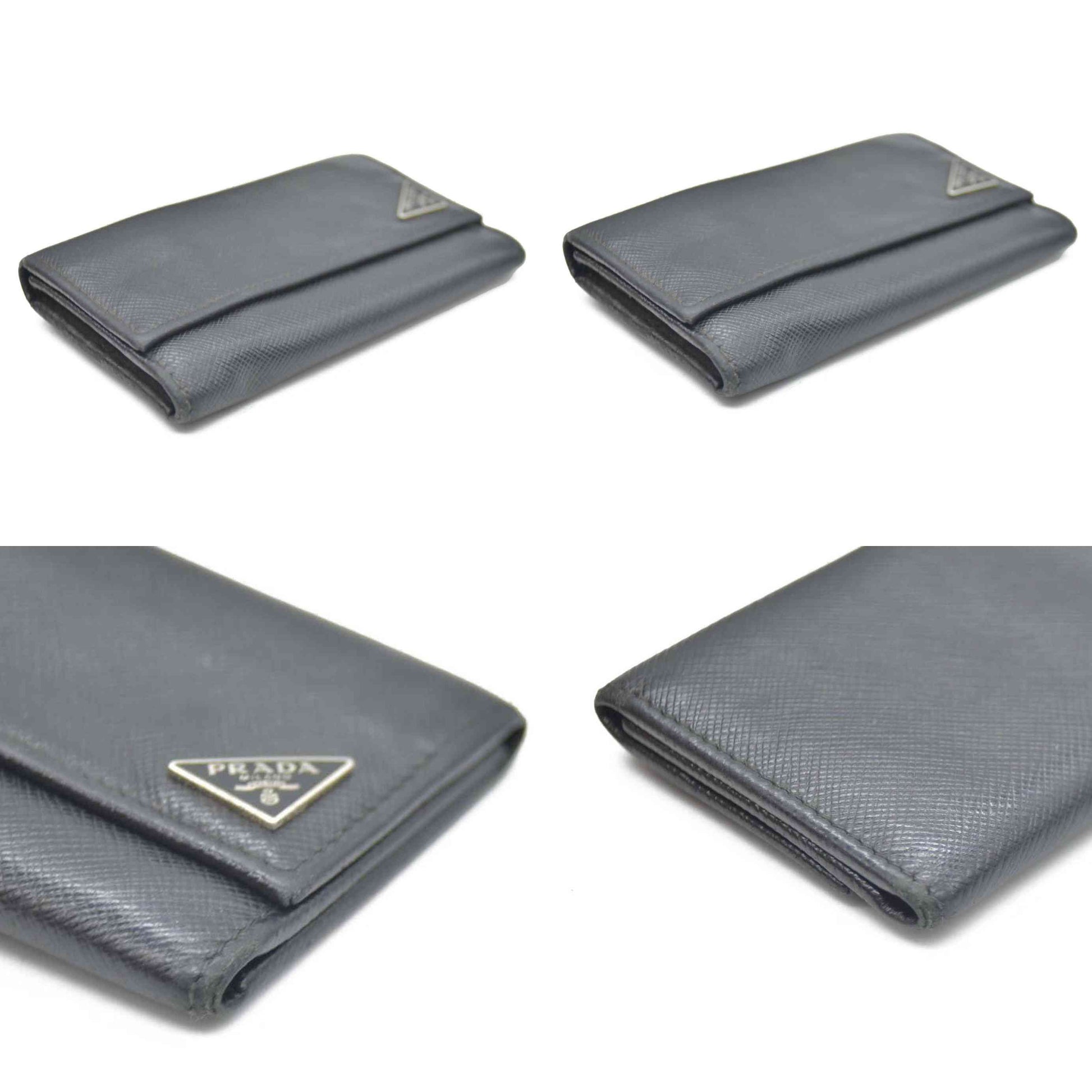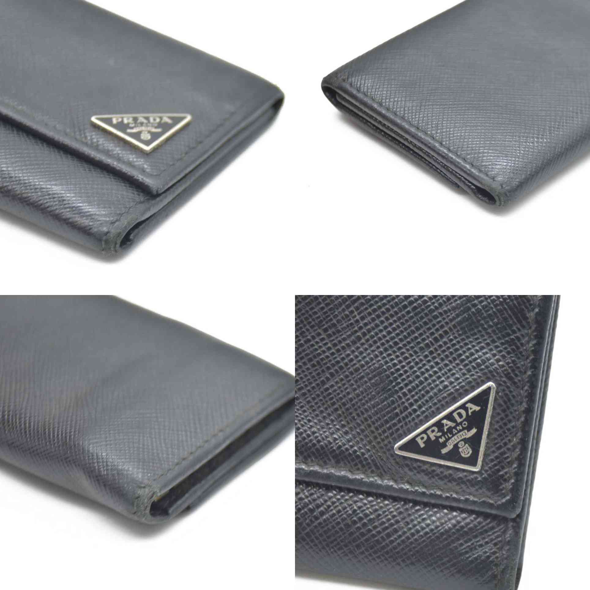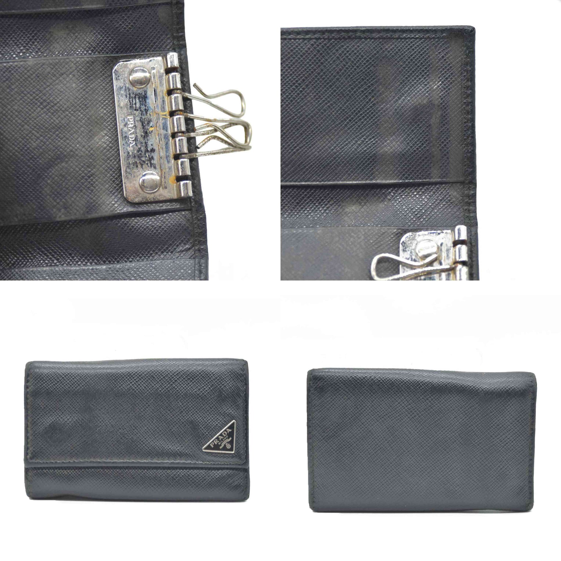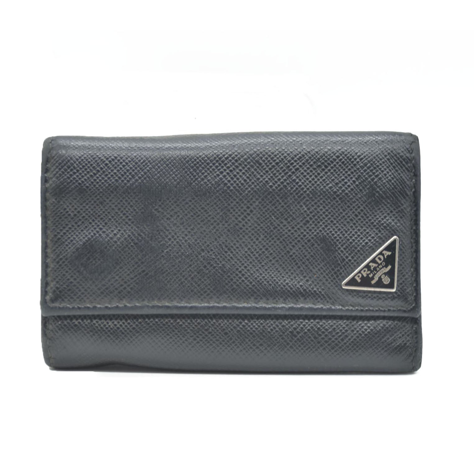PRADA Logo Plate Saffiano Leather 6 Ring Key Case Black