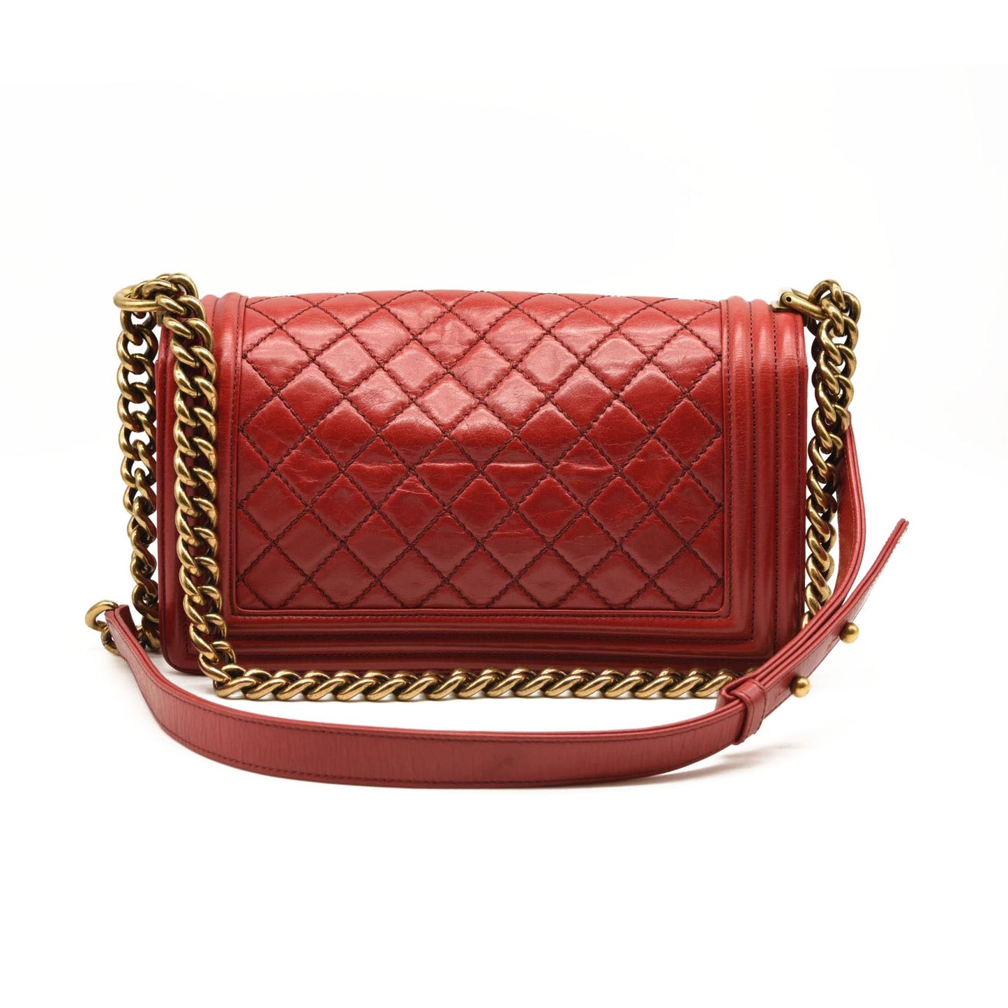 This is an authentic CHANEL Calfskin Double Stitch New Medium Boy Flap in Red. This chic cross body bag is crafted of calfskin leather with a double diamond stitch and a peripheral framed quilting in red. The bag features a ruthenium adjustable chain link shoulder strap with a shoulder pad and ruthenium hardware including a boy CC push lock. This bag opens to a grey fabric interior with a patch pocket.