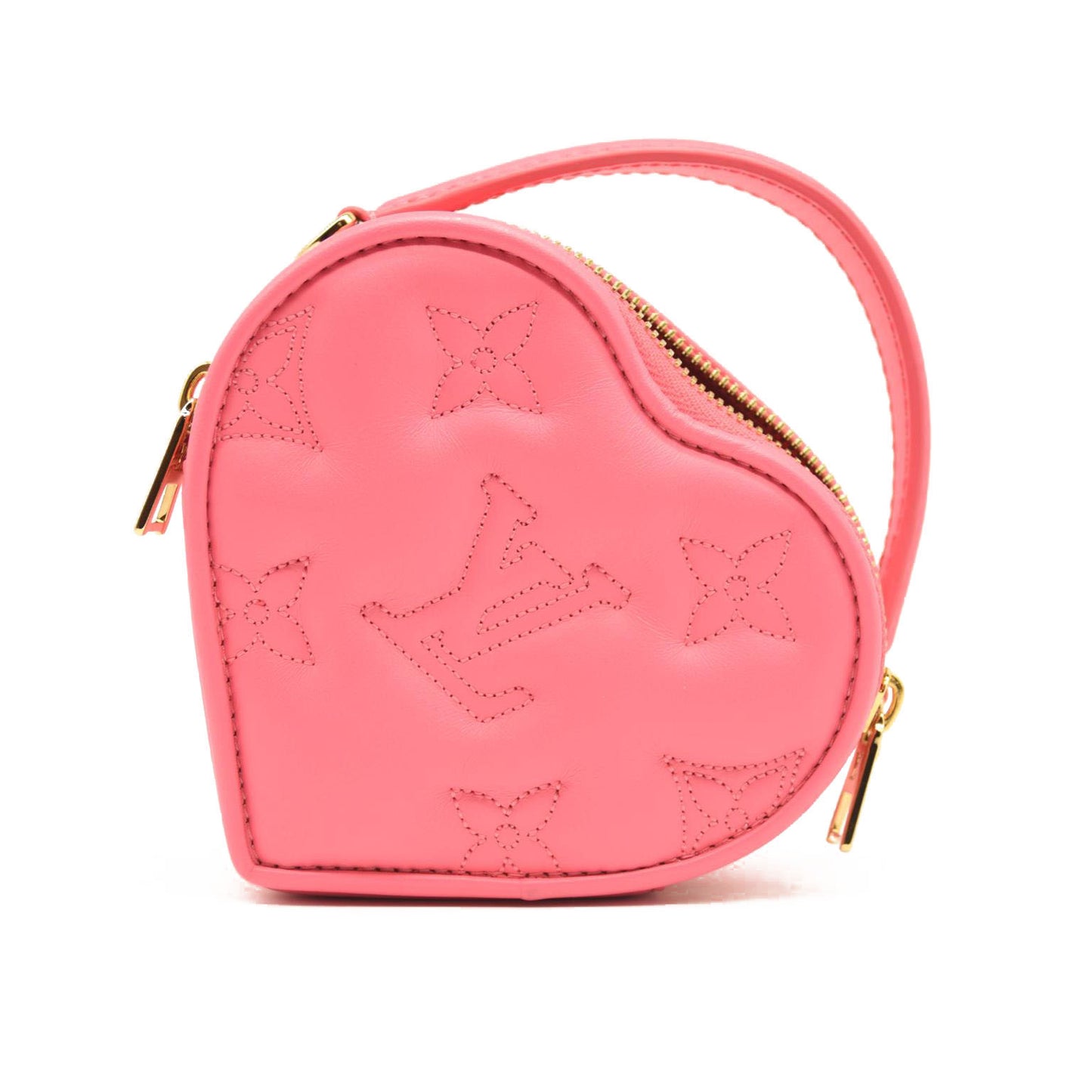 This is an authentic LOUIS VUITTON Calfskin Embroidered Monogram Pop My Heart Bag Pouch in Pink. This chic heart shaped handbag is crafted of pink calfskin embossed with the Louis Vuitton monogram icons. The bag features a removable gold chain link shoulder strap. The handbag opens to a compact pink microfiber interior.