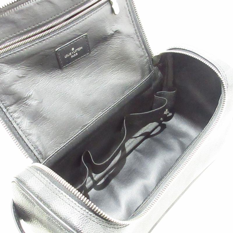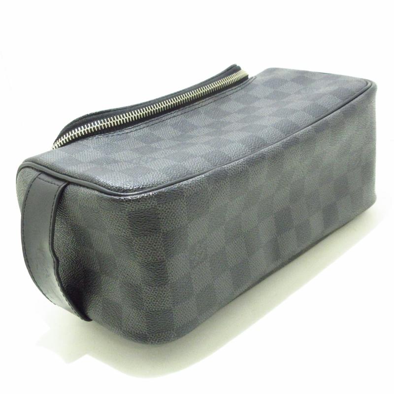 This is an authentic LOUIS VUITTON Damier Graphite Toiletry Pouch. This functional toiletry pouch from Louis Vuitton crafted of sturdy black and gray damier patterned coated canvas. This piece features a side strap and polished silver hardware. This pouch opens to a black leather interior with a zipper pocket and elastics to hold your travel essentials.