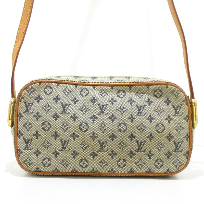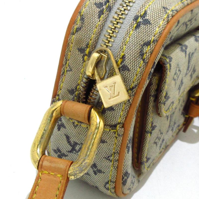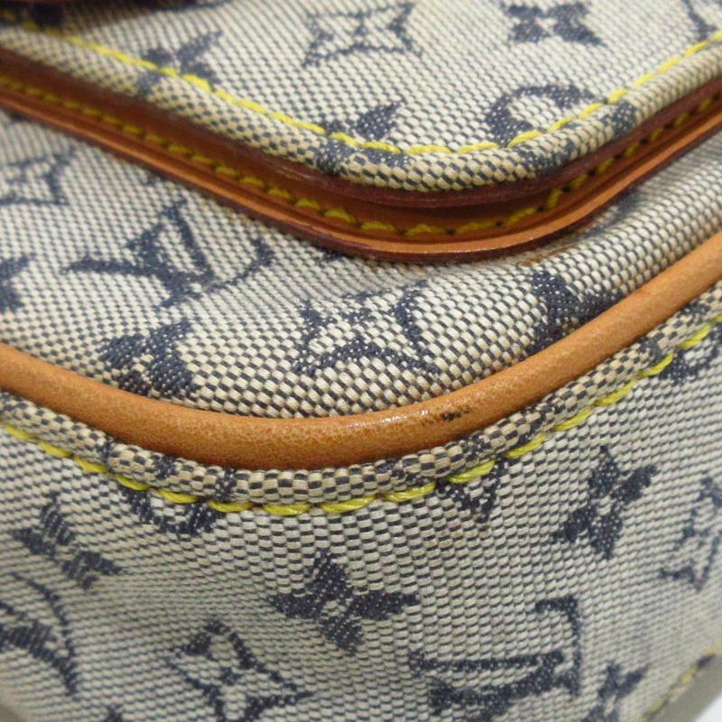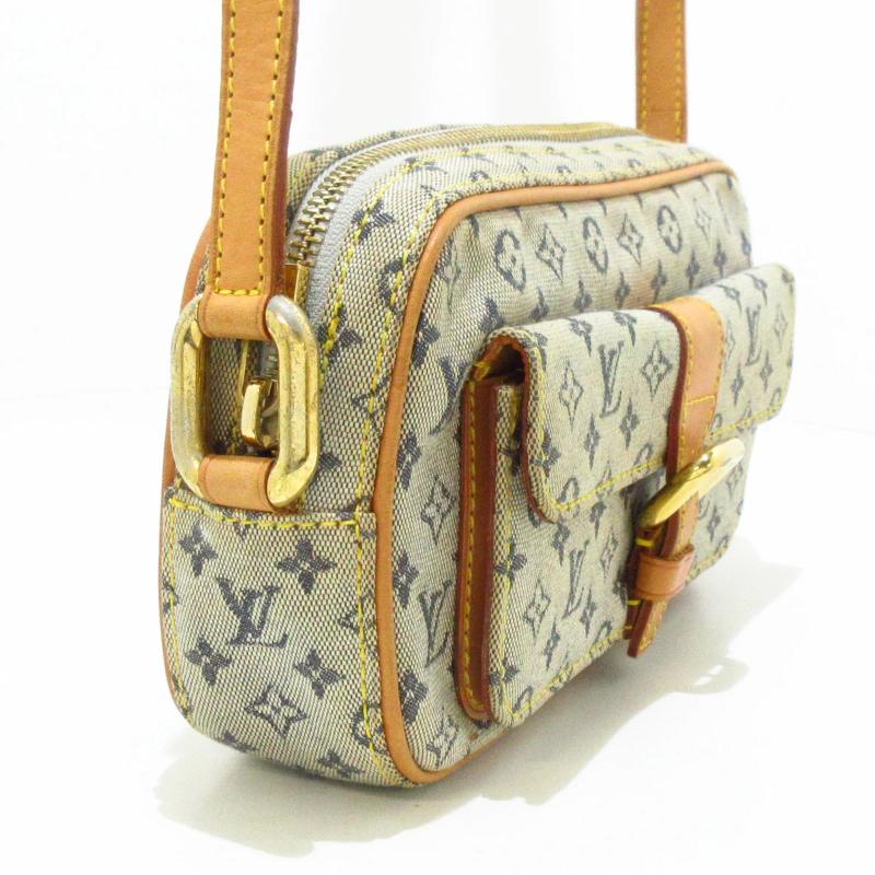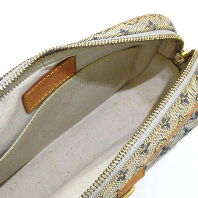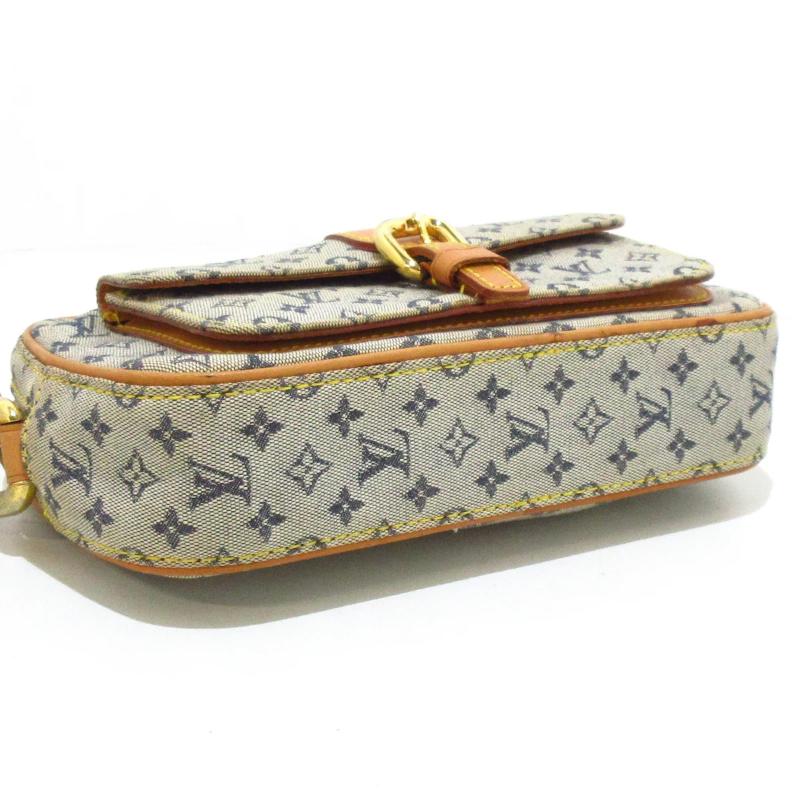This is an authentic LOUIS VUITTON Mini Monogram Juliette in Blue. This is a charming shoulder bag is crafted of blue mini monogram on light blue denim canvas. It features a large frontal pocket with a vertical leather strap. There is a long adjustable shoulder strap allowing this bag to be worn low at the waist for a very chic look. The hardware is brass including strap rings and a buckle and a prominent buckle for the front pocket. The interior is a light fabric with a patch pocket. This is a versatile and chic bag with the luxury and style of Louis Vuitton!