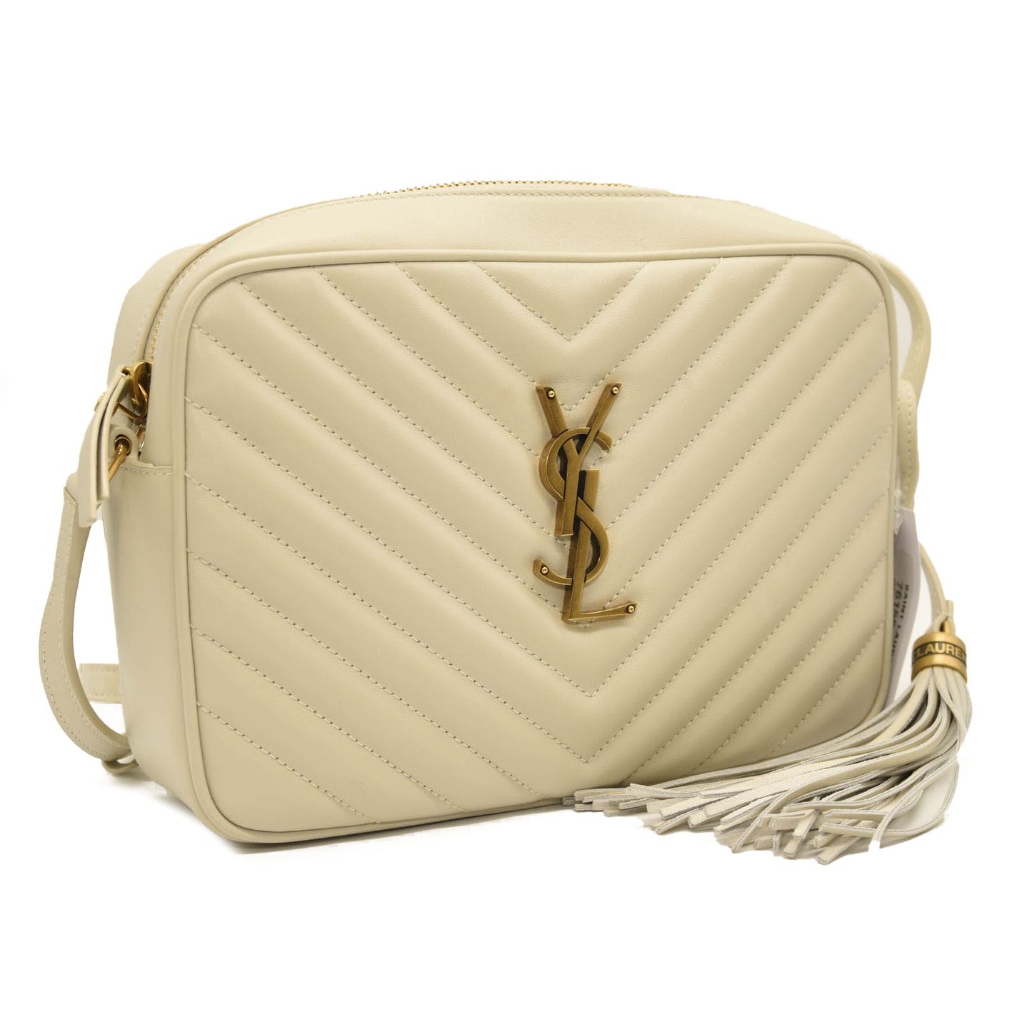 This is an authentic SAINT LAURENT Calfskin Matelasse Monogram Lou Camera Bag in Crema Soft. This chic shoulder bag is crafted of chevron-quilted calfskin leather in off white. The bag features an adjustable shoulder strap with aged gold hardware and a removable tassel. The top zipper opens the bag to a compact black fabric interior with a patch pocket.