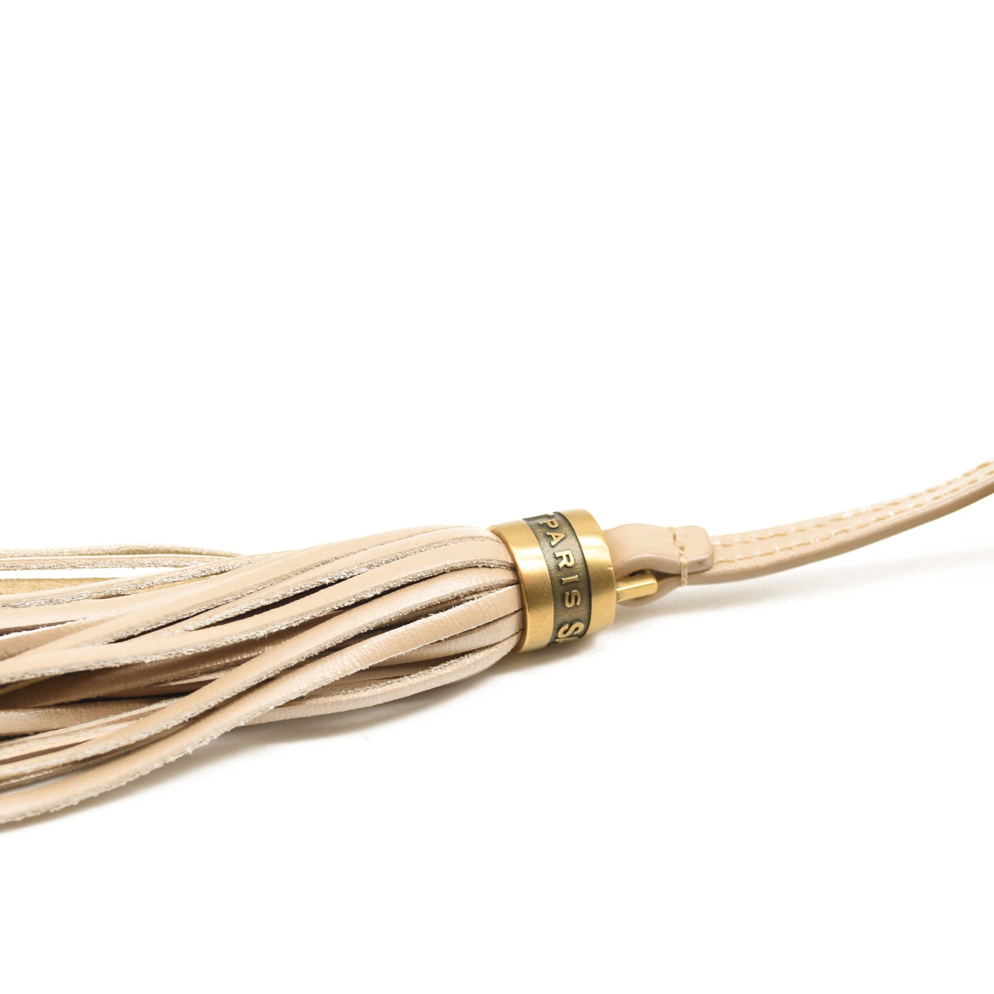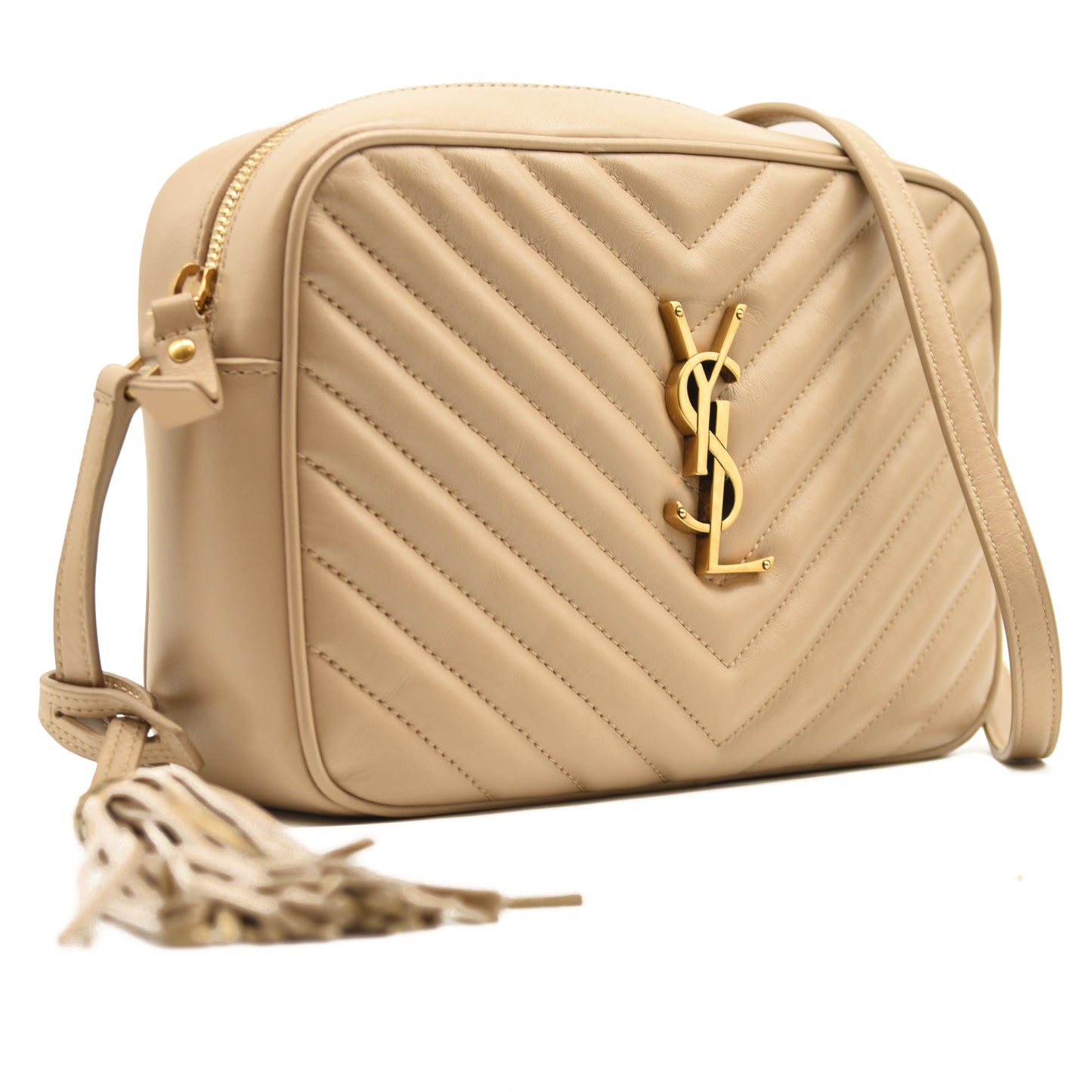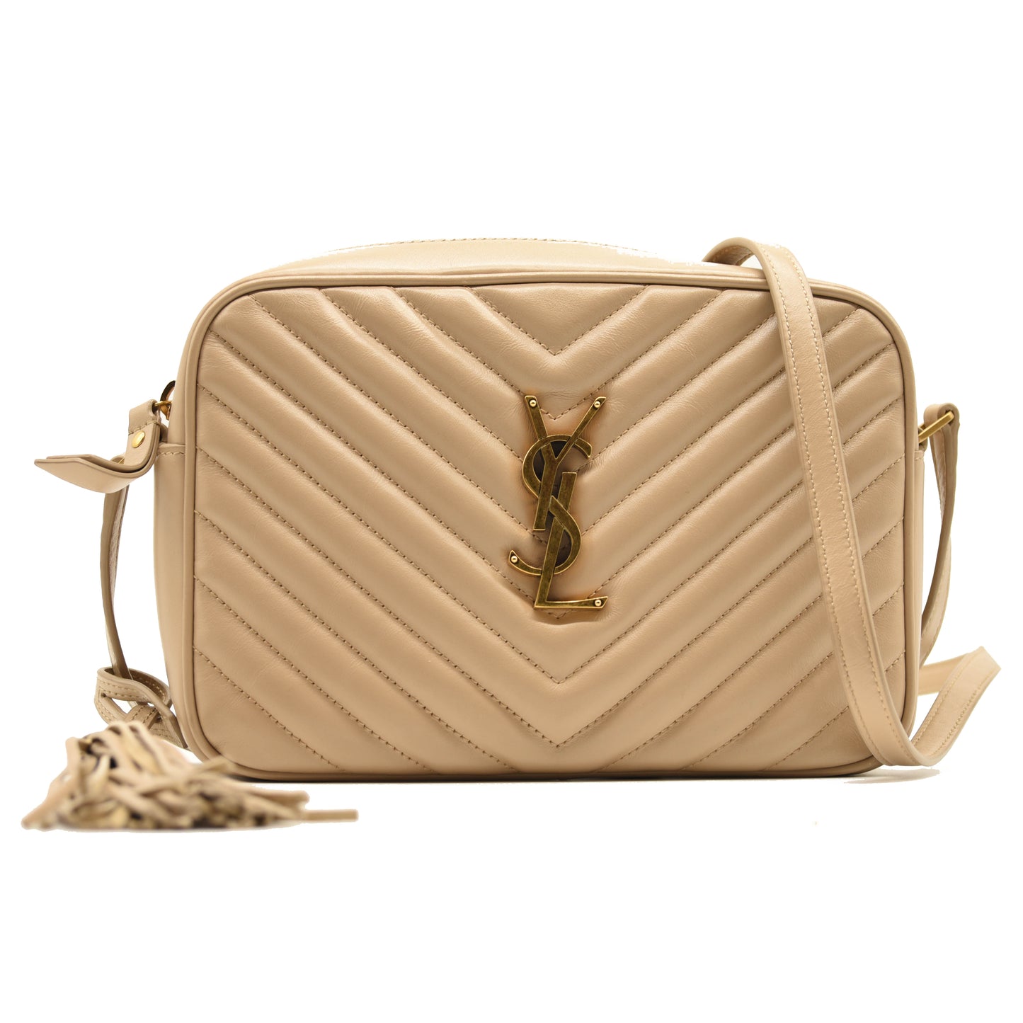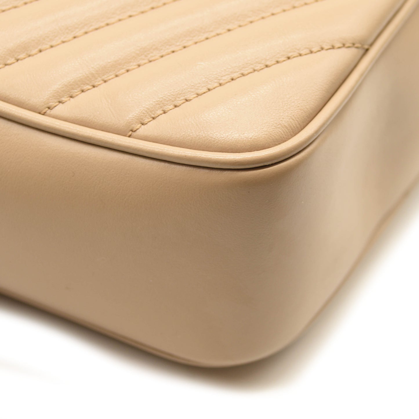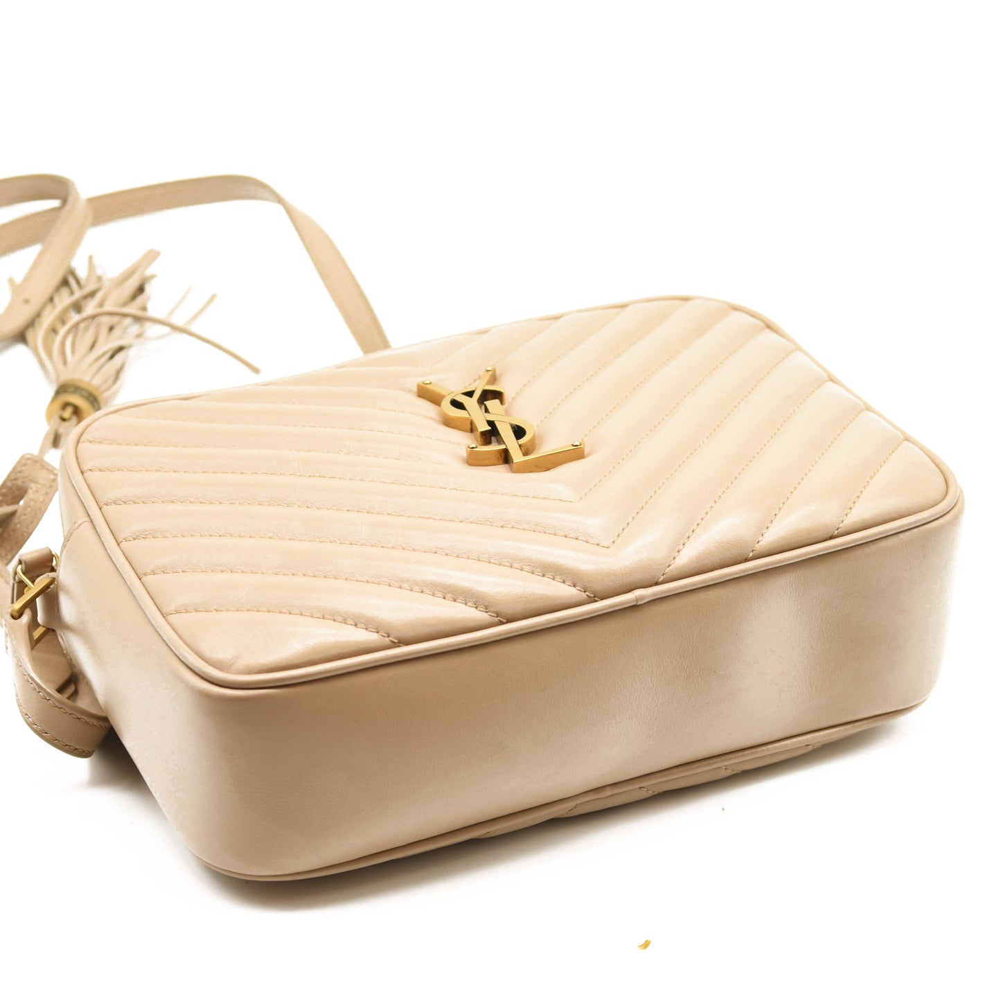 This is an authentic SAINT LAURENT Calfskin Matelasse Monogram Lou Camera Bag in Nude Powder. This chic shoulder bag is crafted of chevron-quilted calfskin leather in beige. The bag features an adjustable shoulder strap with aged gold hardware and a removable tassel. The top zipper opens the bag to a compact black fabric interior with a patch pocket.