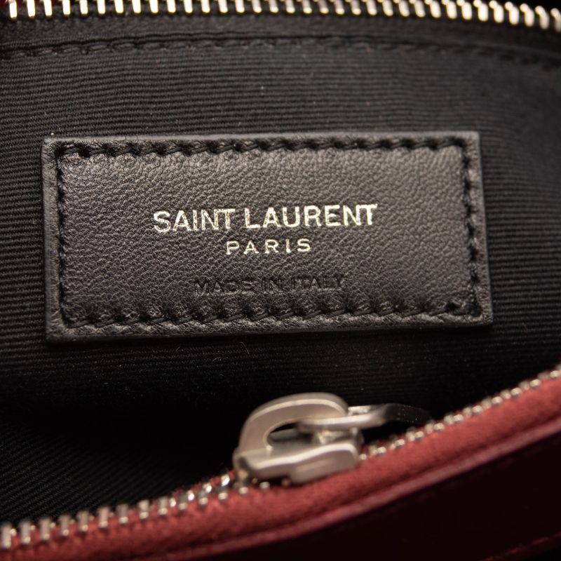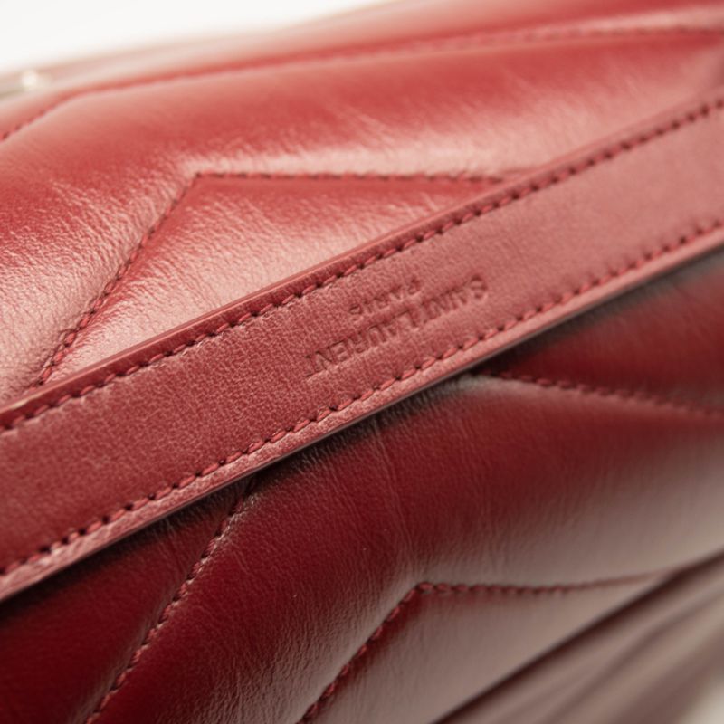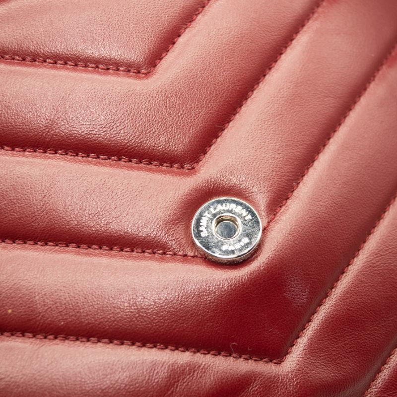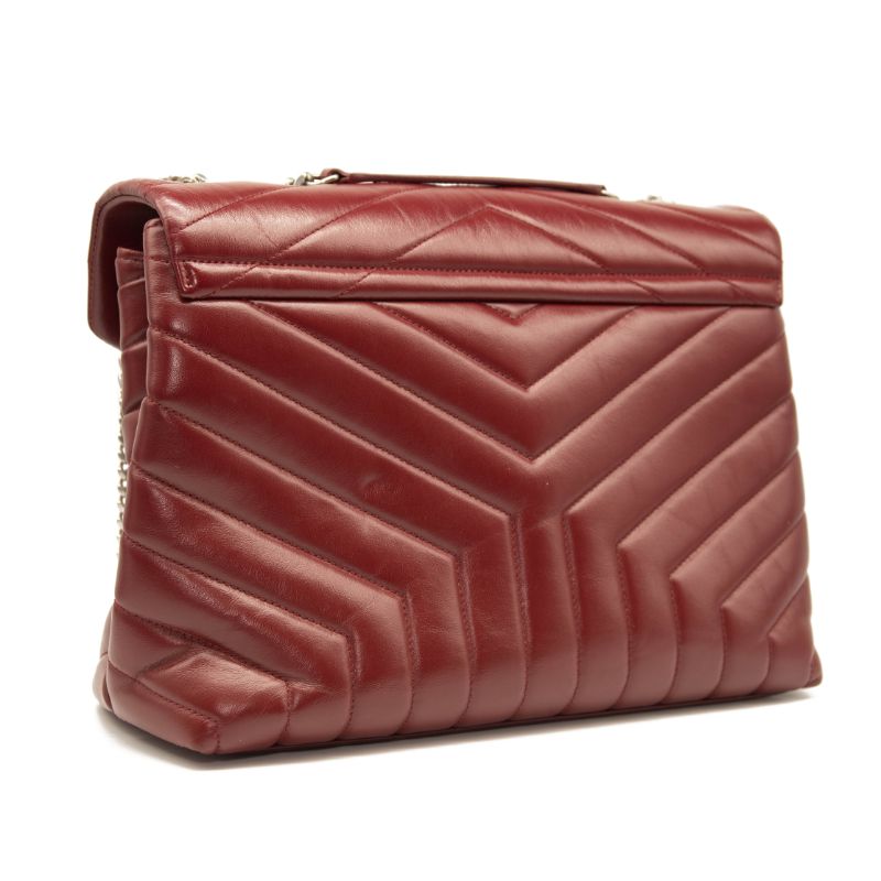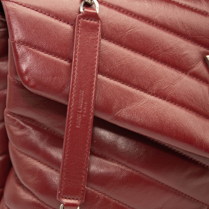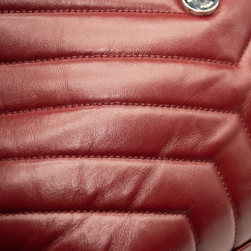 This is an authentic SAINT LAURENT Calfskin Y Quilted Monogram Medium Loulou Chain Satchel in Palissandre. This elegant shoulder tote features chic chevron quilted calfskin leather in burgundy. The bag has silver chain-link shoulder straps with matching leather shoulder pads. The frontal flap features a prominent silver YSL monogram detail and opens to a partitioned black fabric interior with zippered pockets.